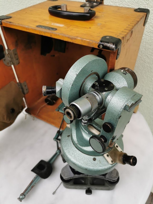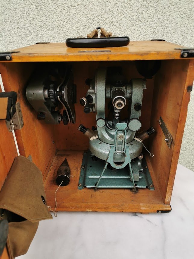 Teodolitas medinėje dėžėje. Veikiantis. Kaina 117
