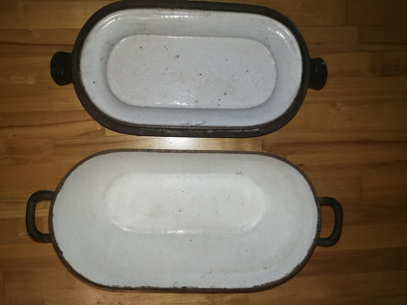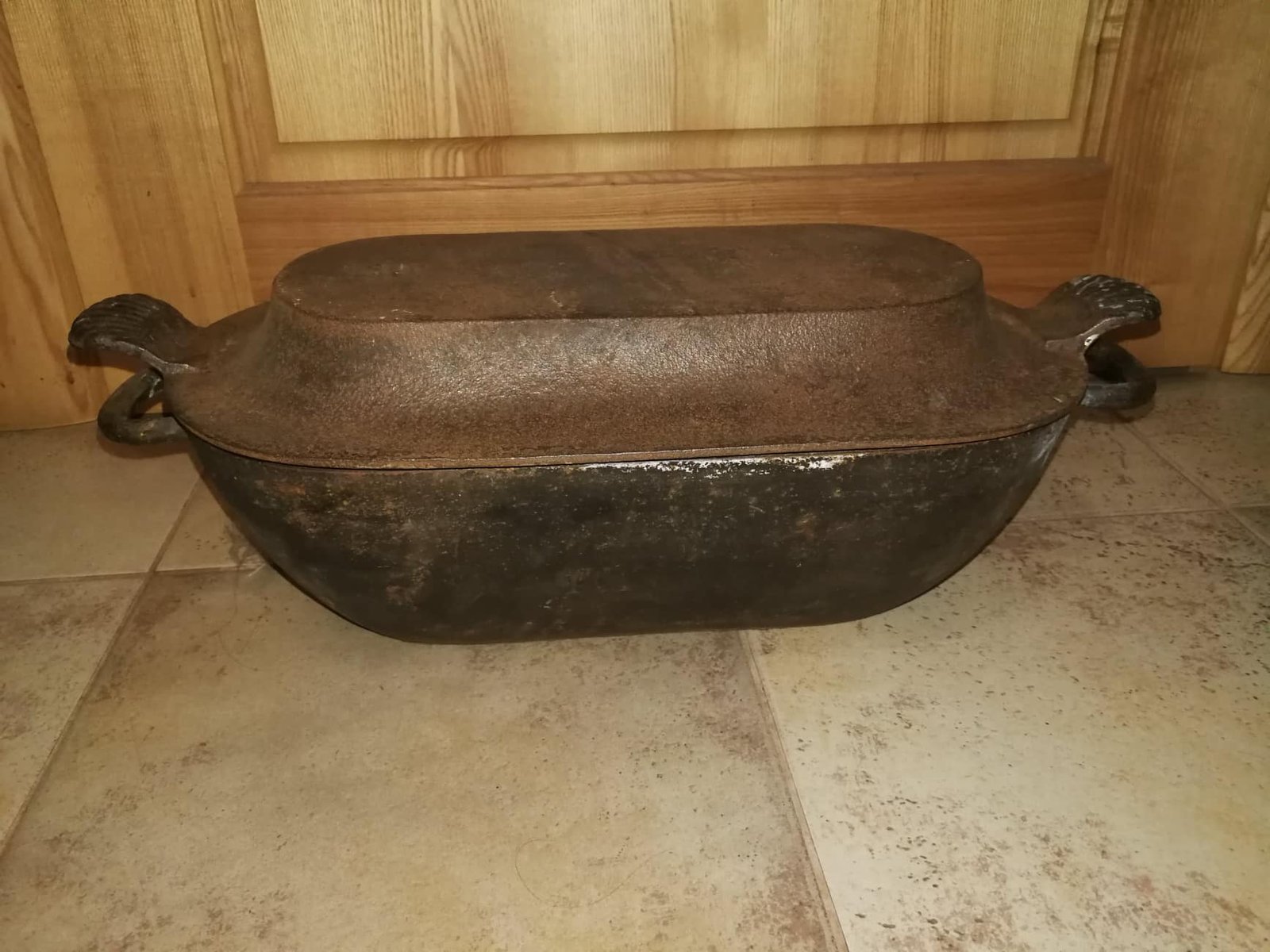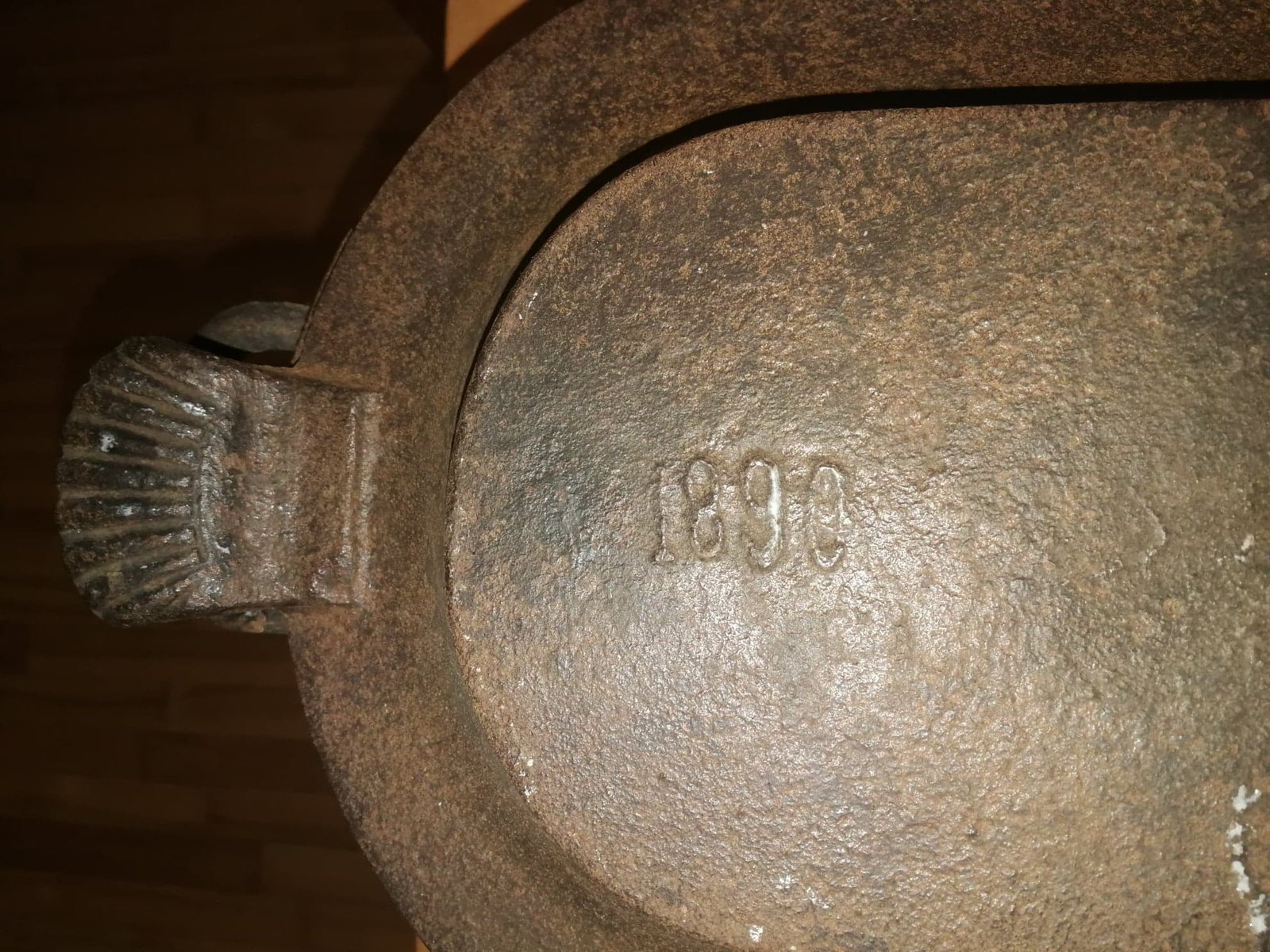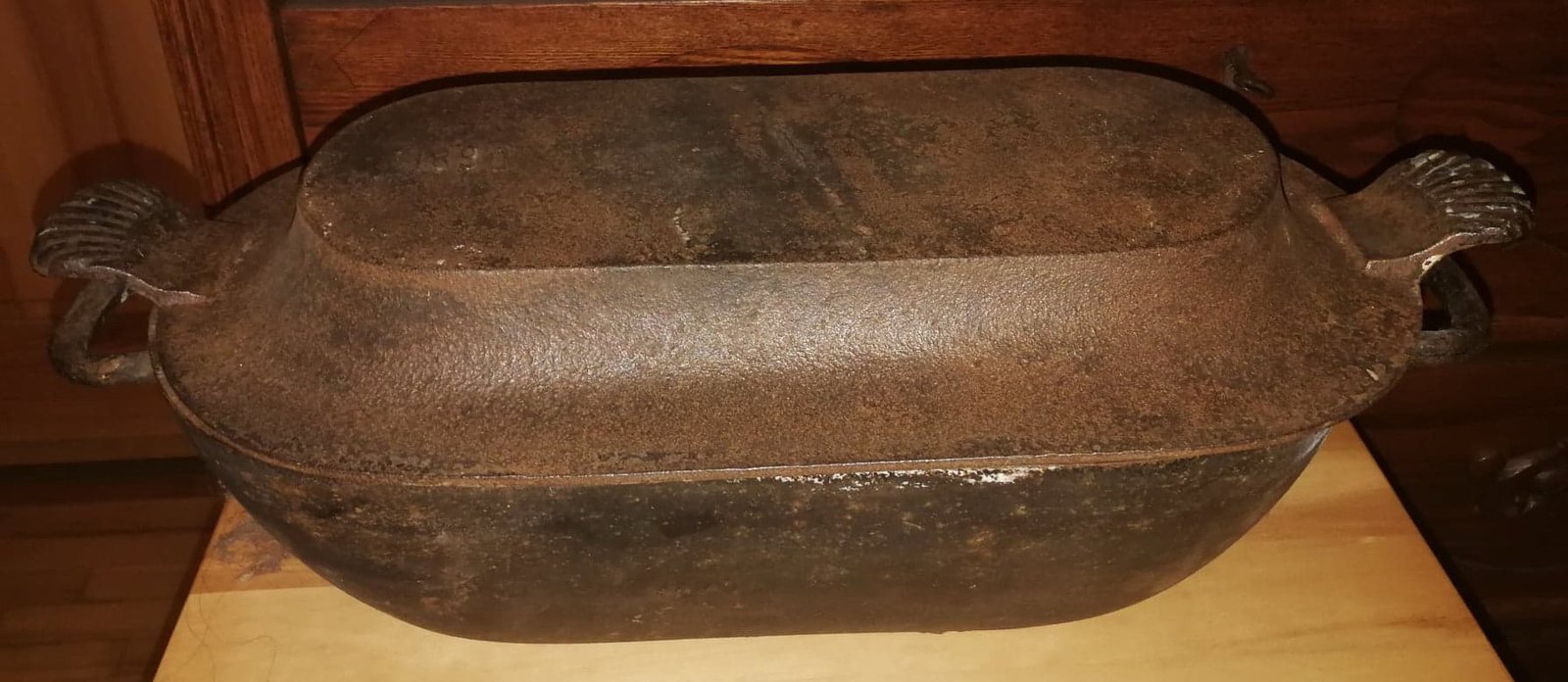Troškintuvas ketaus (špižinis), Vidus geros būklės, neištrupėjęs. Ilgis su rankenomis 52, plotis 25 cm. aukštis 20 cm. Svoris 9,6 kg. Galimai pagamintas 1890 m. Kaina 72