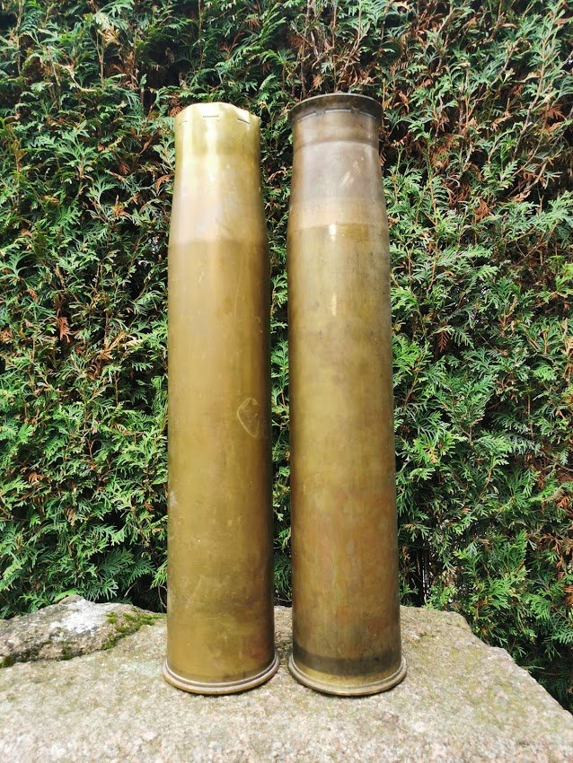 Tūta, tūtelė, gilzė žalvarinė, tuščia. Aukštis 60 cm., skersmuo 13 cm. 2 vnt. Kaina po 82