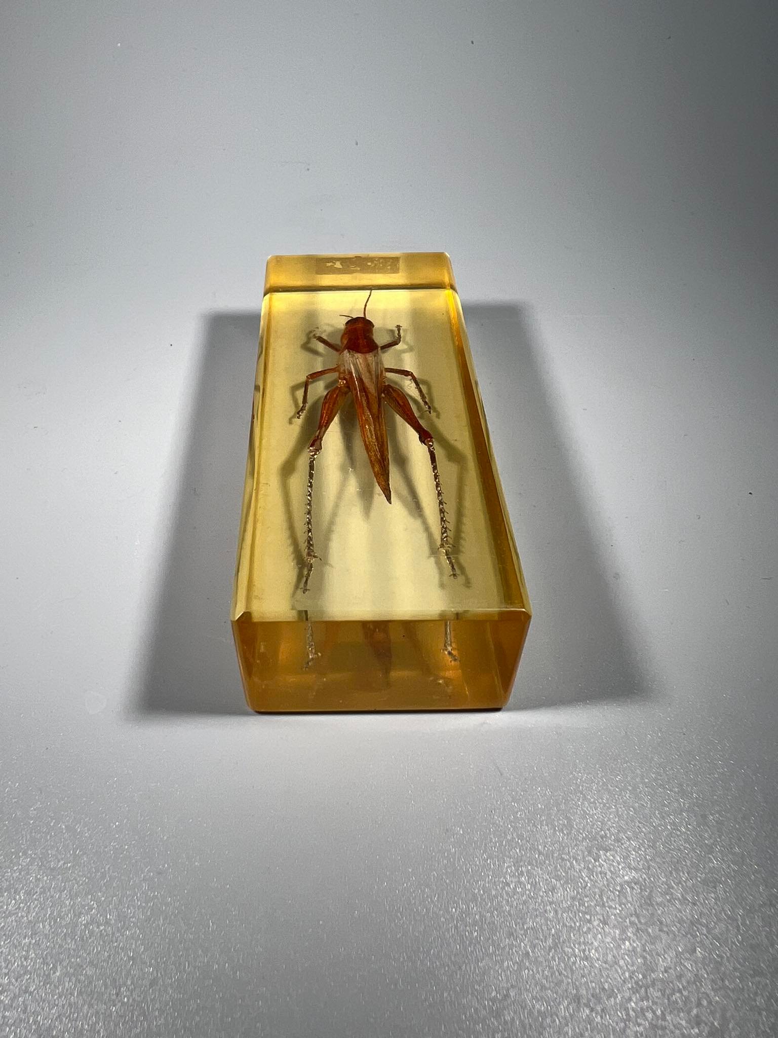 Vabzdys, vabalas, žiogas stikle (skaidrioje dervoje), kolekcinis. Dydis: 3 x 4,5 x 11 cm. Kaina 26