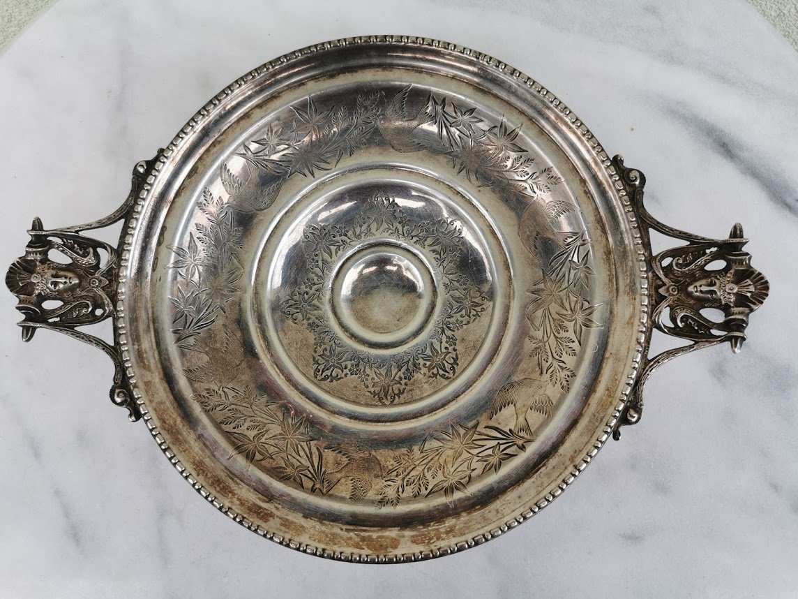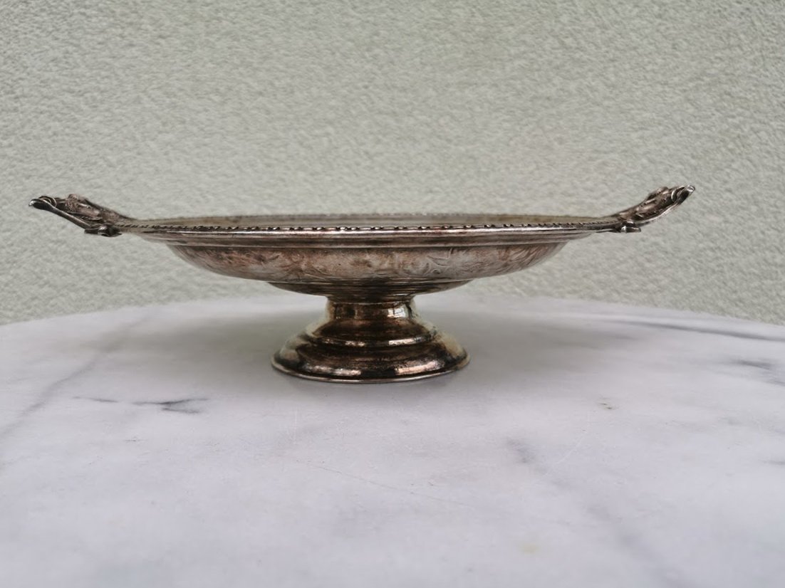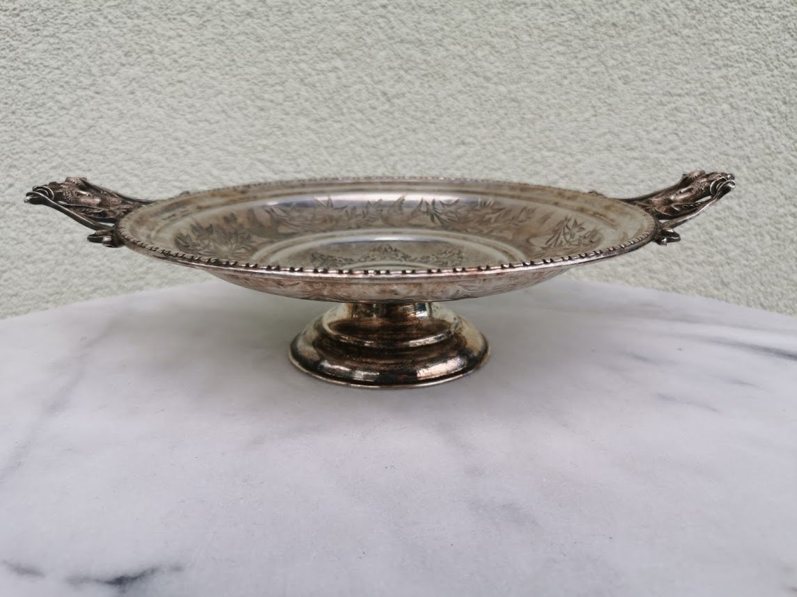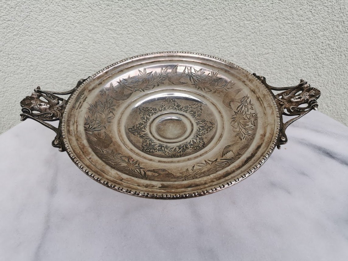 Vaisinė, saldaininė antikvarinė, sidabruota. Skersmuo be rankenų 24, aukštis 8 cm. Kaina 63