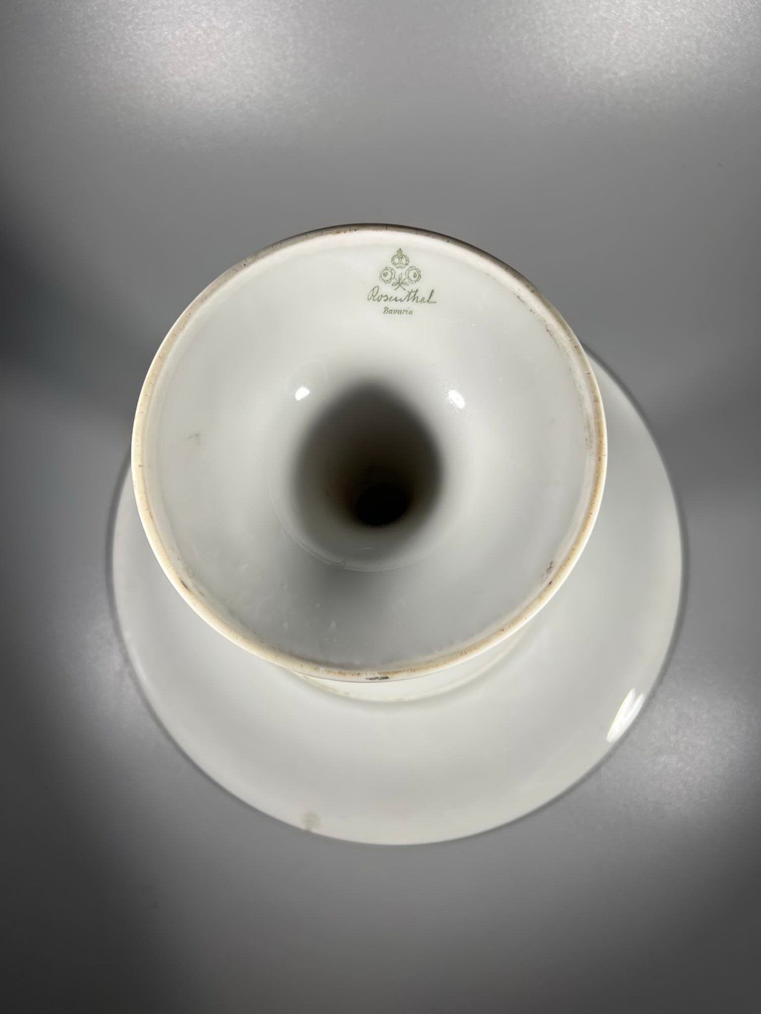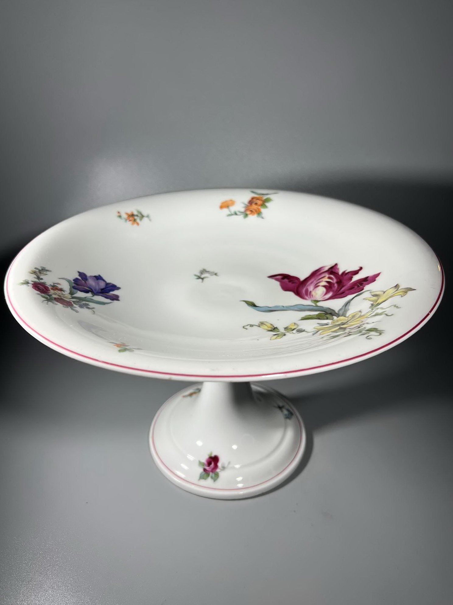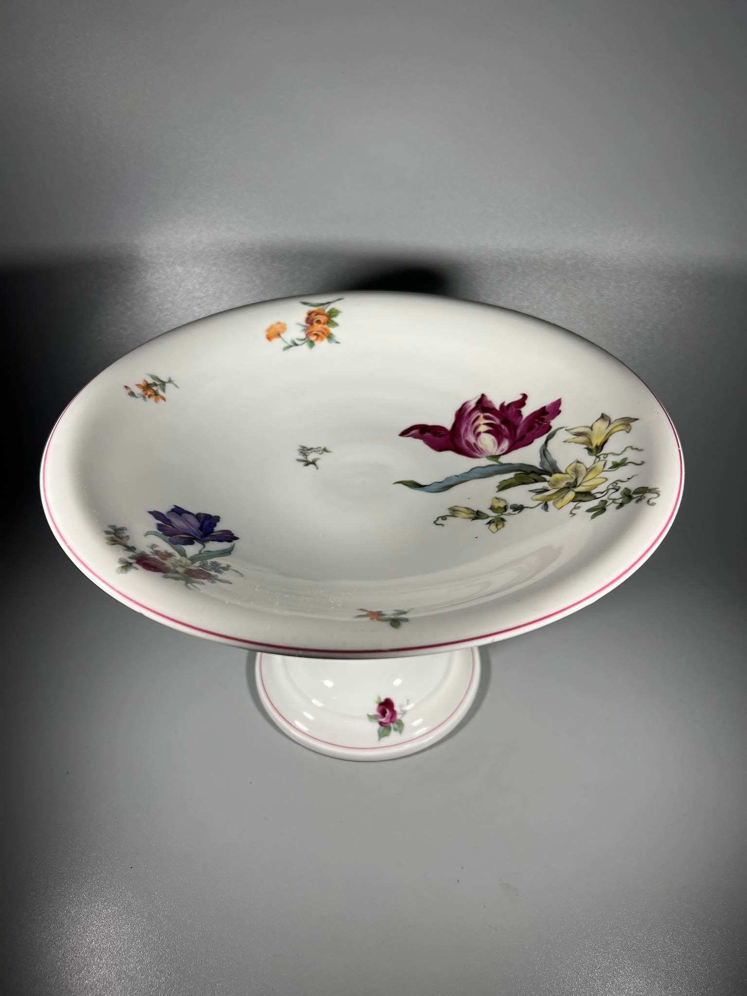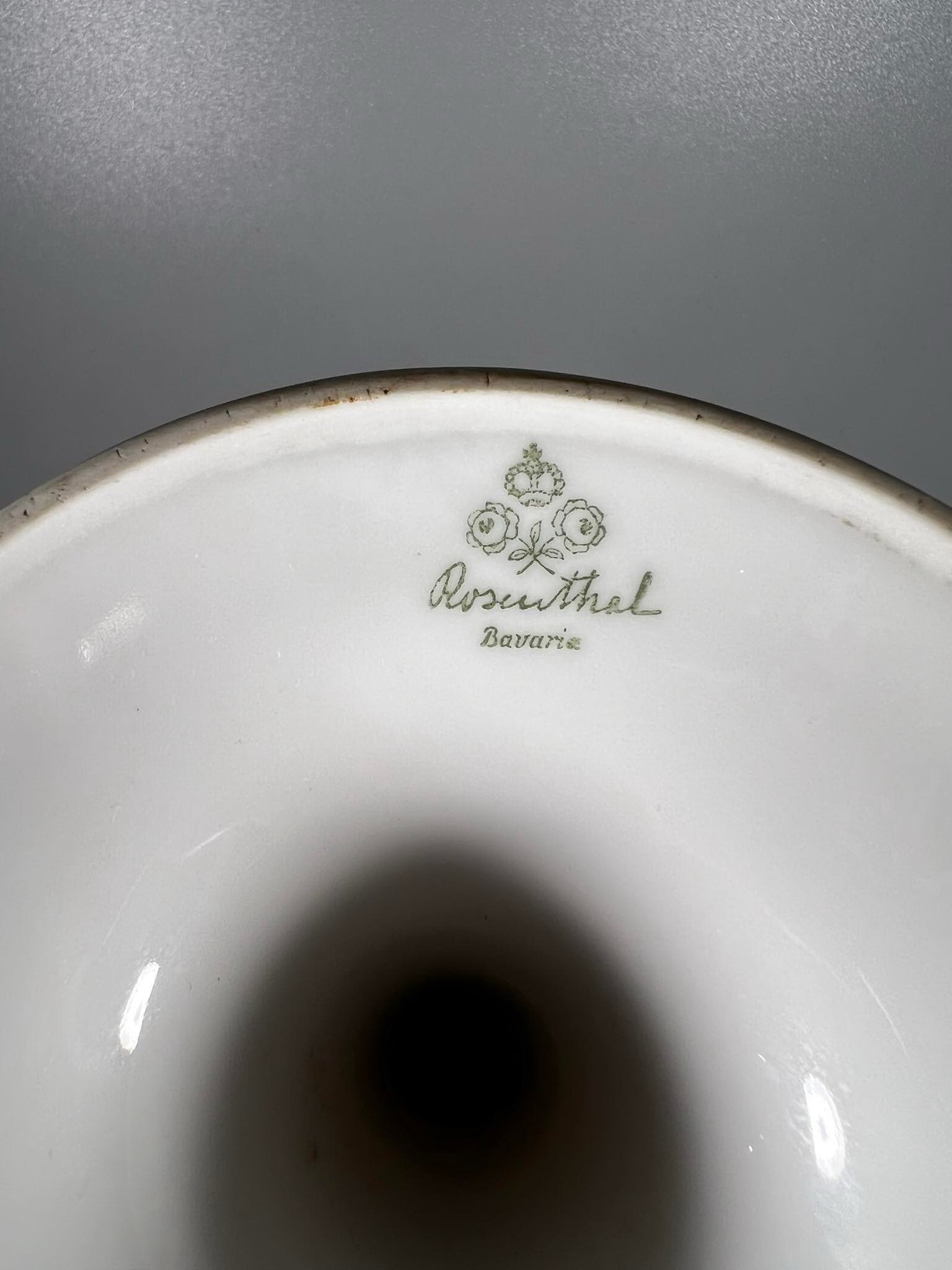 Vaisinė, saldaininė porcelianinė Rosenthal, antikvarinė. Pagaminta 1919-1936 m. (1919-1935 Ph. Rosenthal & Co Green Underglaze). Aukštis 16, skersmuo 26 cm. Nedidelis, smulkus defektas. Kaina 88