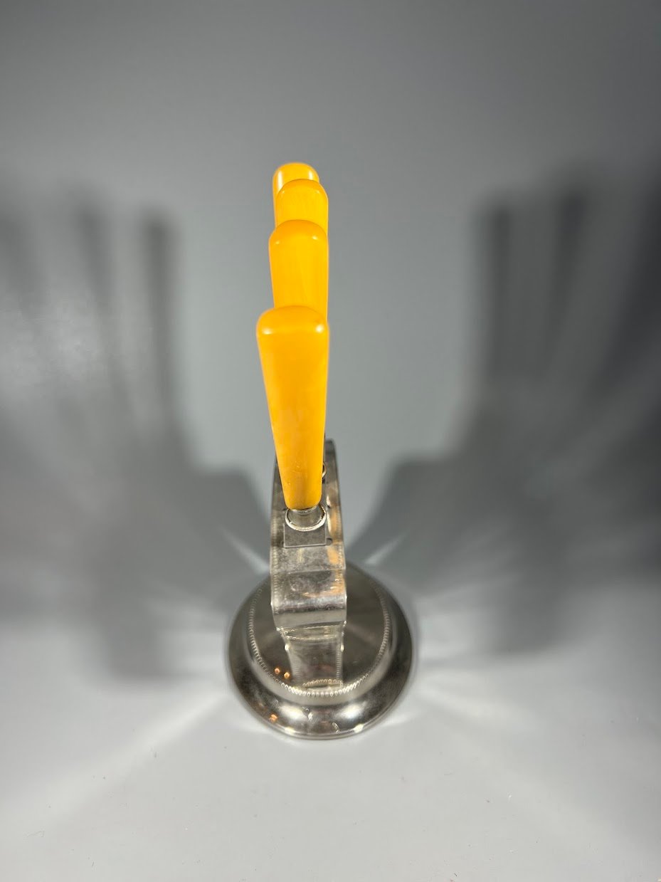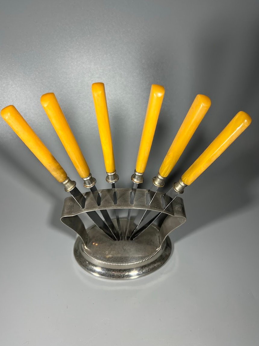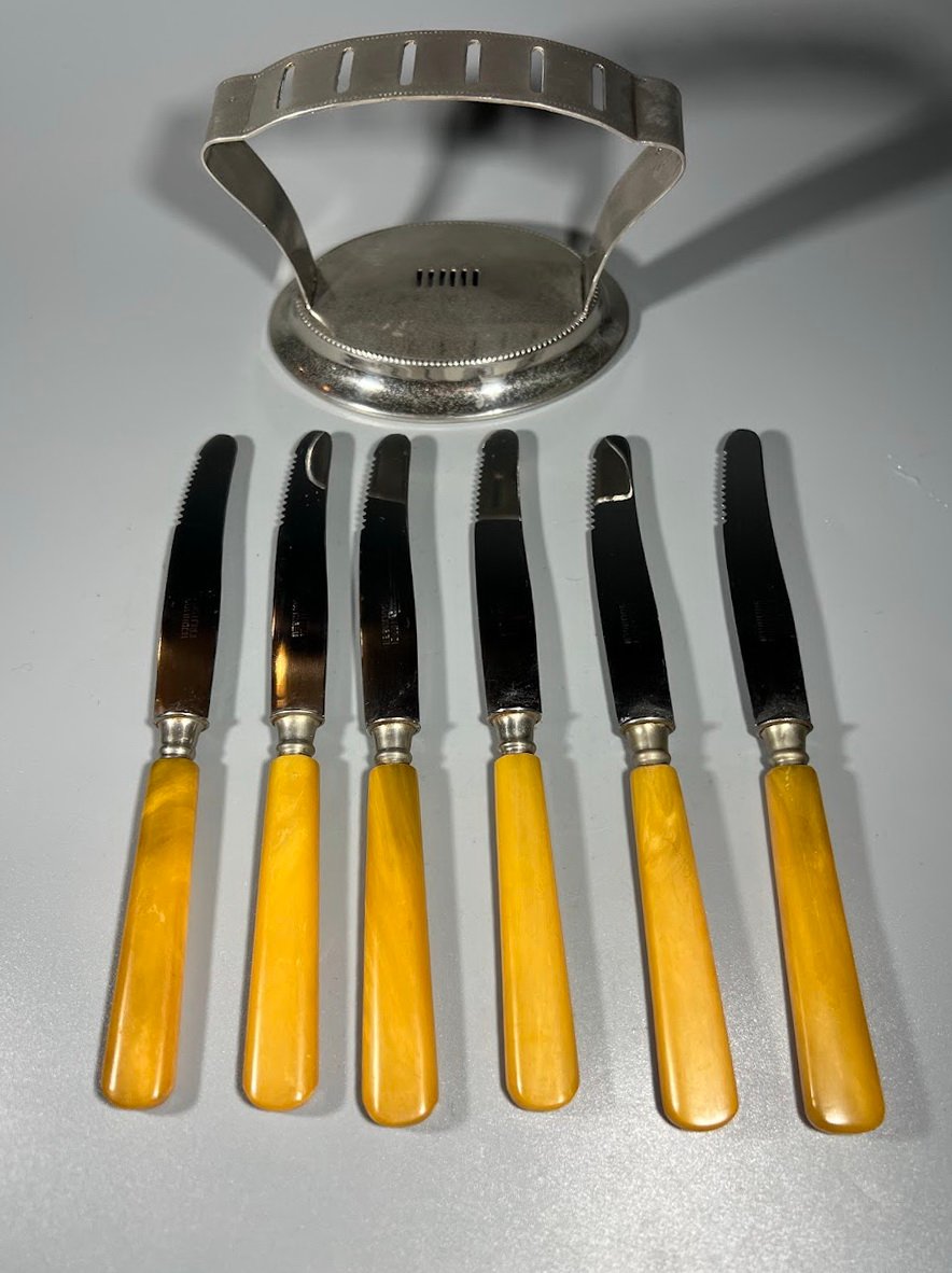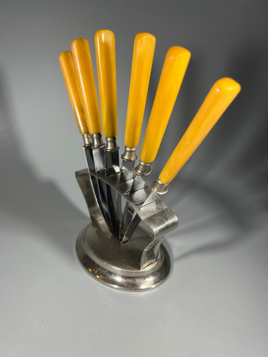 Vaisių peilių rinkinys su stovu, antikvarinis, Art Deco stiliaus, 6 peiliai vaisiams. Kaina 58