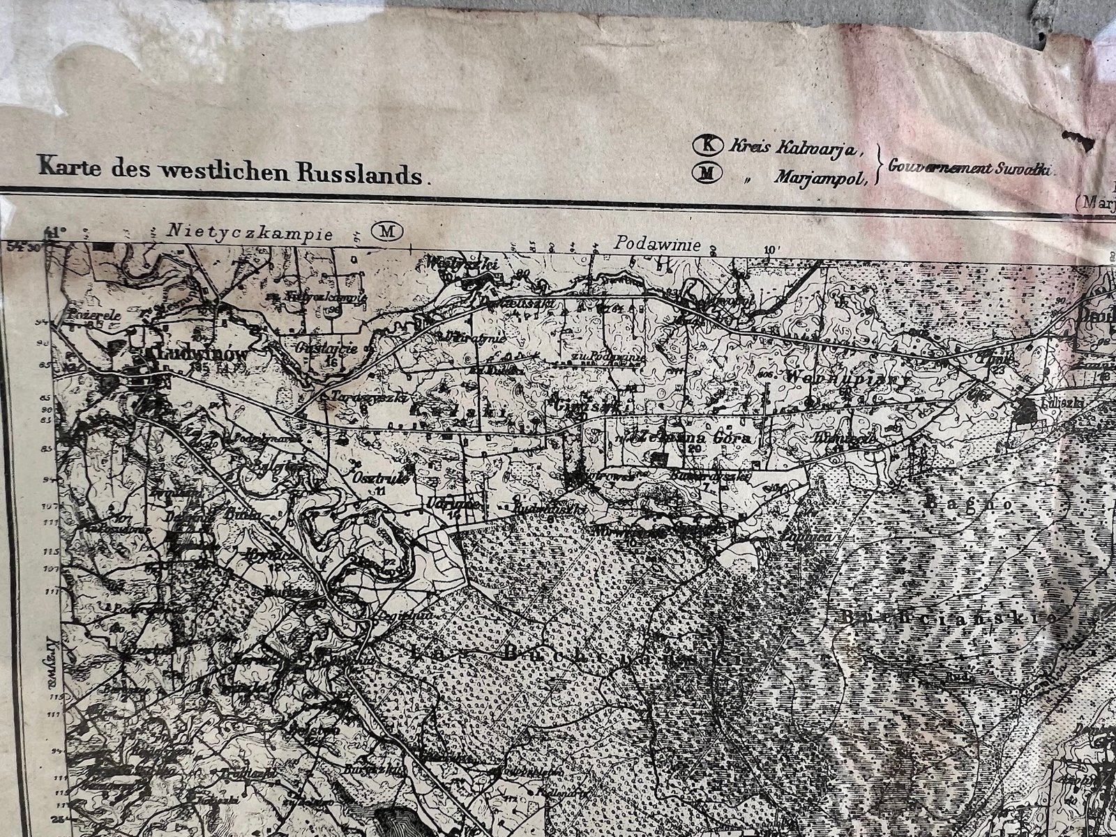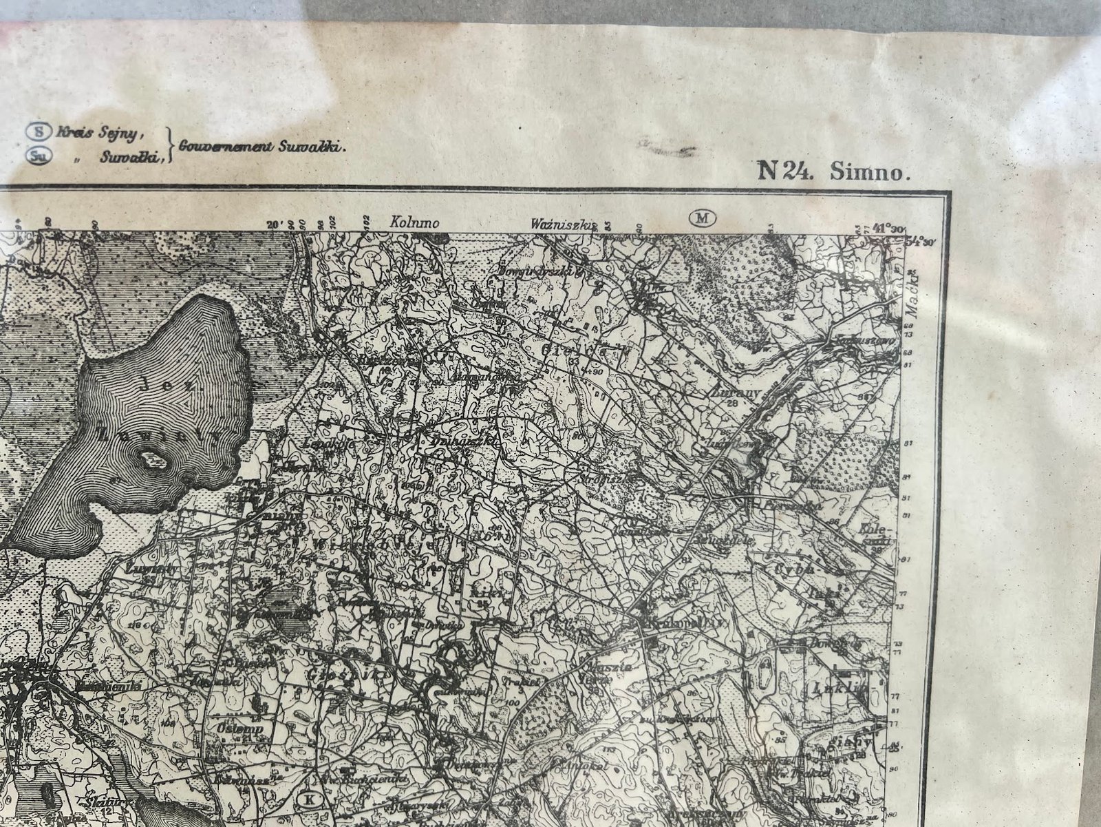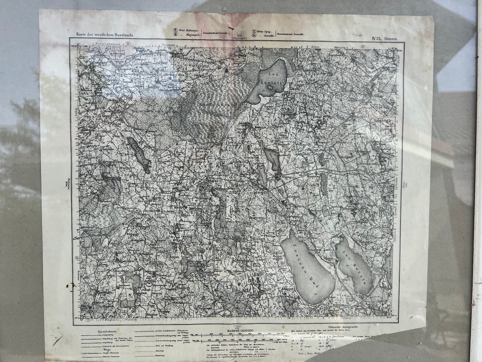 Vakarų Rusijos žemėlapis, vok. Karte des westlichen Russlands, N24 lapas, vaizduojantis Simną ir jo apylinkes. 1915 m. Išorinis rėmo dydis 45 x 55 cm. Žemėlapio dydis 33 x 40 cm. Kaina 68