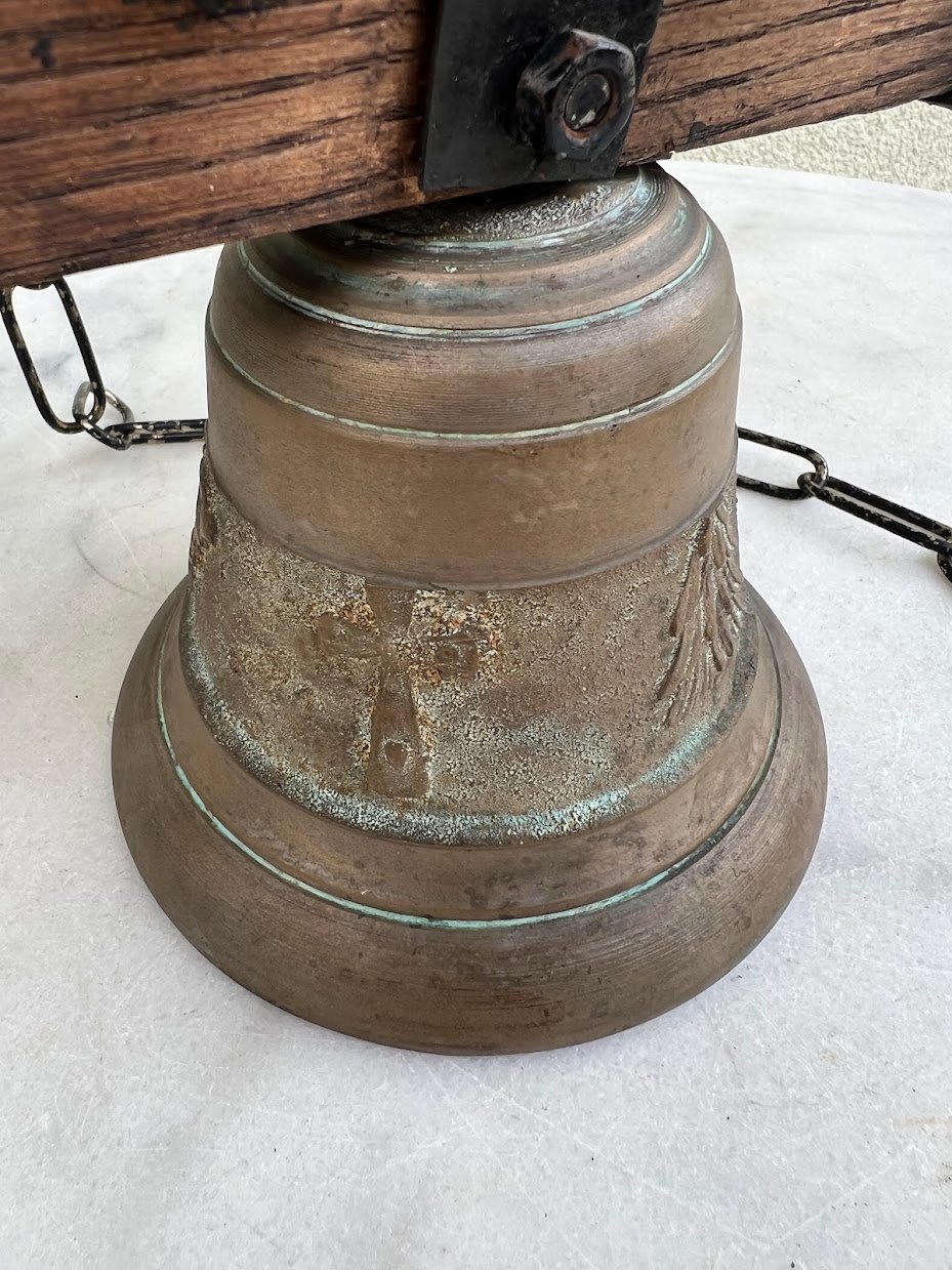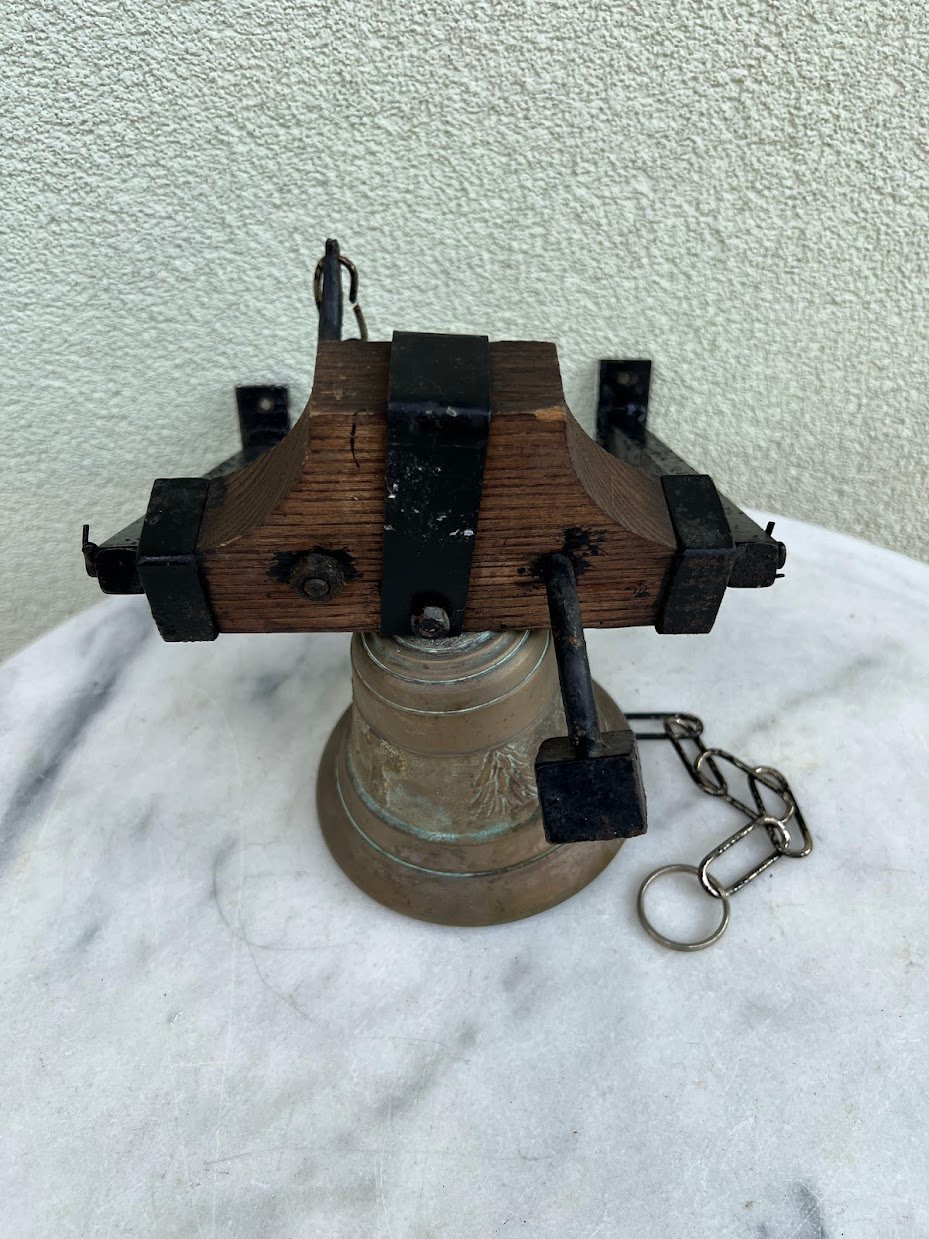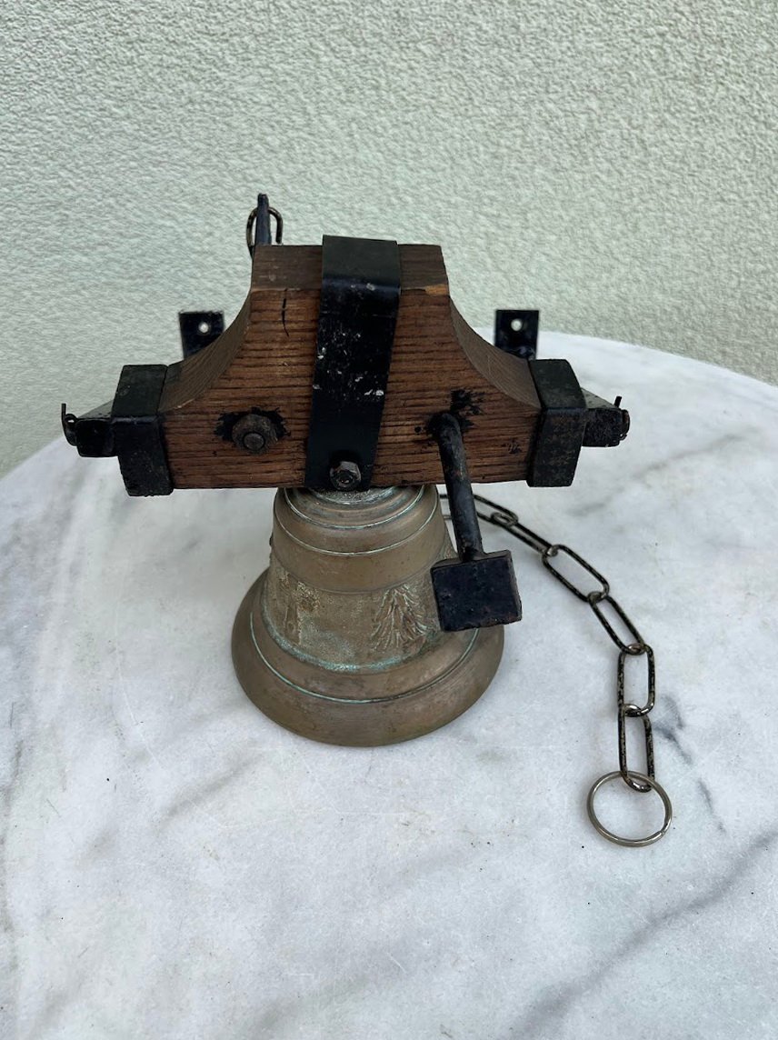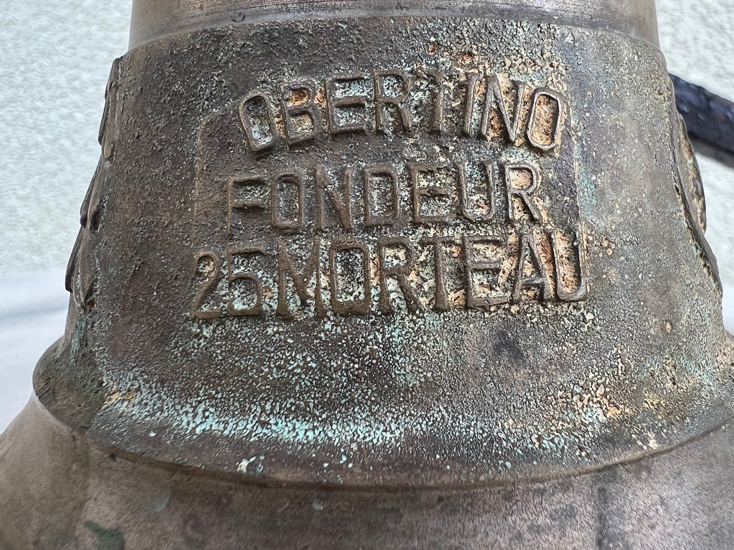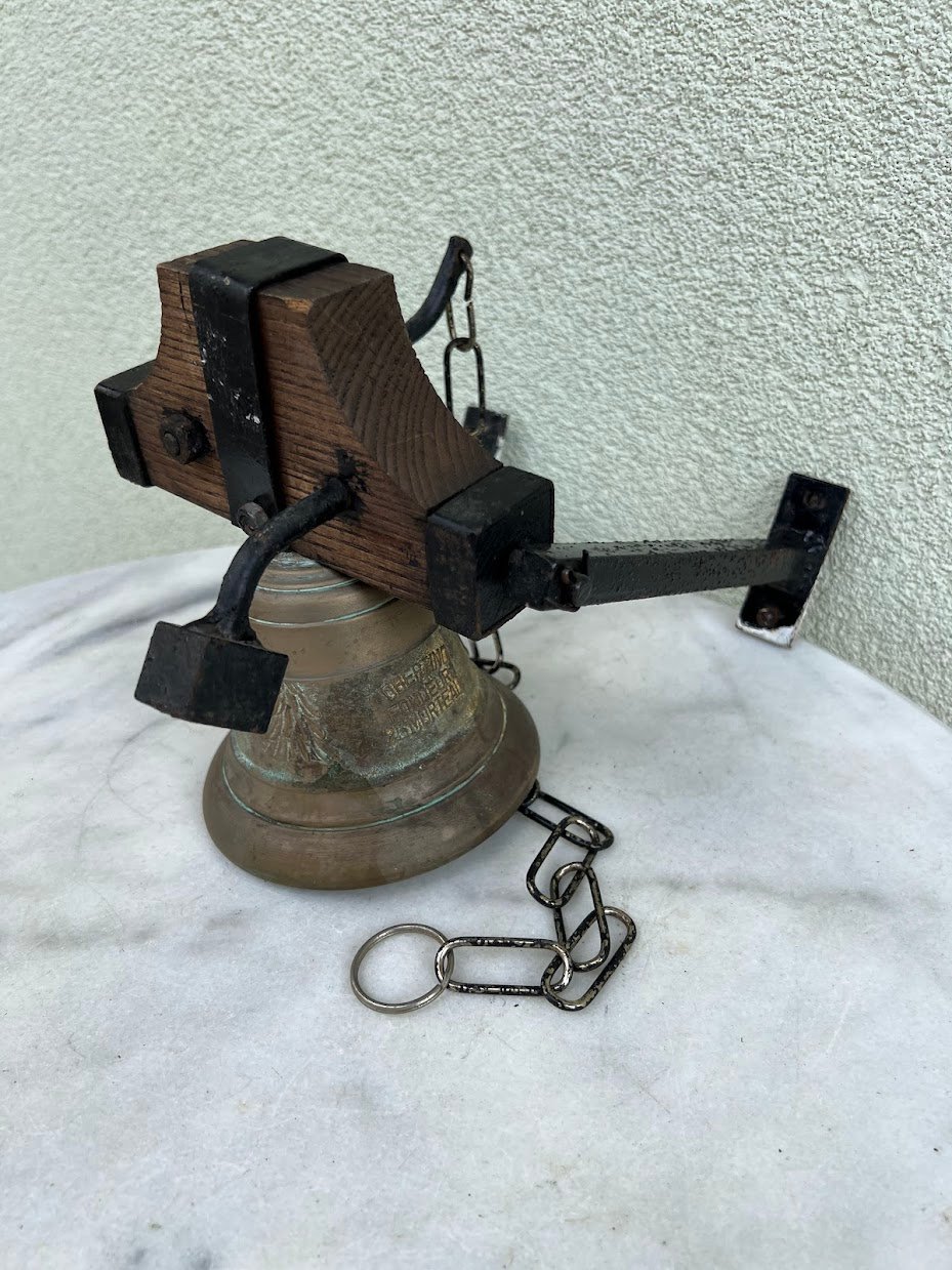 Varpas antikvarinis, OBERTI FONDEUR 26 MORTEAU, pramcūziškas, tvirtinamas prie sienos su skambinimo mechanizmu. XIX a. pb. Viso atstumas nuo sienos 31, plotis 22, aukštis 19, varpo dydis: 11 x 12 cm. Kaina 187