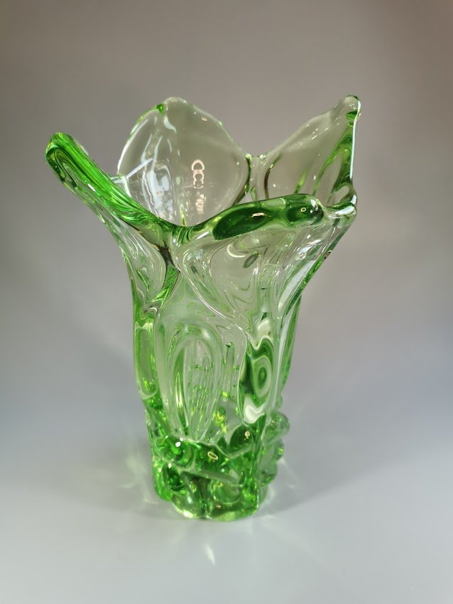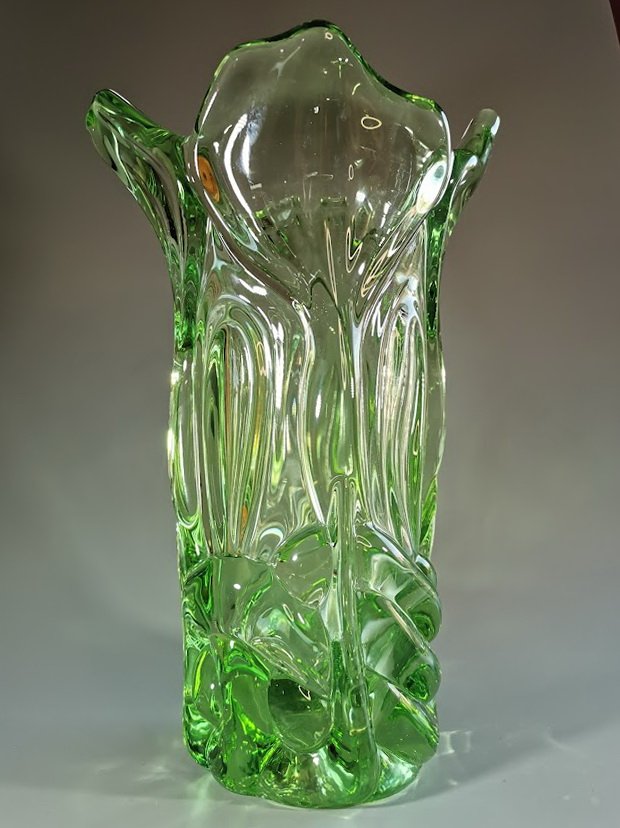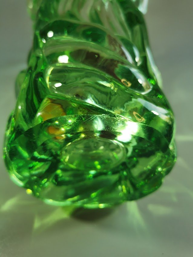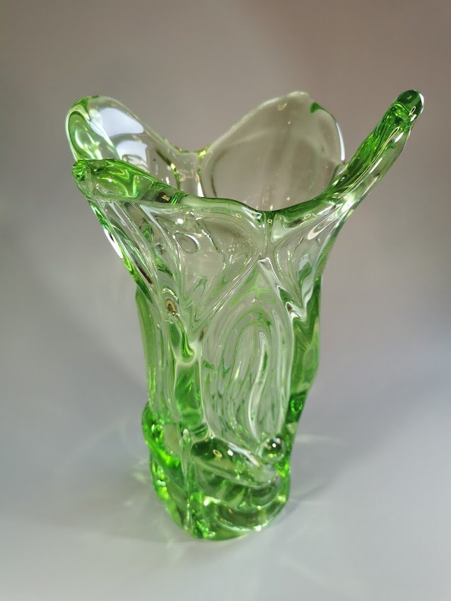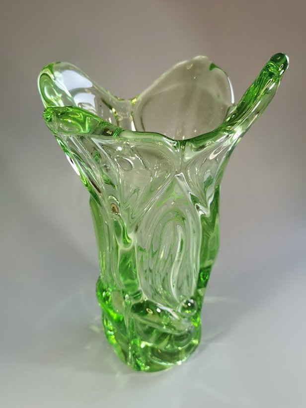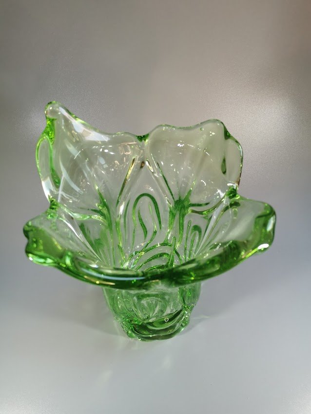 Vaza antikvarinė, storo, žalio stiklo. Svoris 3 kg. Aukštis 30 cm. Kaina 53