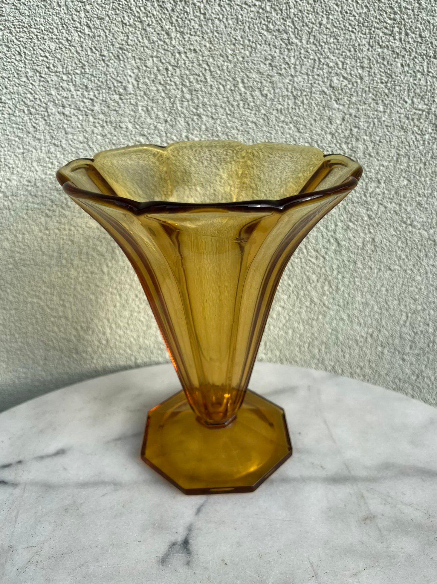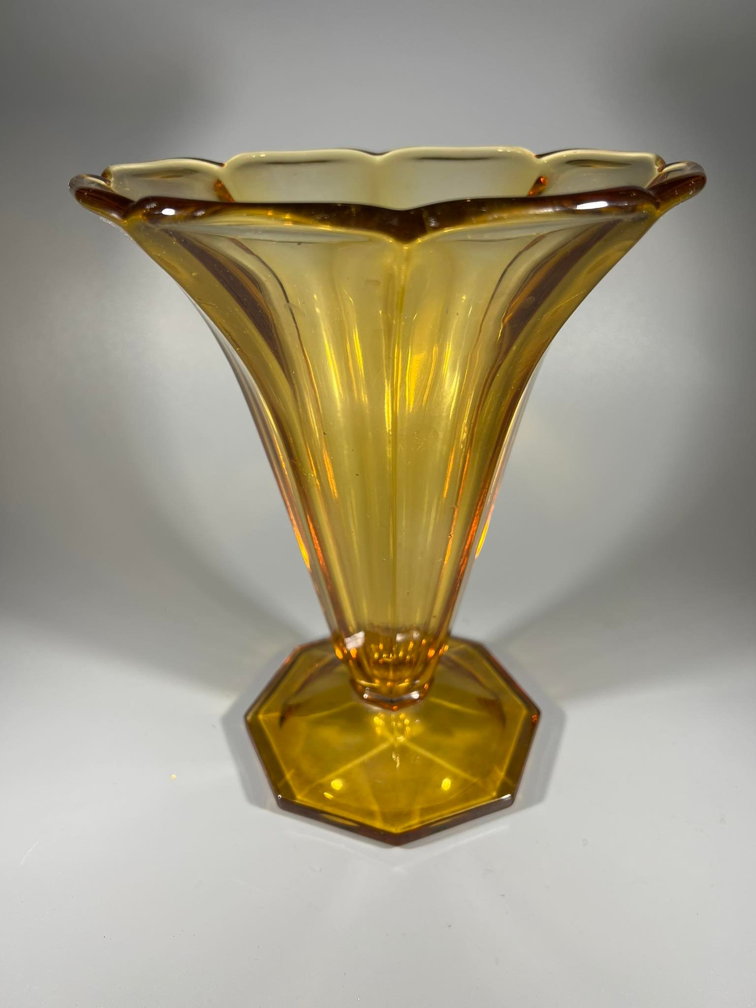 Vaza Art Deco stiliaus, gintaro spalvos presuoto stiklo, antikvarinė, tarpukario laikų. Čekoslovakija. 1930 m. Aukštis 23, pagrindo skersmuo 12 cm. Kaina 63
