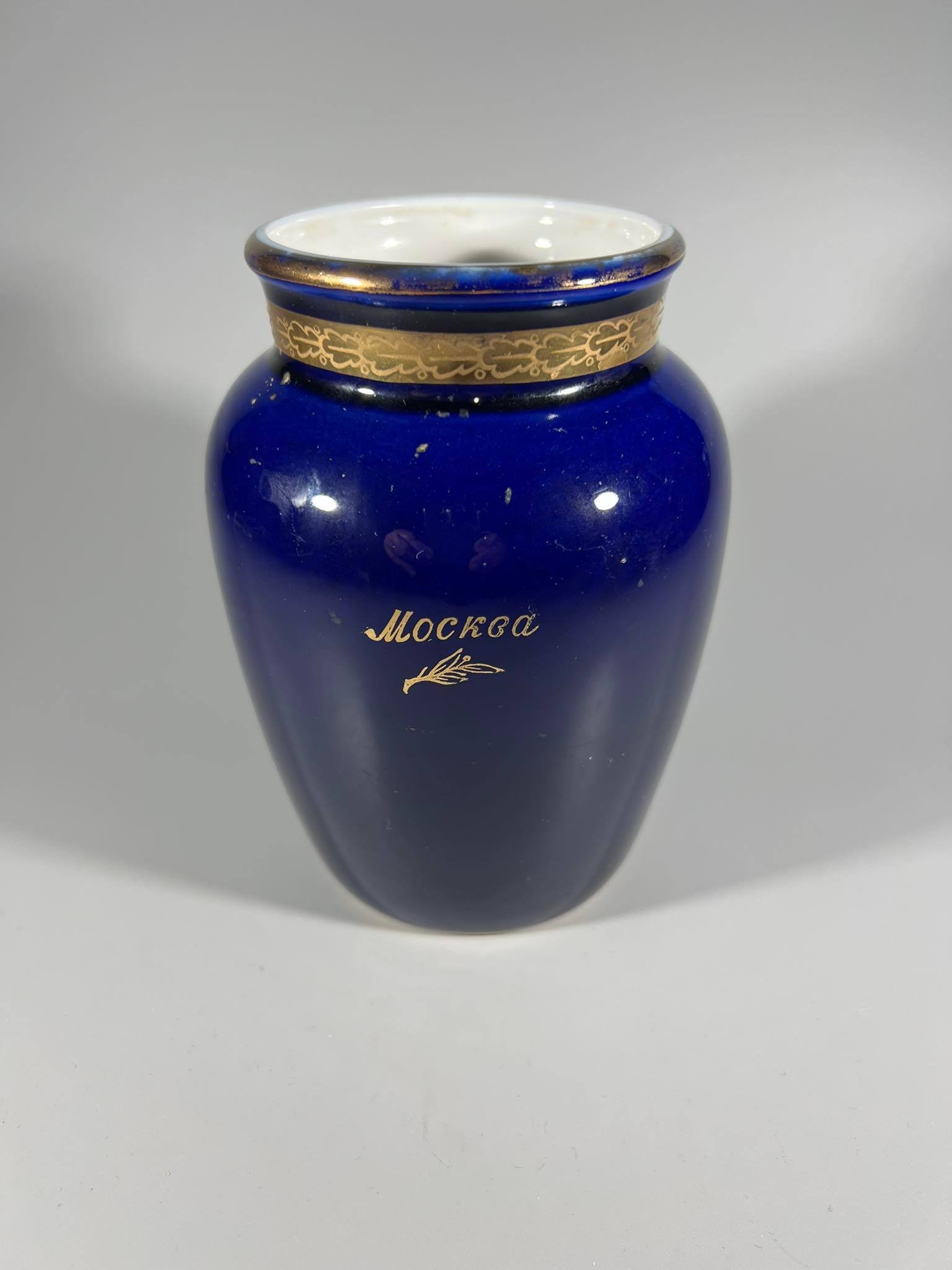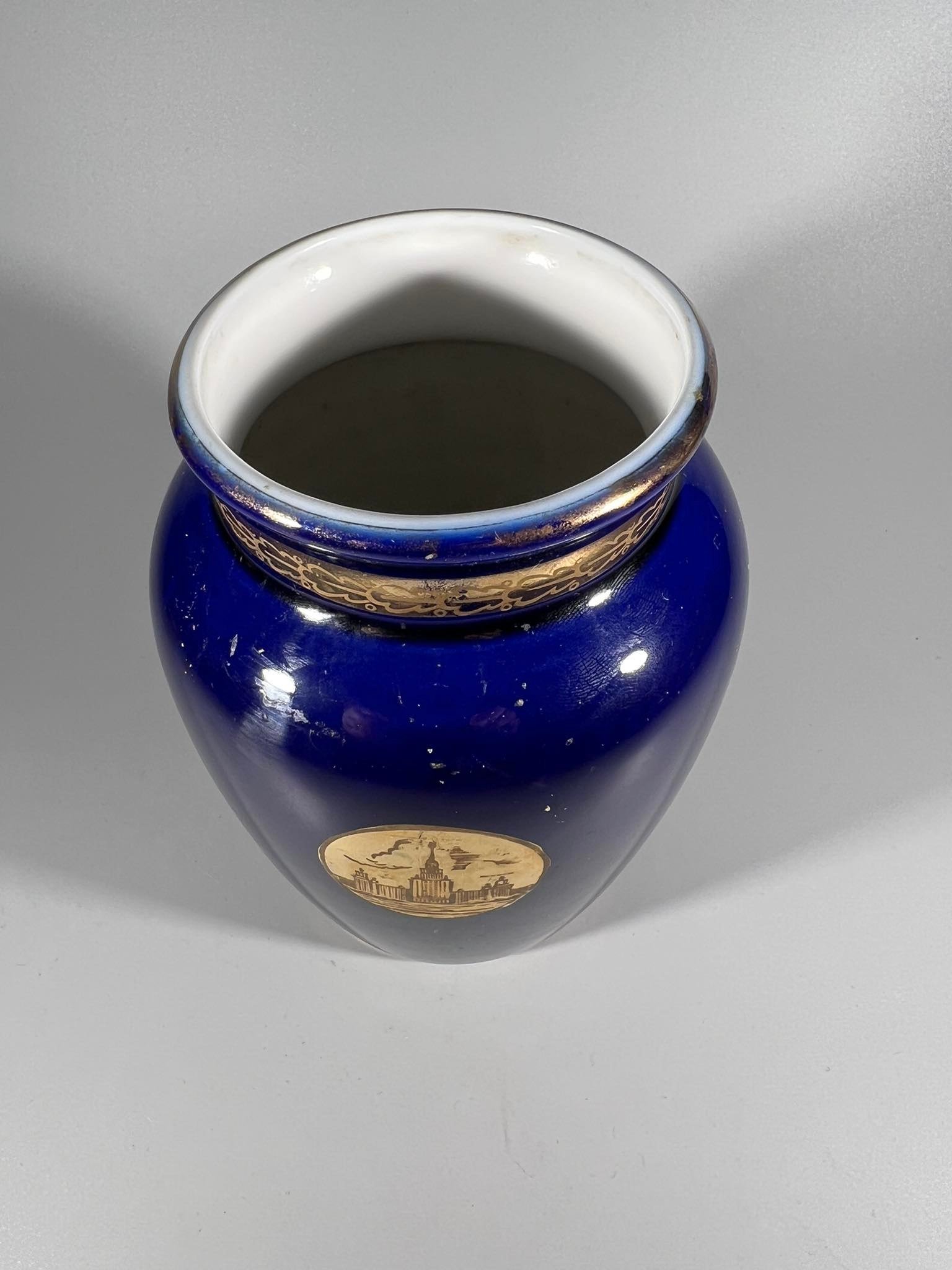 Vaza „Maskva. Universitetas“, porcelianas, kobaltas, auksavimas, LFZ, SSRS, 1950 m. Aukštis 15 cm. Kaina 26