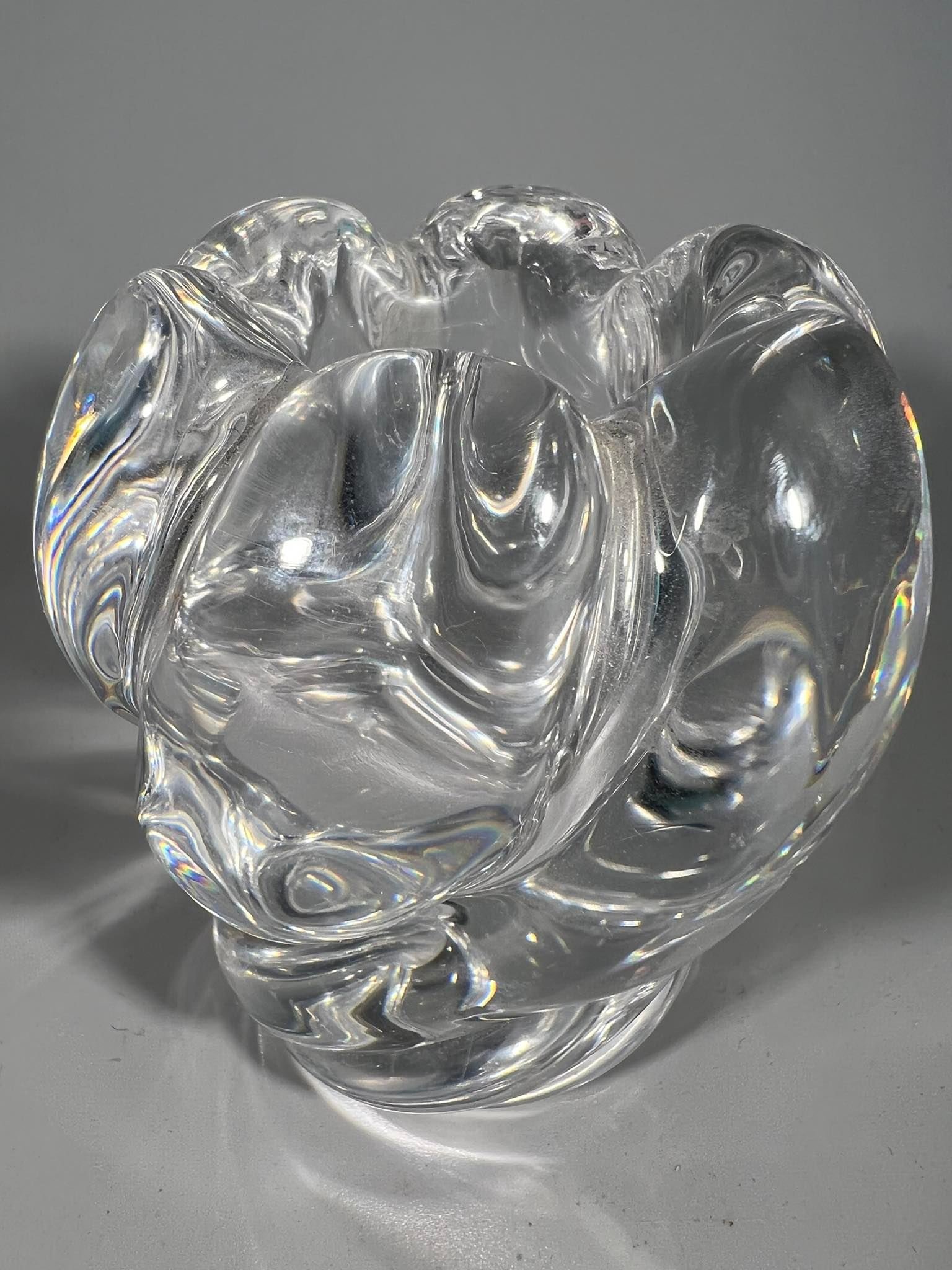Vaza storo presuoto stiklo, Mid-century modern stiliaus. Autorinė. Gali būti ir žvakidė. Svoris 650 g. Skersmuo 7,5, aukštis 8 cm. Kaina 18
