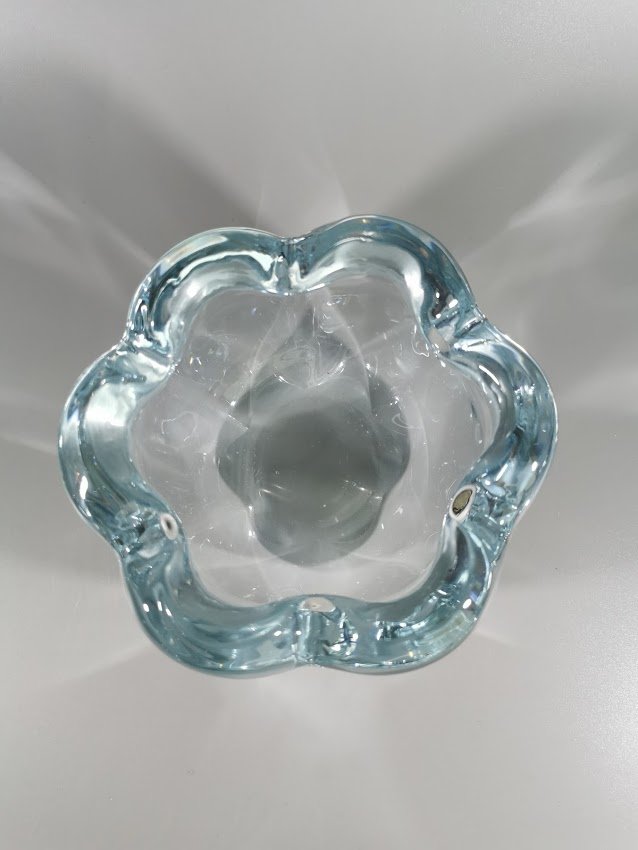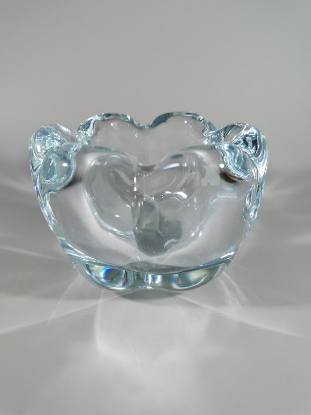 Vaza storo presuoto stiklo, Mid-century modern stiliaus. Autorinė. Svoris 1,1 kg. Skersmuo 12, aukštis 8 cm. Kaina 32
