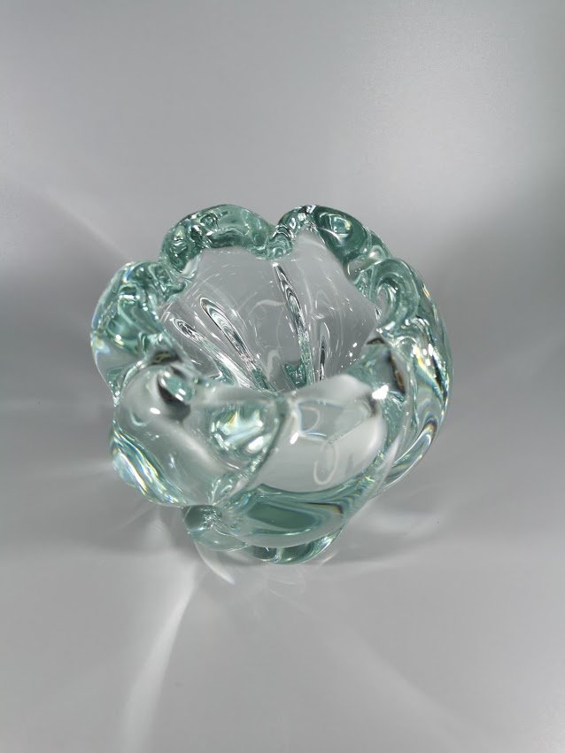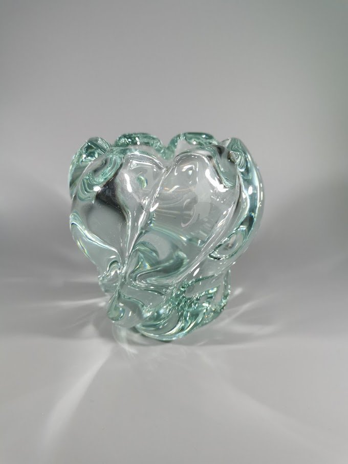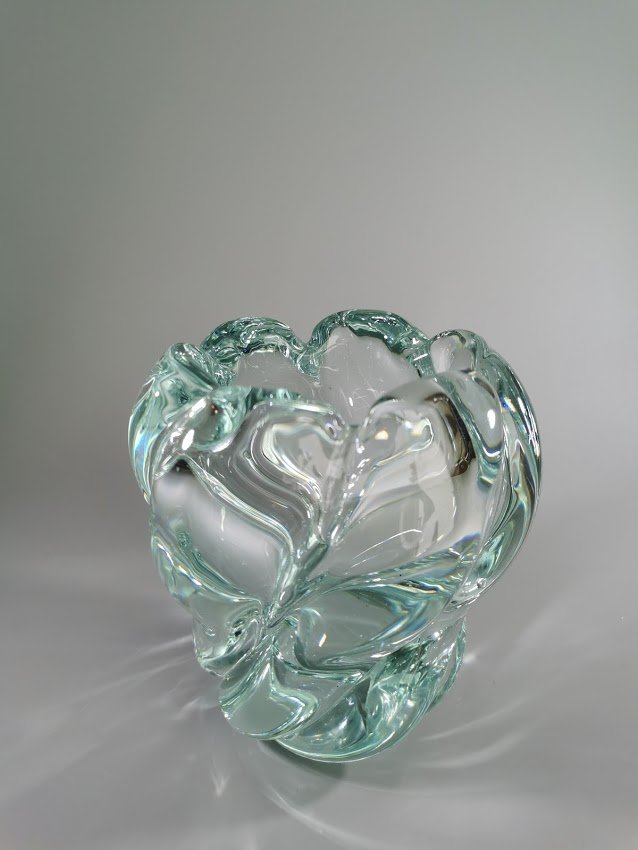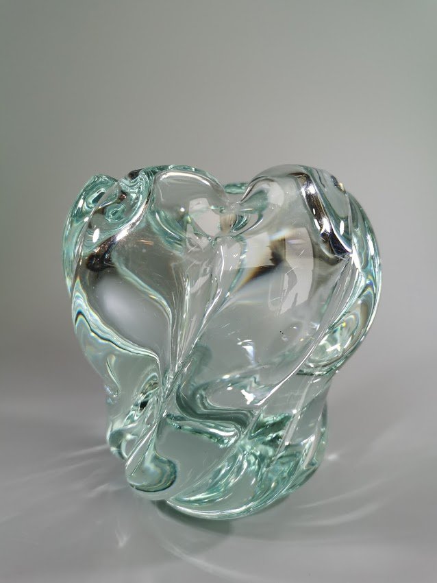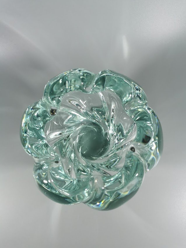 Vaza storo presuoto stiklo, Mid-century modern stiliaus. Autorinė. Svoris 2,2 kg. Skersmuo 13, aukštis 14 cm. Kaina 48