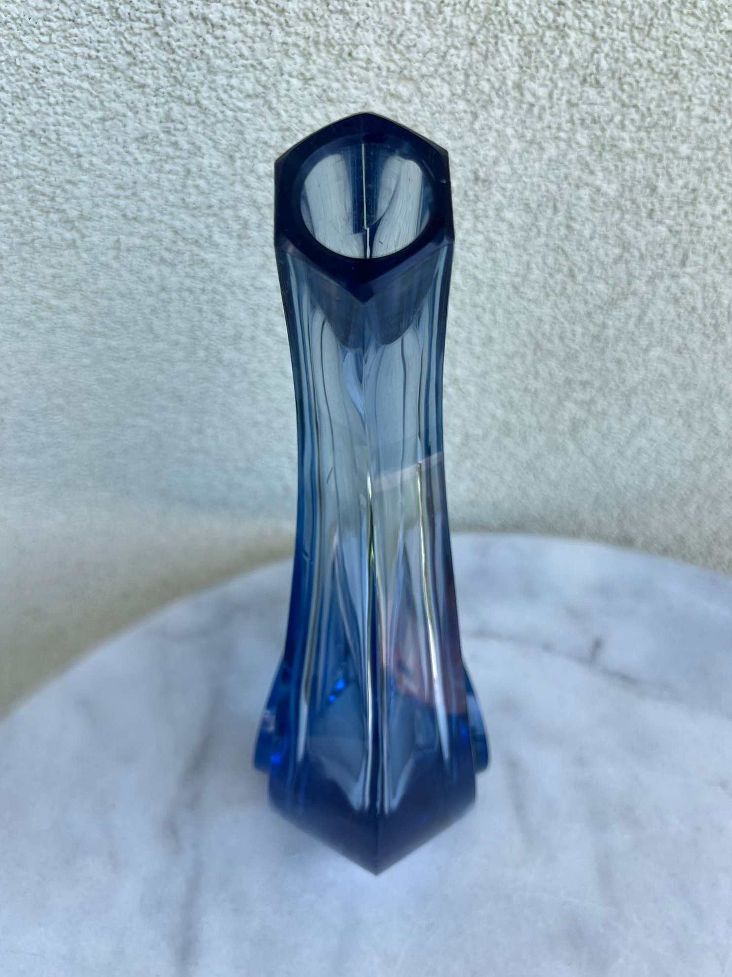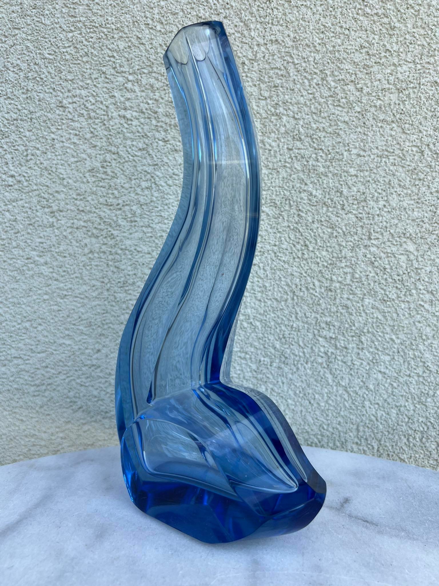 Vaza, vazelė išskirtinės formos, melsvo Murano stiklo, antikvarinė. Svoris 1,5 kg. Aukštis 28 cm. Kaina 128