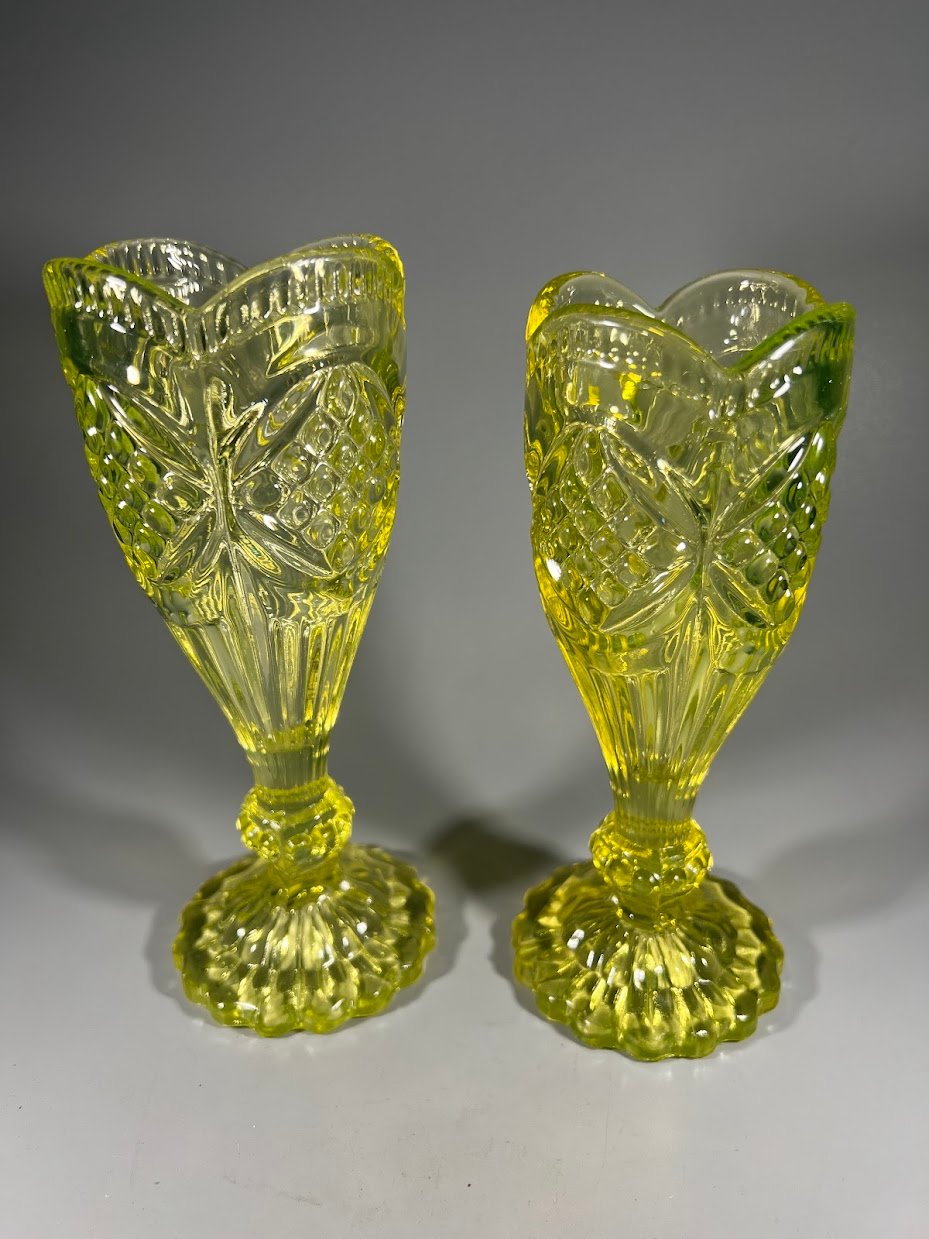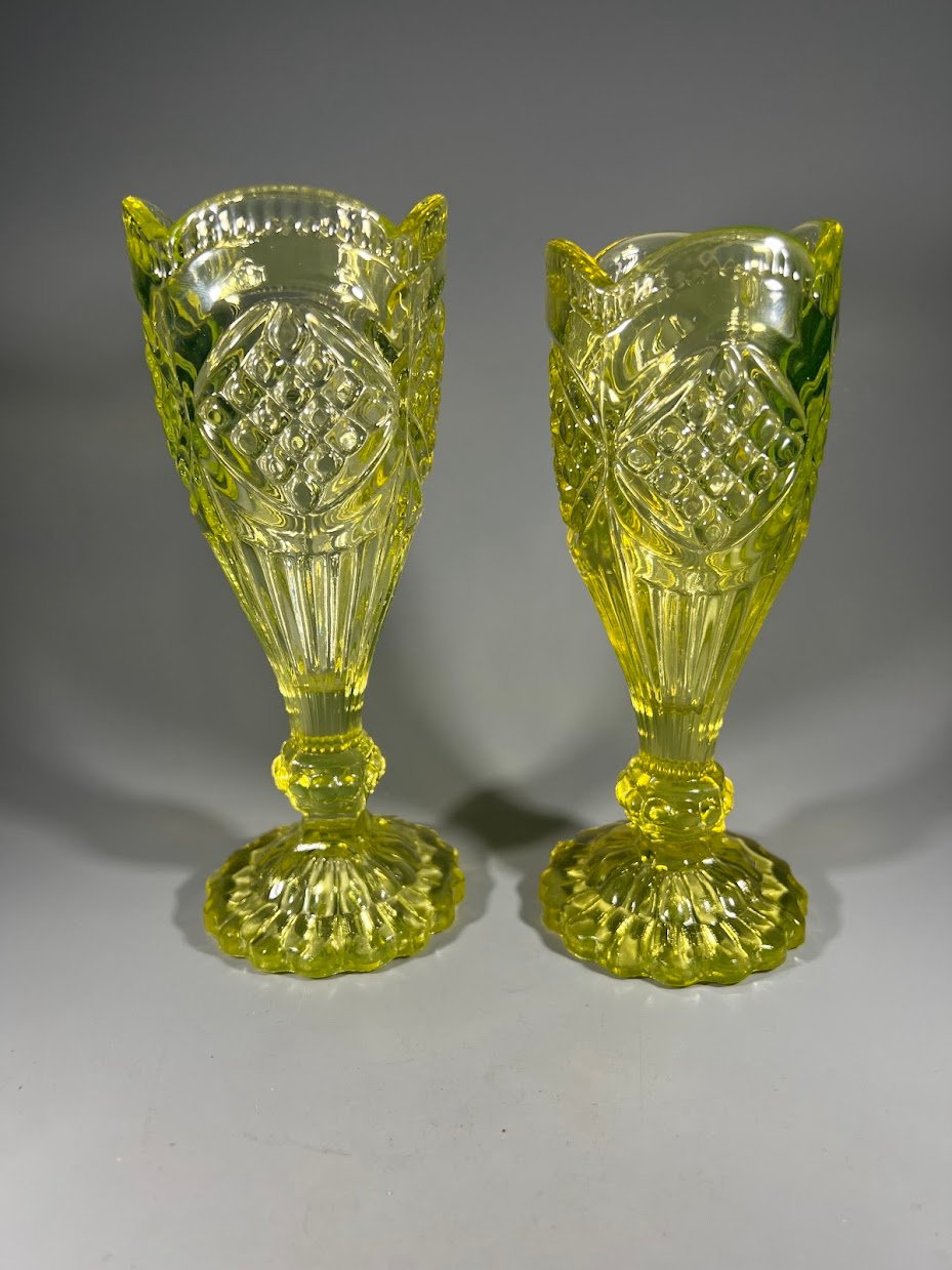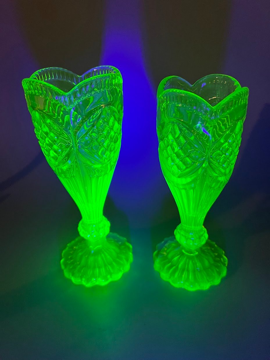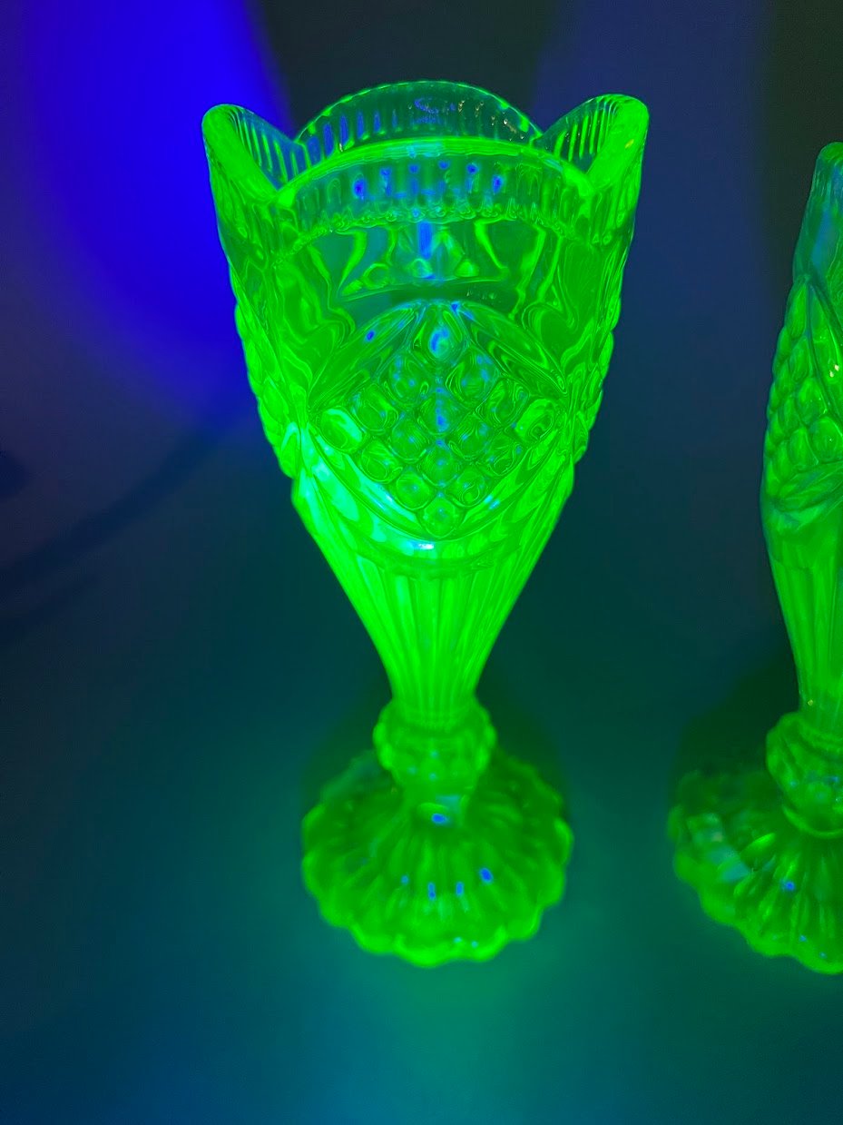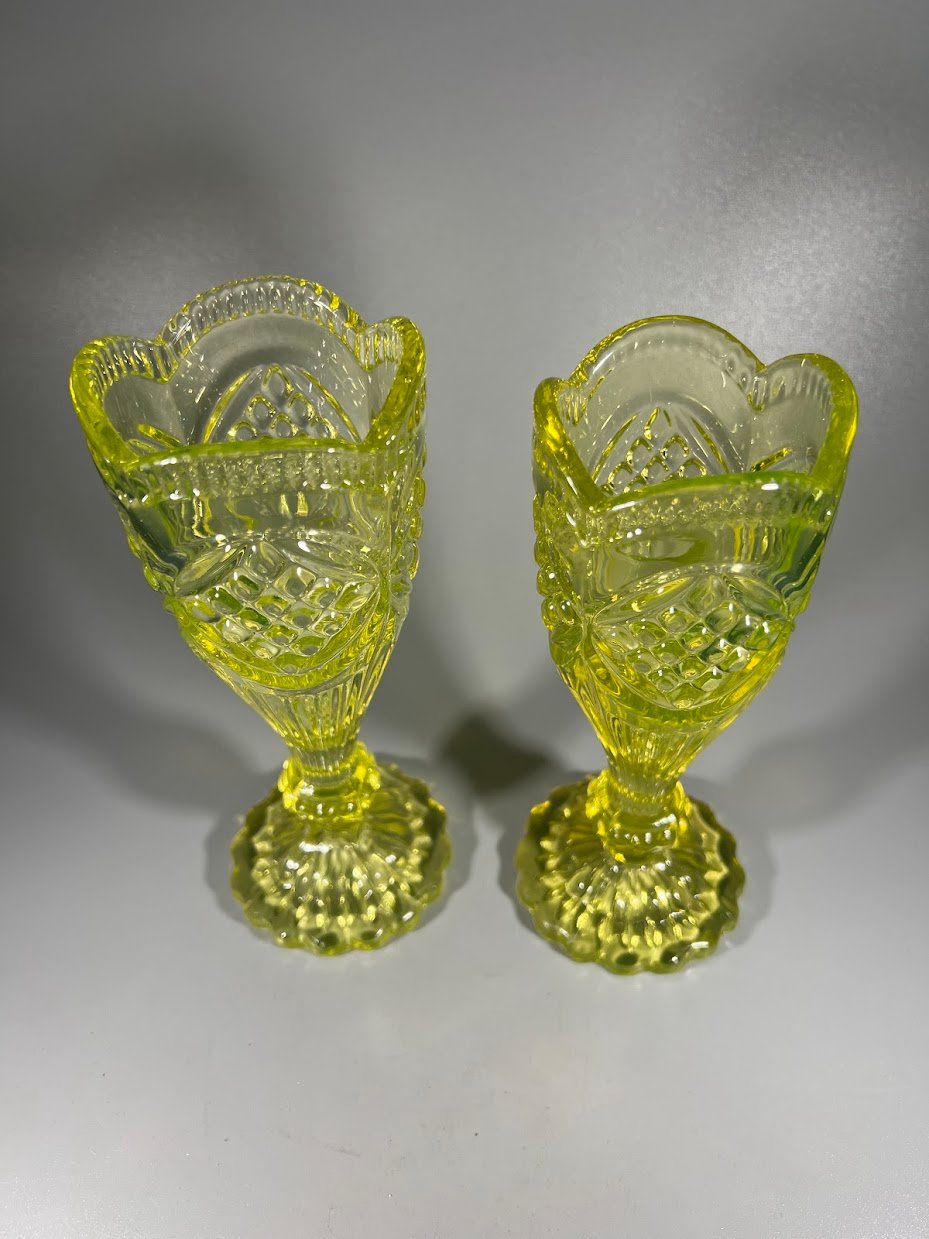 Vaza, vazelė, vazelės urano stiklo, antikvarinės. 2 vnt. Kaina po 88