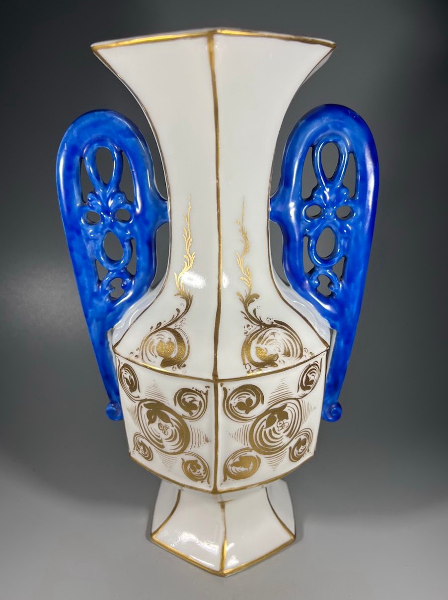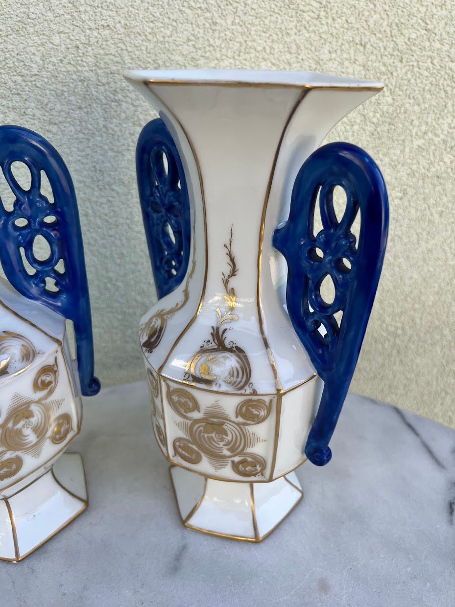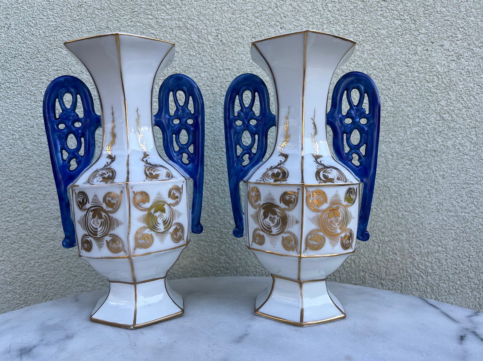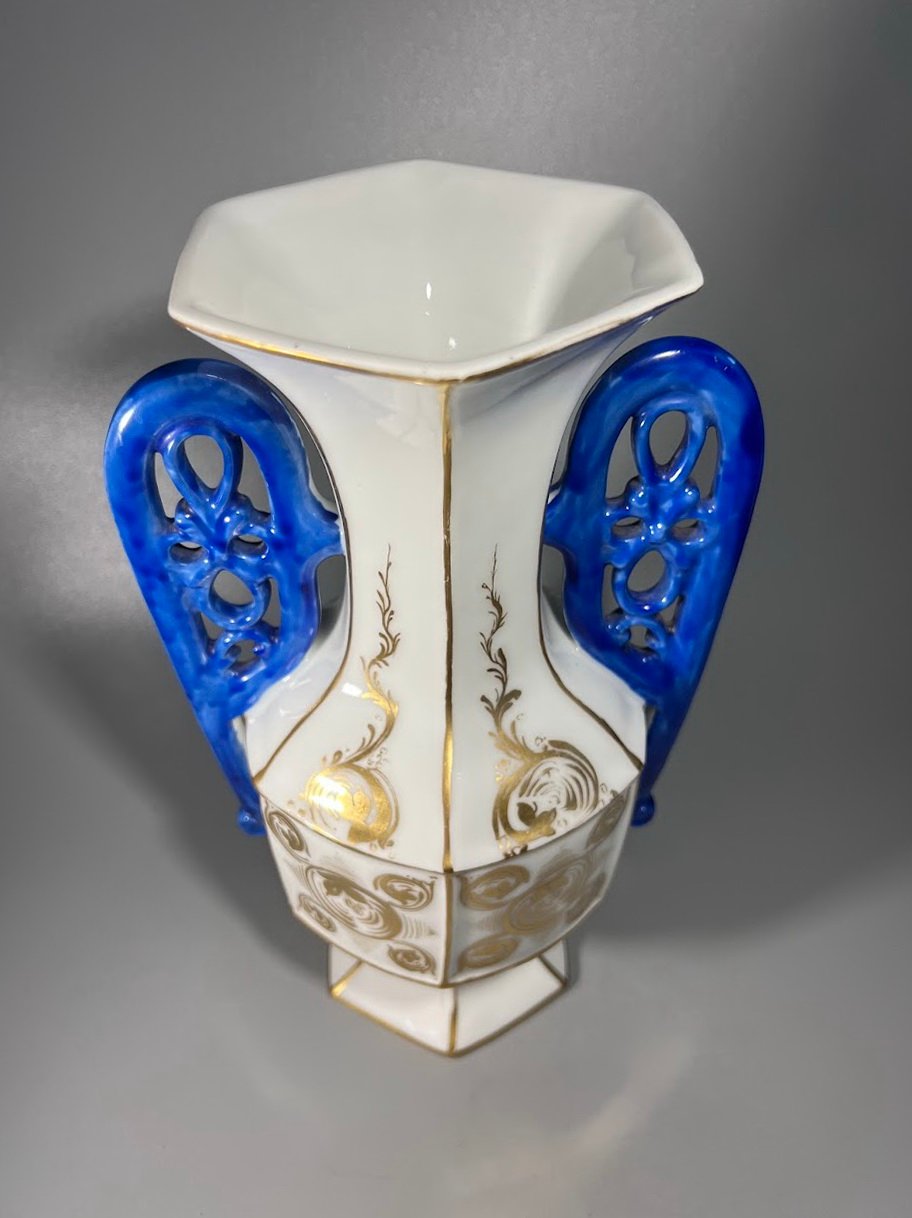 Vazų pagaminimo laikotarpis: Vėlyvasis istorizmas / Art Nouveau. Elegantiška pora dekoratyvinių porcelianinių vazų su šešiakampiu pagrindu, balta glazūra, puoštu aukso ornamentika ir giliu kobalto mėlynumo ažūriniu rankenų dizainu. Kiekviena vaza dekoruota subtiliais ranka tapytais aukso vingiais ir spiraliniais motyvais, būdingais Art Nouveau laikotarpio dekorui. Gamintojas nežymėtas, tačiau stilius ir technika leidžia priskirti gamybą vėlyvojo 19 a. – ankstyvojo 20 a. Austrijos arba Bohemijos porceliano dirbtuvėms. Tokie gaminiai buvo populiarūs kaip židinio ar bufeto puošmenos turtinguose Europos namuose.