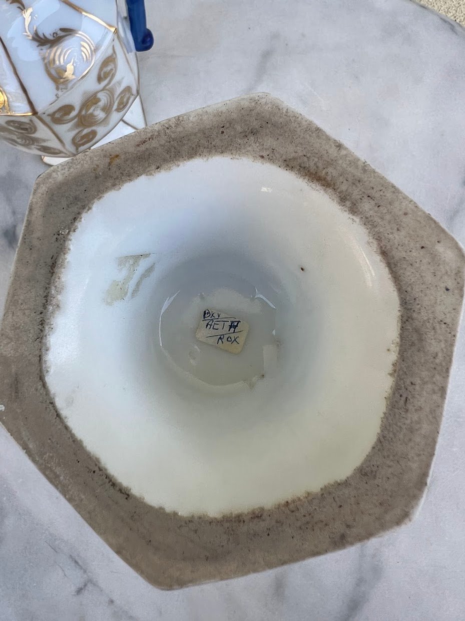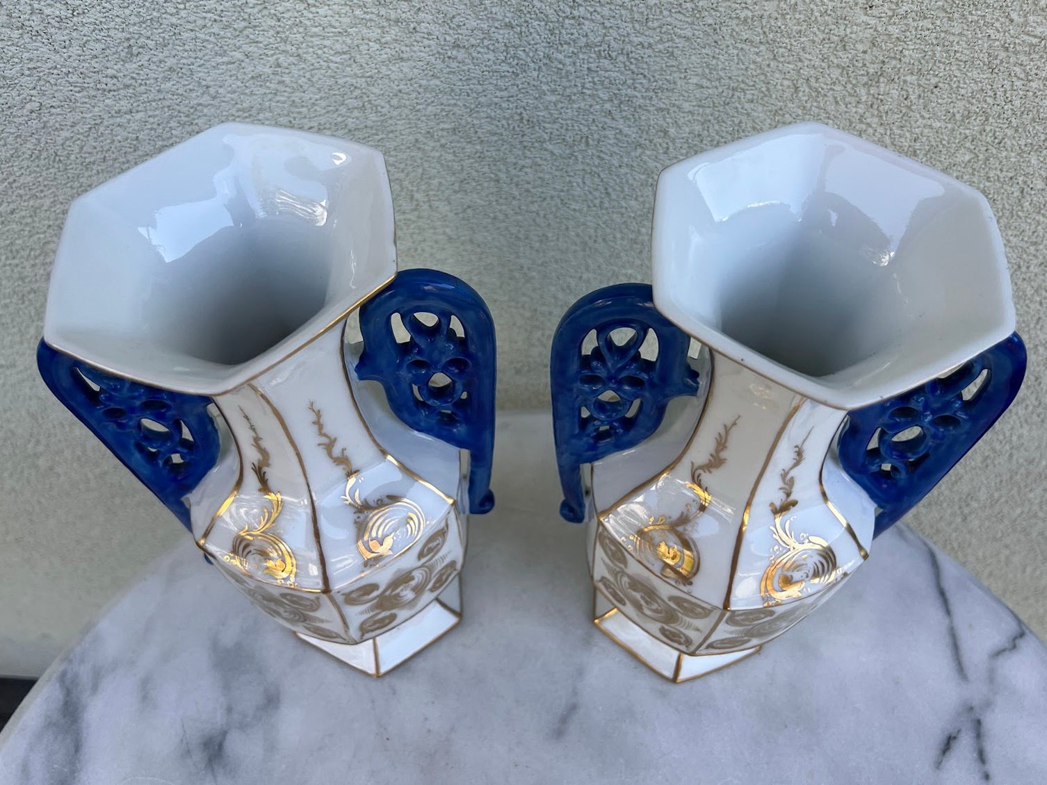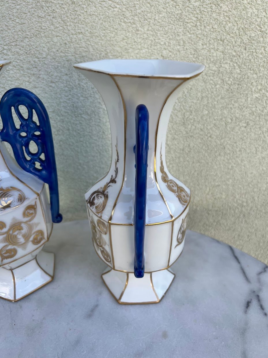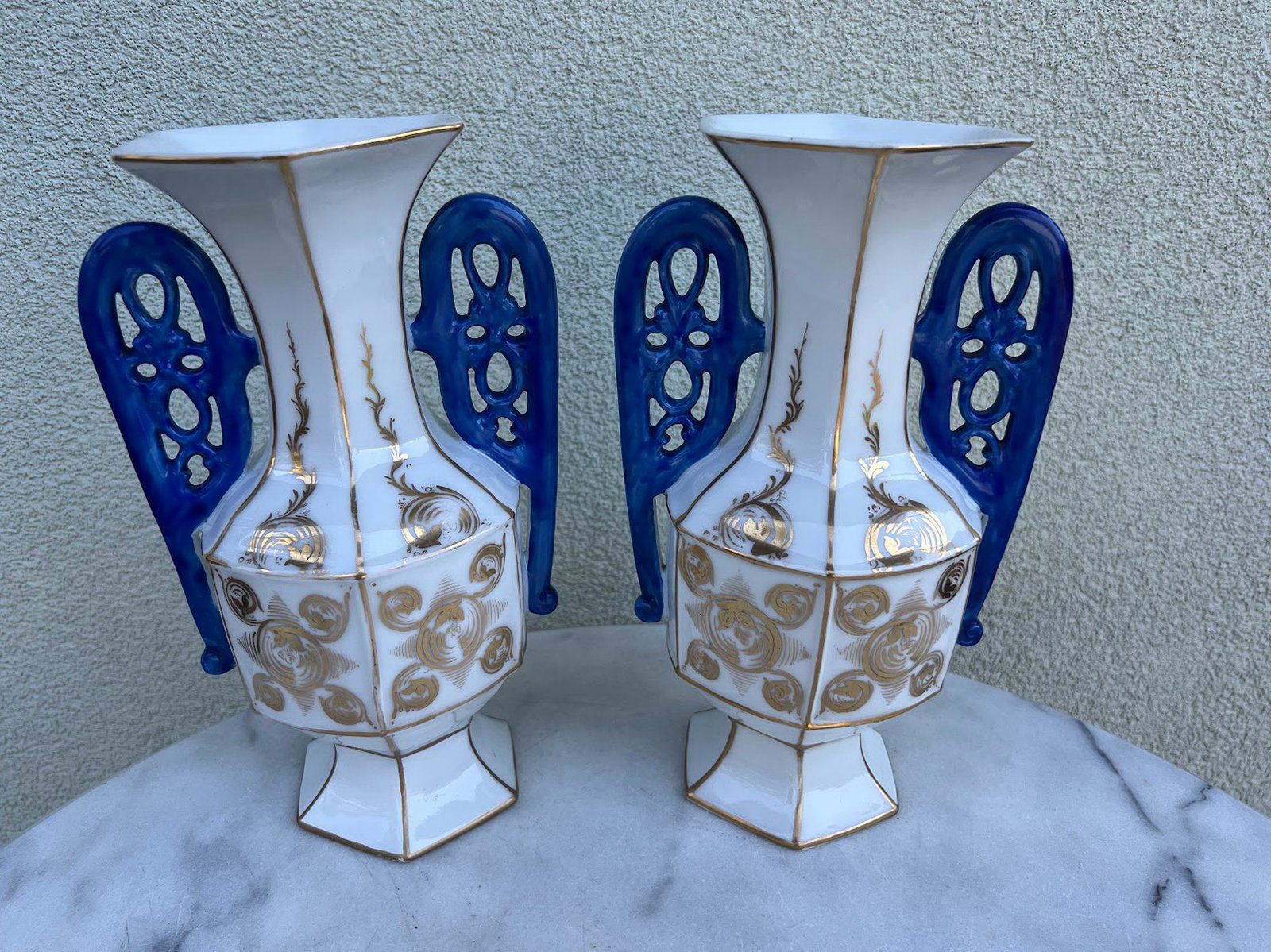 Vazų pagaminimo laikotarpis: Vėlyvasis istorizmas / Art Nouveau. Elegantiška pora dekoratyvinių porcelianinių vazų su šešiakampiu pagrindu, balta glazūra, puoštu aukso ornamentika ir giliu kobalto mėlynumo ažūriniu rankenų dizainu. Kiekviena vaza dekoruota subtiliais ranka tapytais aukso vingiais ir spiraliniais motyvais, būdingais Art Nouveau laikotarpio dekorui. Gamintojas nežymėtas, tačiau stilius ir technika leidžia priskirti gamybą vėlyvojo 19 a. – ankstyvojo 20 a. Austrijos arba Bohemijos porceliano dirbtuvėms. Tokie gaminiai buvo populiarūs kaip židinio ar bufeto puošmenos turtinguose Europos namuose.