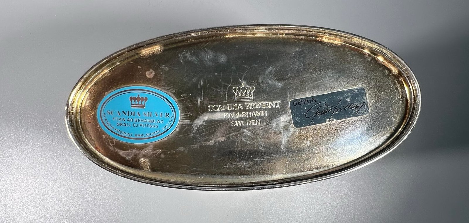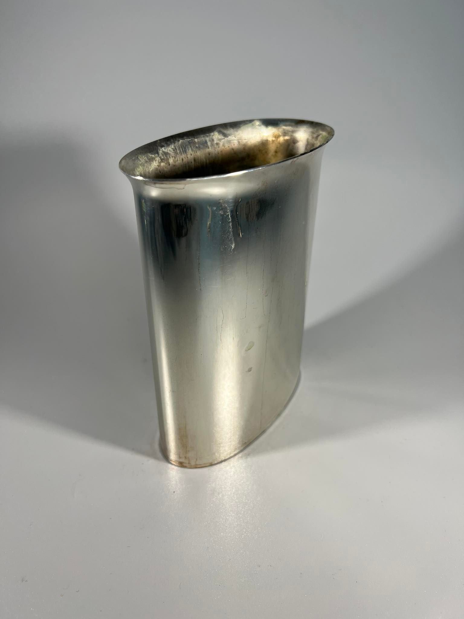 Vazelė metalinė, autorinė, sidabruota. Scandia silver. Dizainerio autografas. Aukštis 15, ovalas 6 x 12 cm. Kaina 17