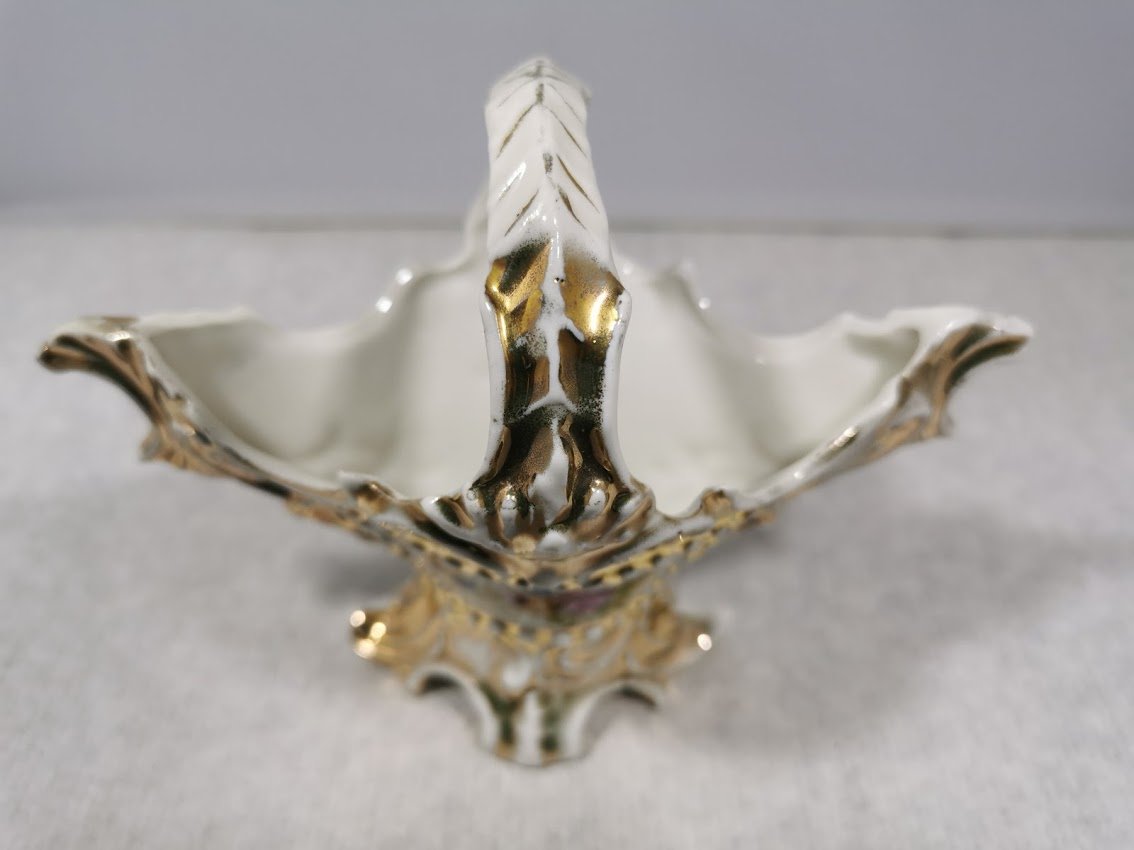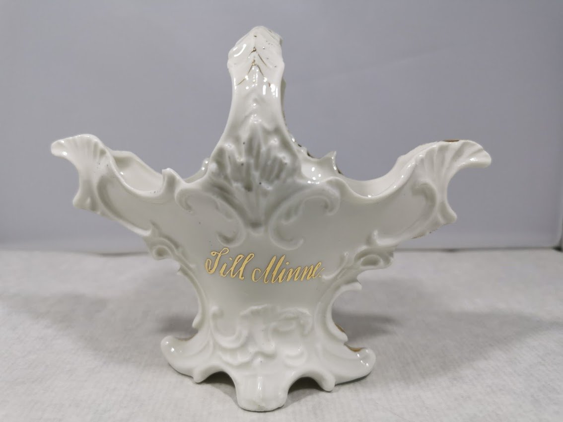 Vazelė porcelianinė, antikvarinė. Ilgis 16, aukštis 13, plotis 7 cm. Kaina 17