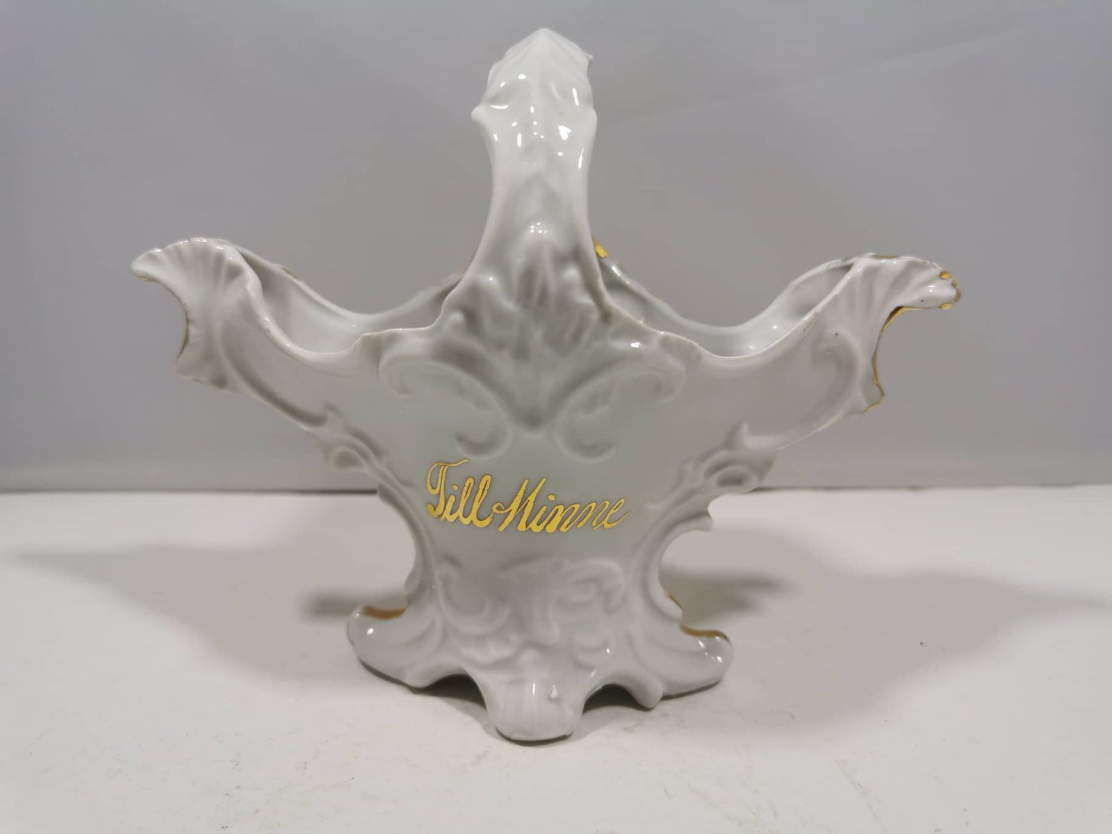 Vazelė porcelianinė, antikvarinė. Ilgis 16, aukštis 13plotis 7 cm. Kaina 17
