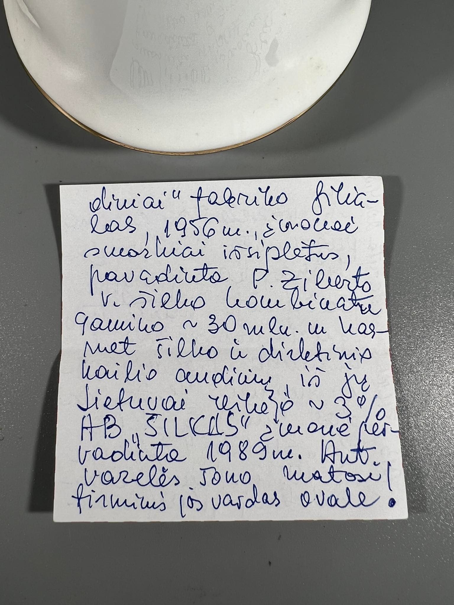 Vazelė porcelianinė su istorija, skirta AB ŠILKAS, pagaminta įmonėje Jiesia. AB Šilkas uždarytas 2004 m. Kaina 53