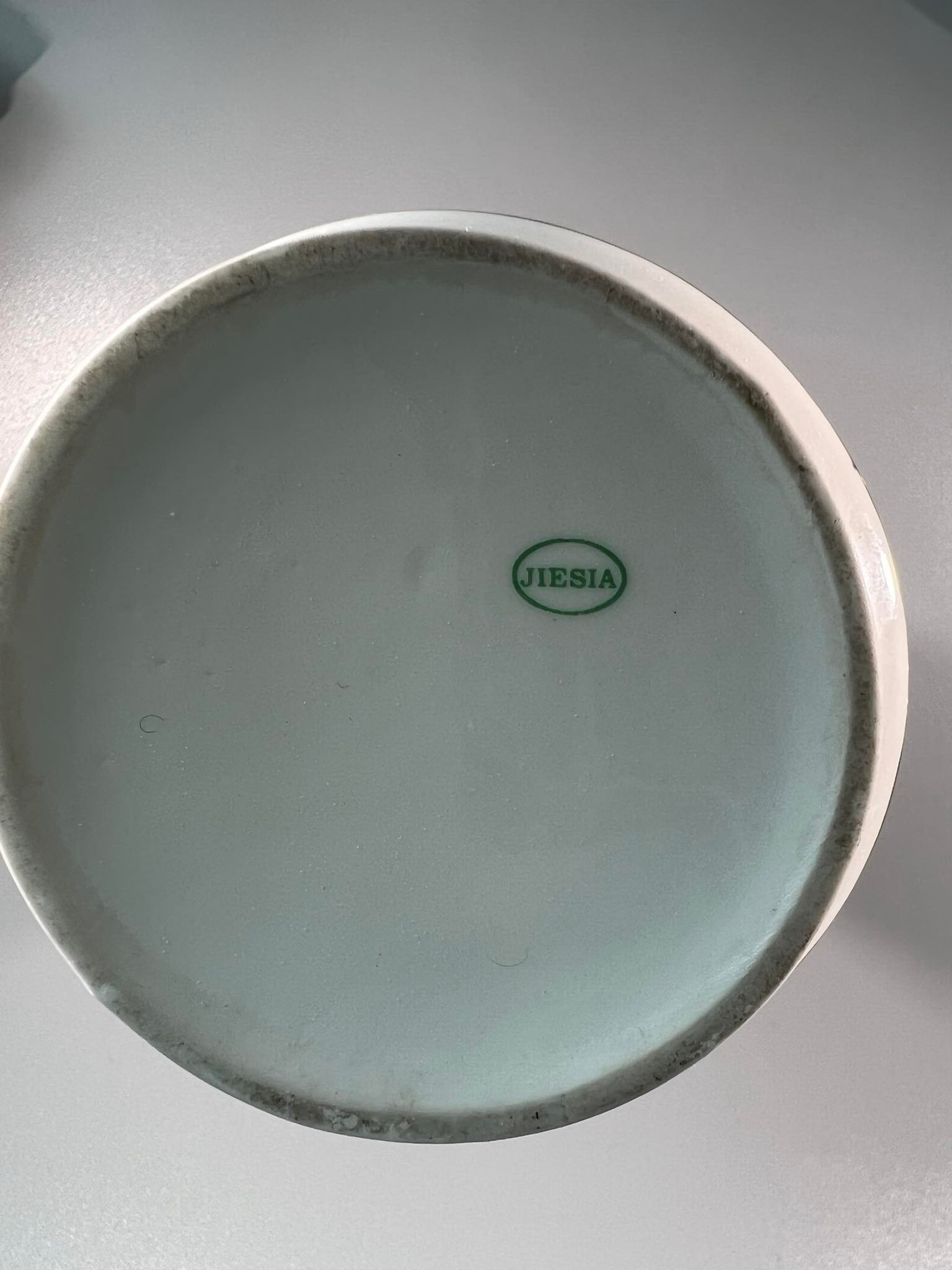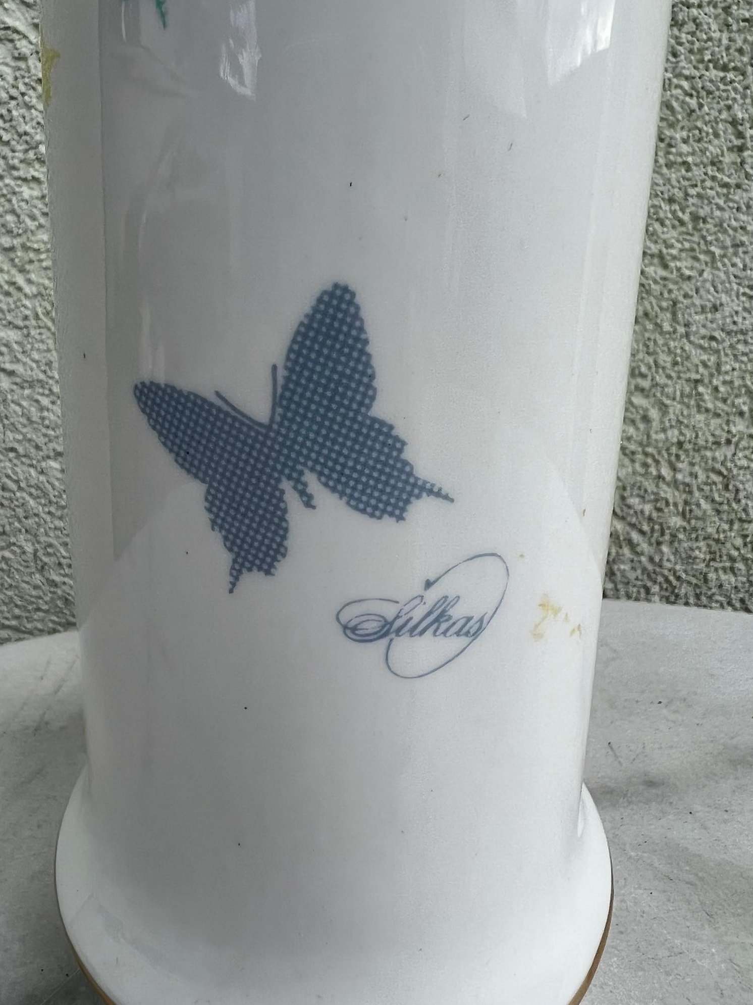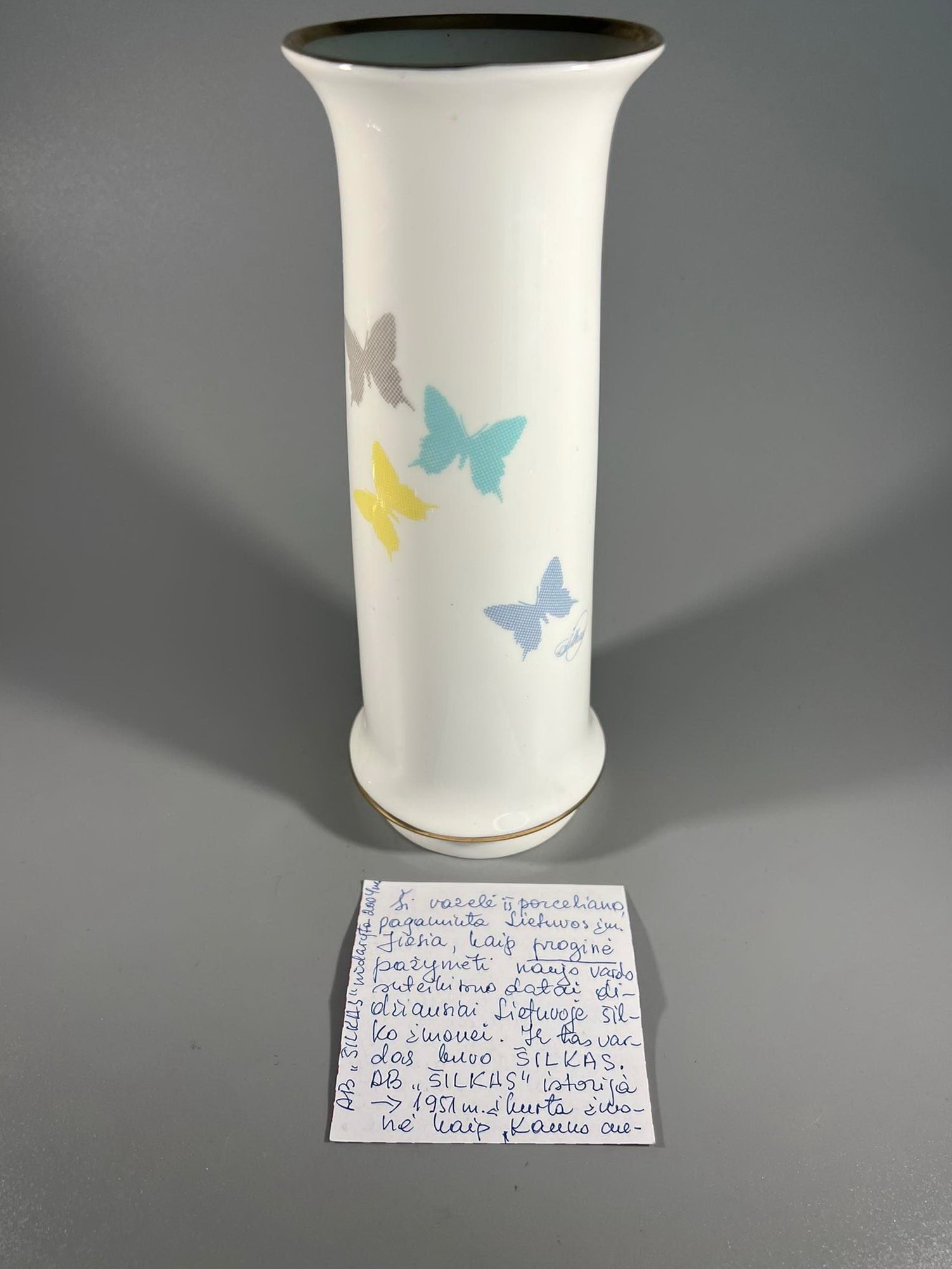 Vazelė porcelianinė su istorija, skirta AB ŠILKAS, pagaminta įmonėje Jiesia. AB Šilkas uždarytas 2004 m. Aukštis 22 cm. Kaina 53