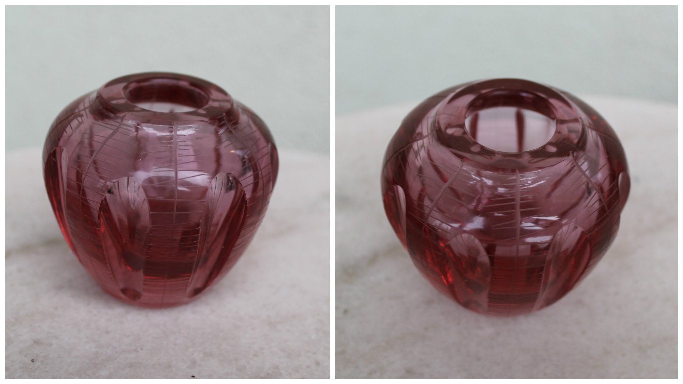 Vazele storo rausvo stiklo. Aukstis 8 cm. Kaina 12