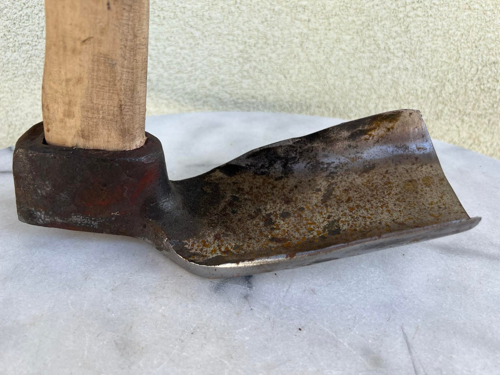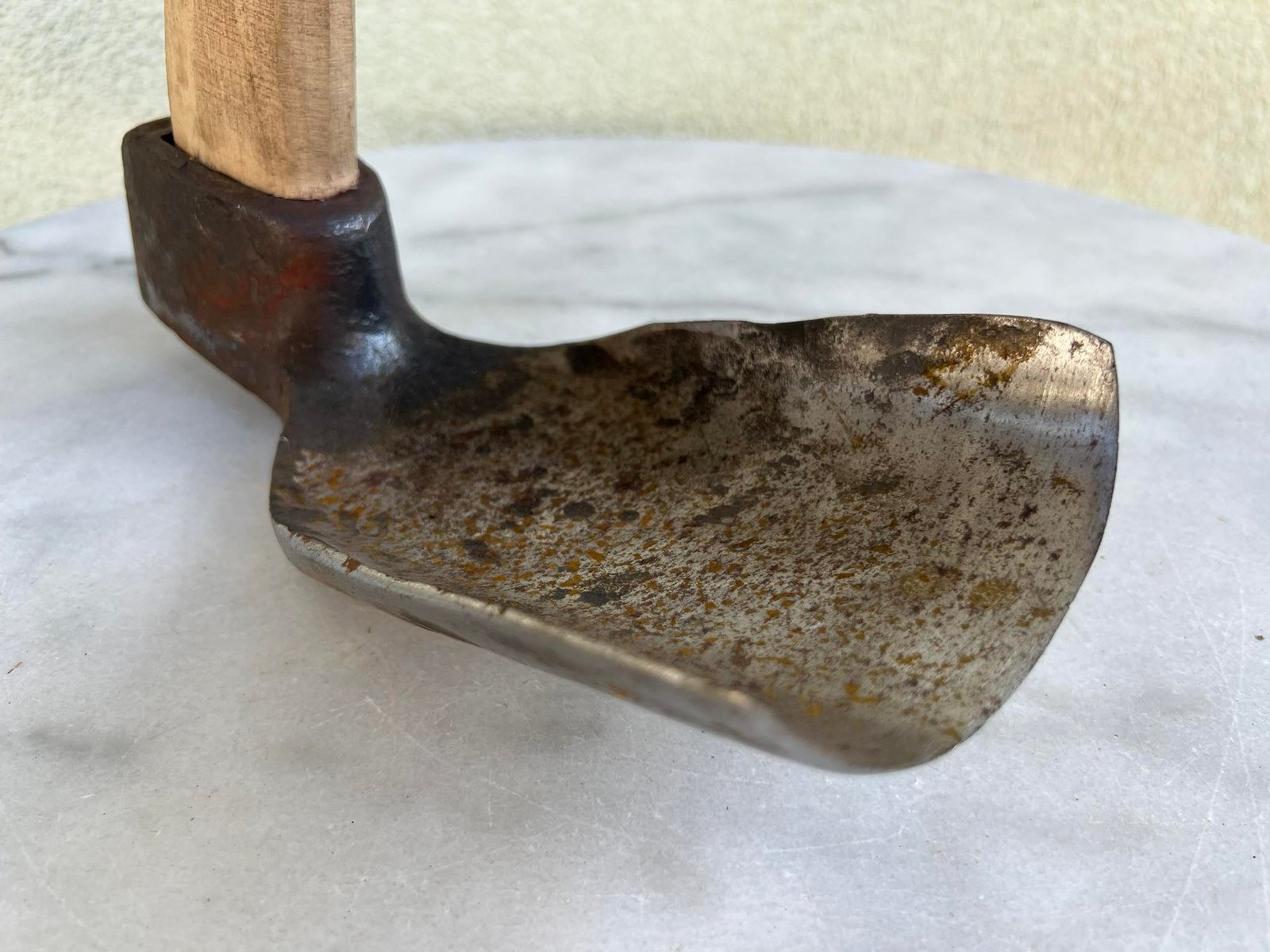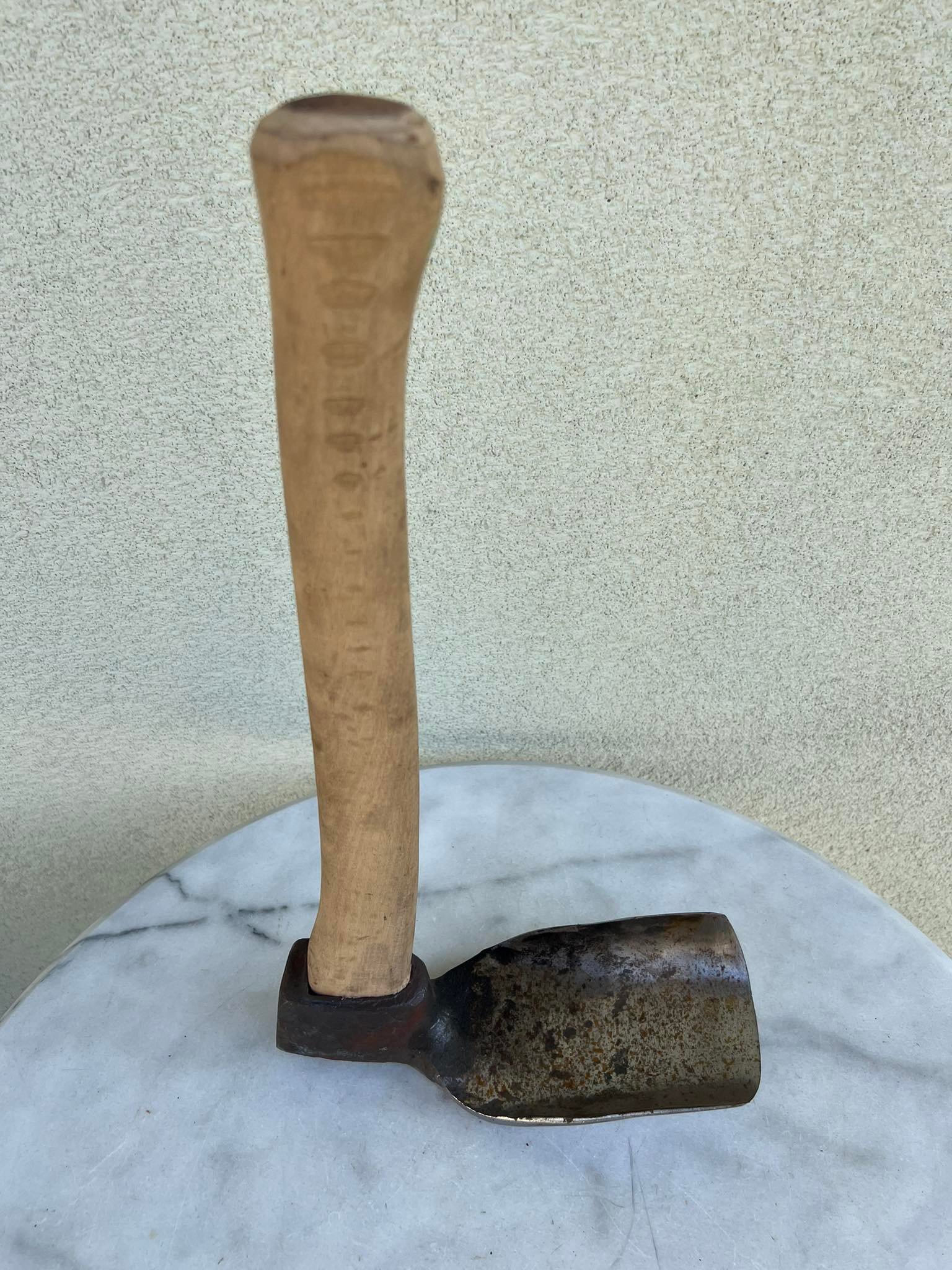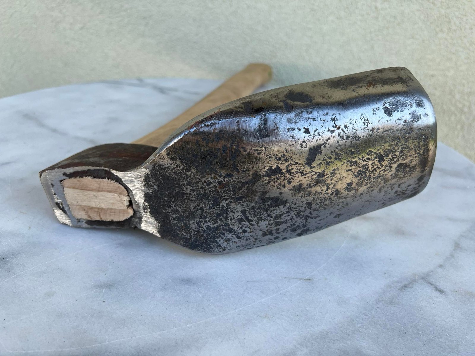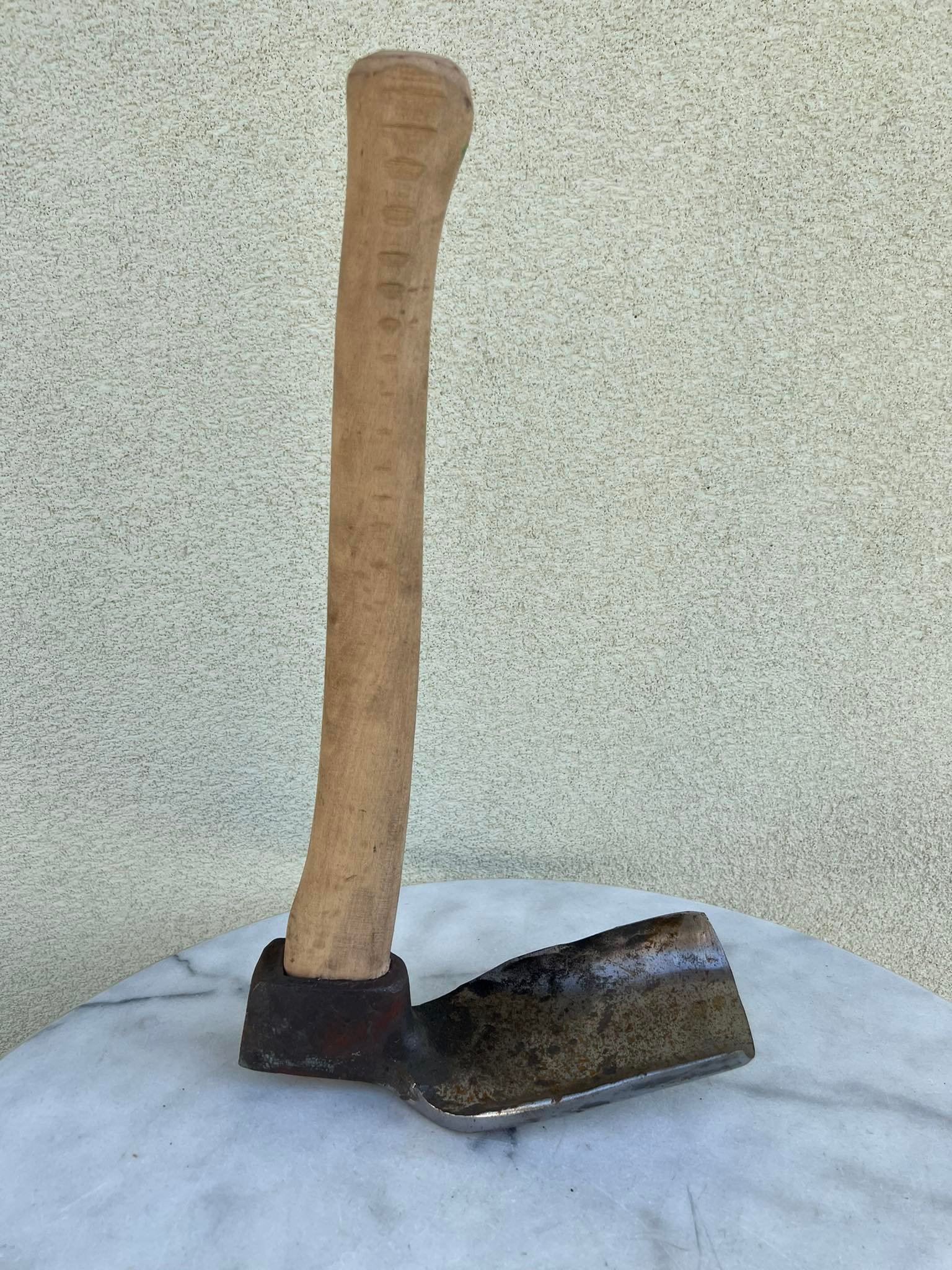 Vedega vienpusė ąžuoliniu kotu, kalviška. Nenaudota. Galvos ilgis 25, plotis 9 cm. Koto ilgis 45 cm. Kaina 63