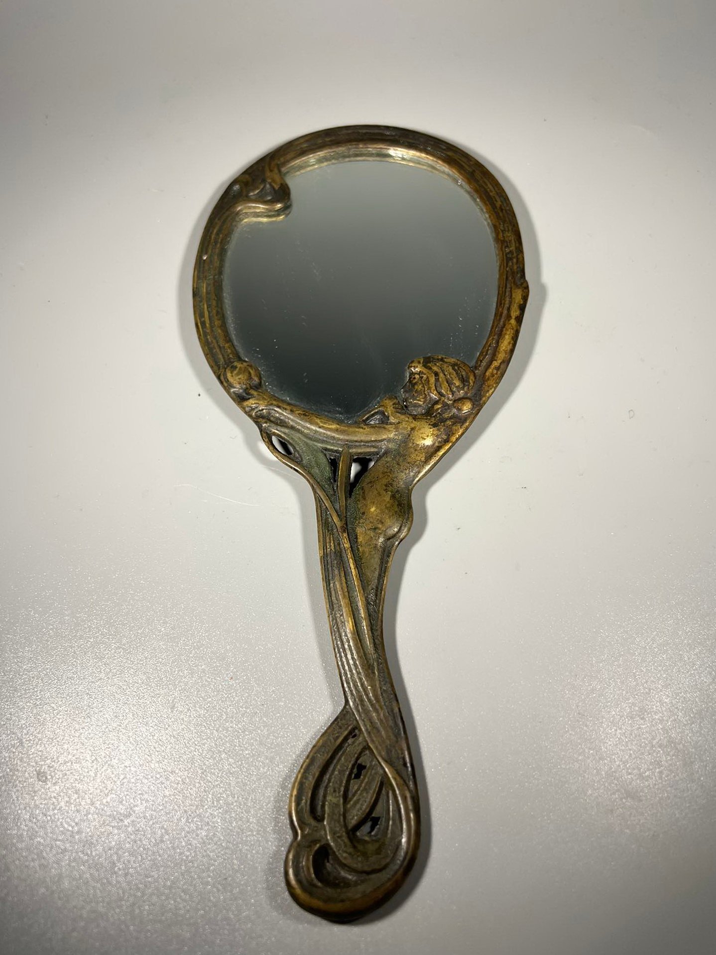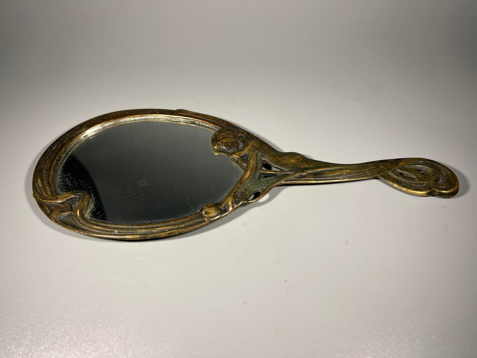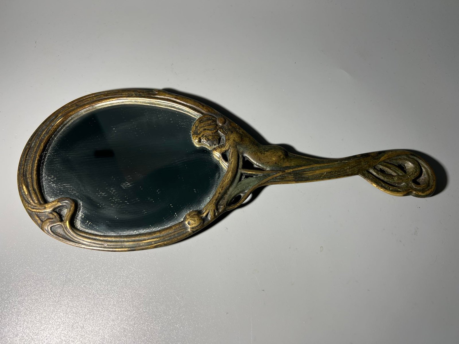 Veidrodėlis su rankena, veidrodis rankinis, bronzinis, antikvarinis, Art Nouveau stiliaus. Kaina 63