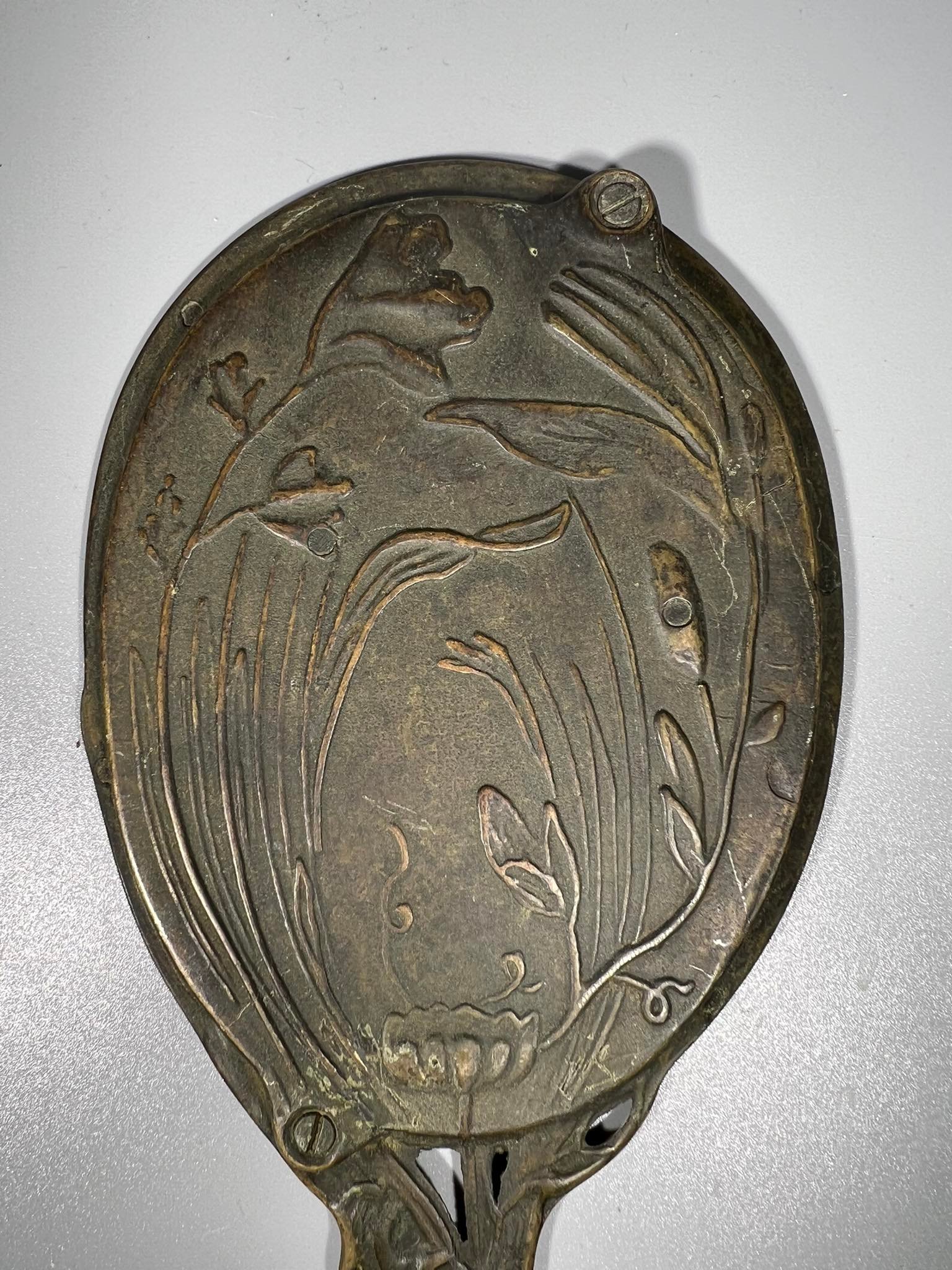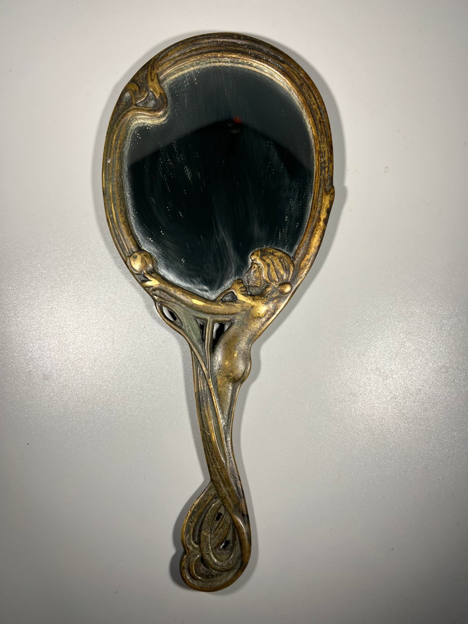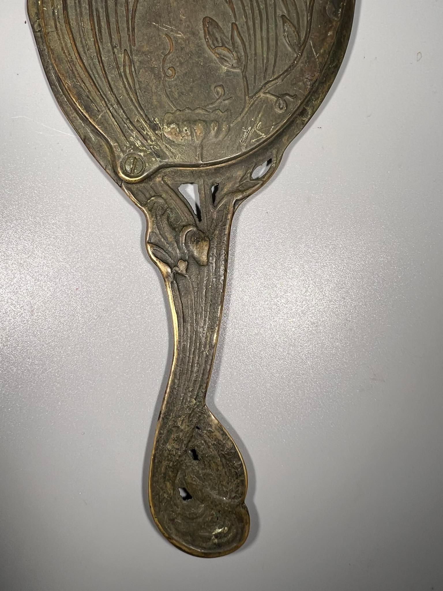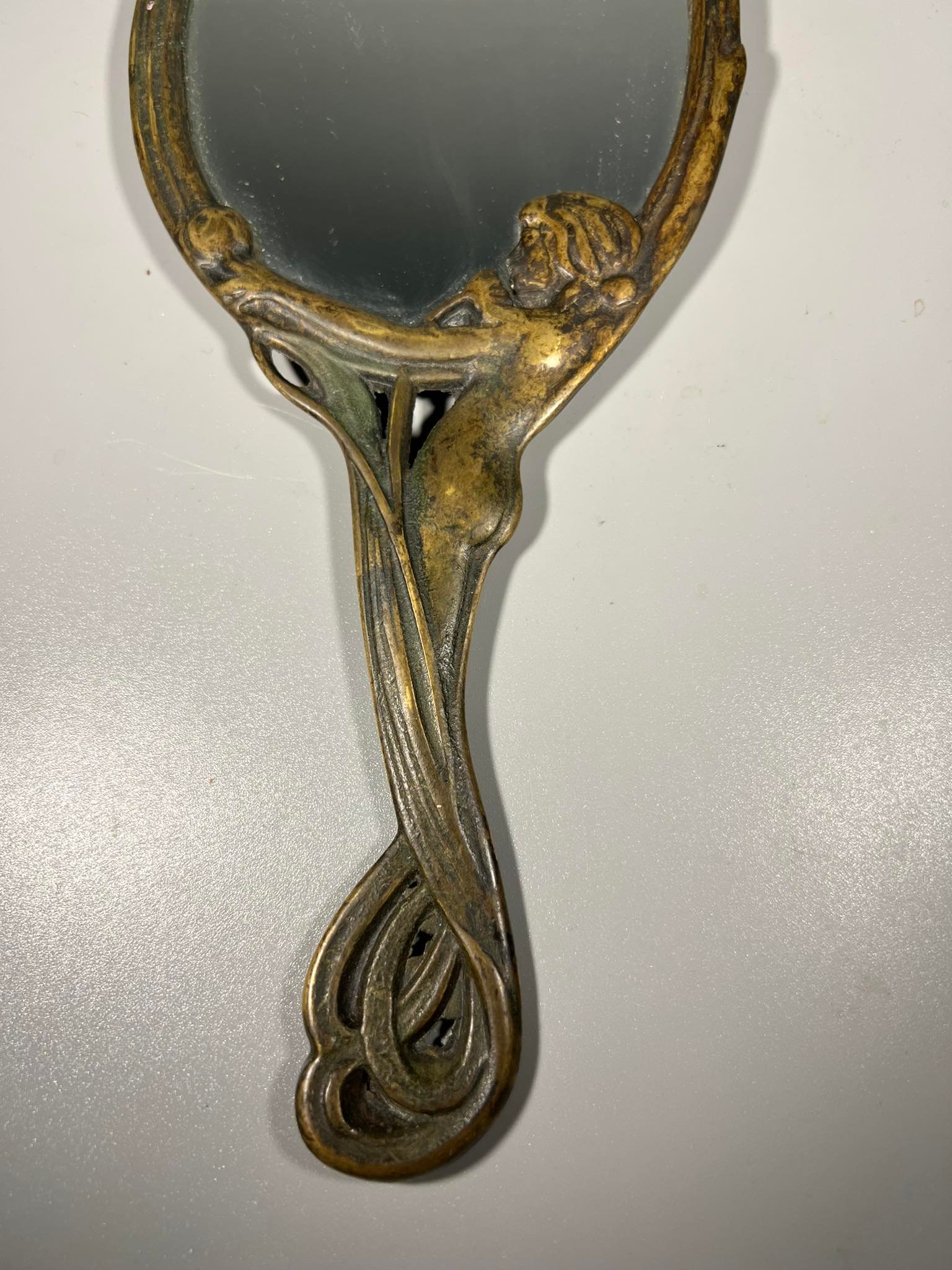 Veidrodėlis su rankena, veidrodis rankinis, bronzinis, antikvarinis, Art Nouveau stiliaus. Kaina 63