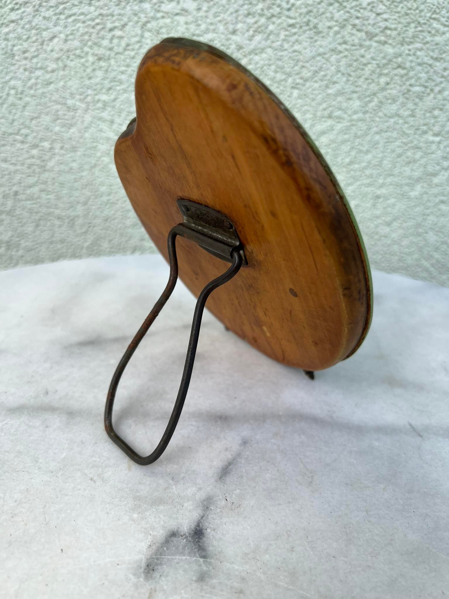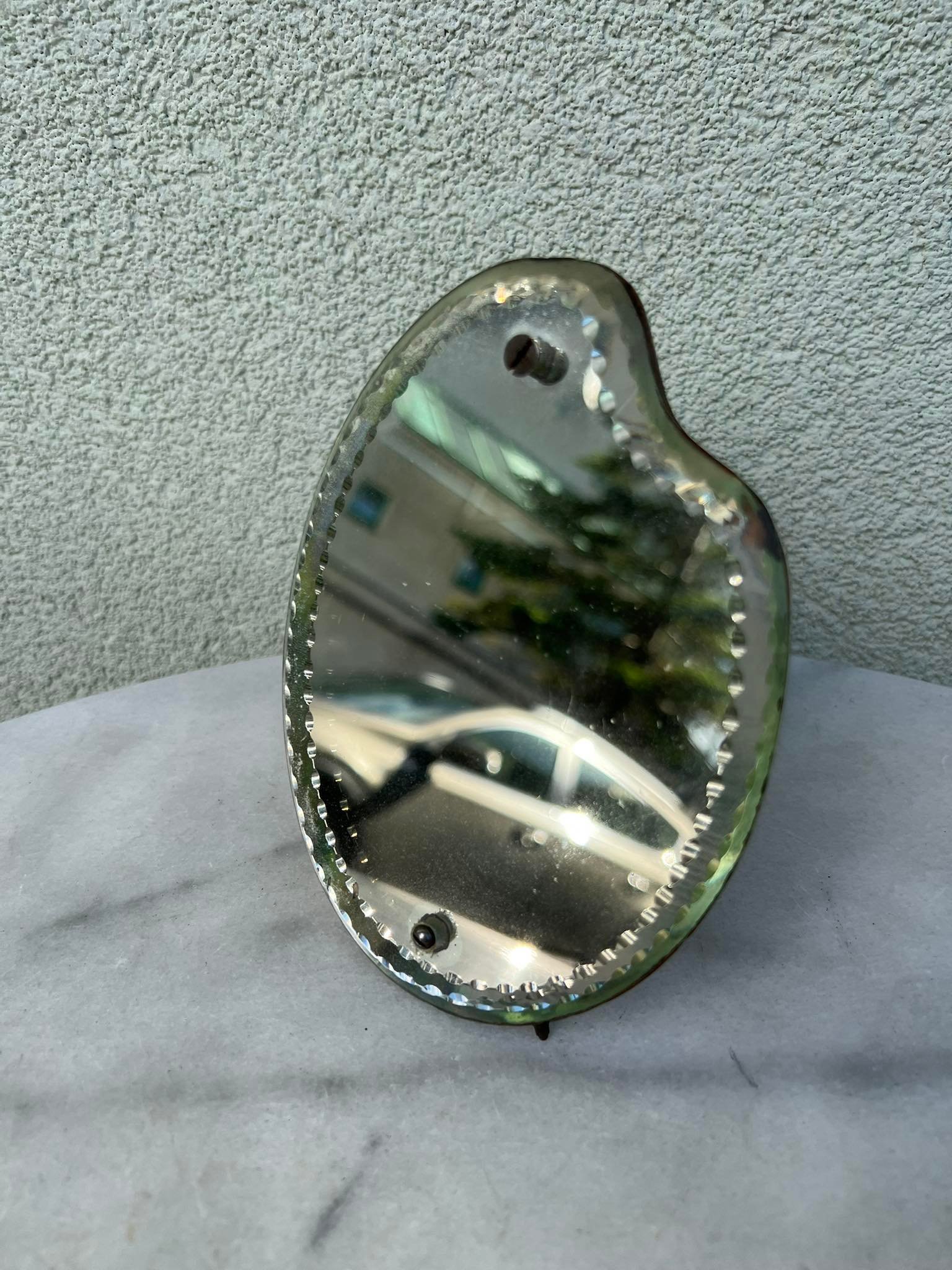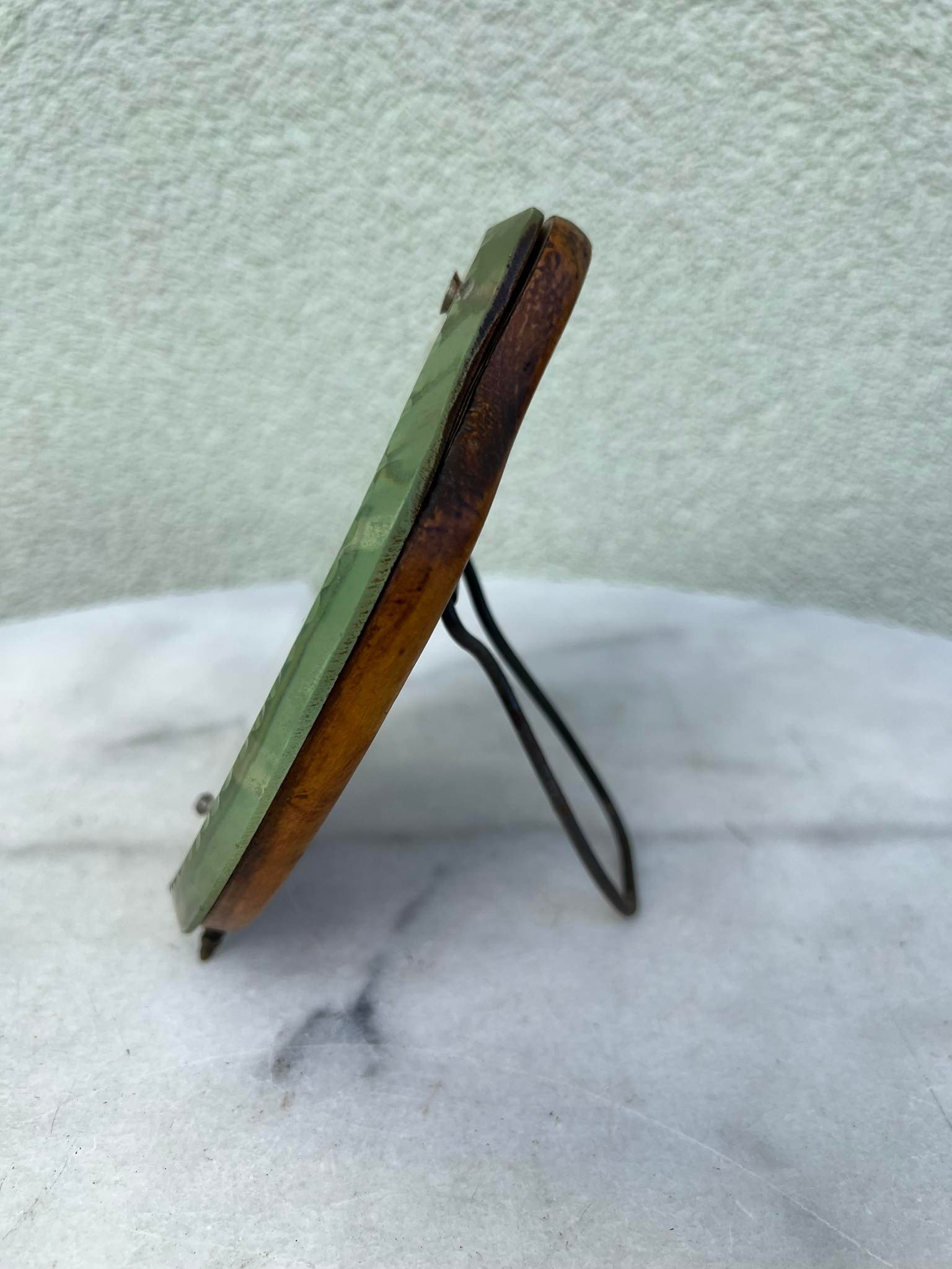 Veidrodėlis antikvarinis, facetuotu stiklu. Dydis: 12 x 15 cm. Visiškai tinkamas naudojimui pagal paskirtį. Kaina 43