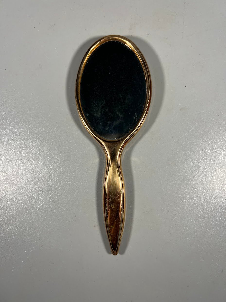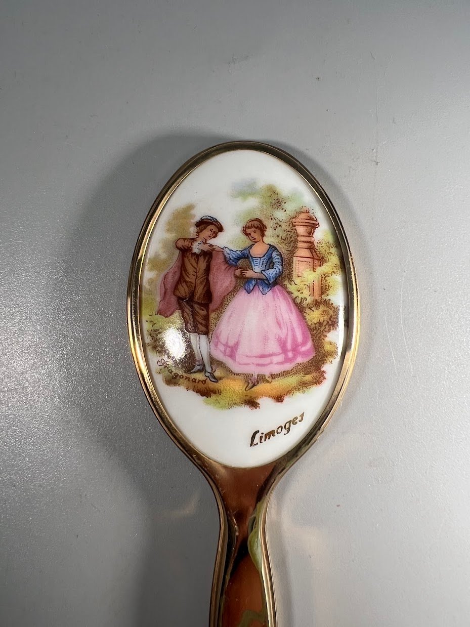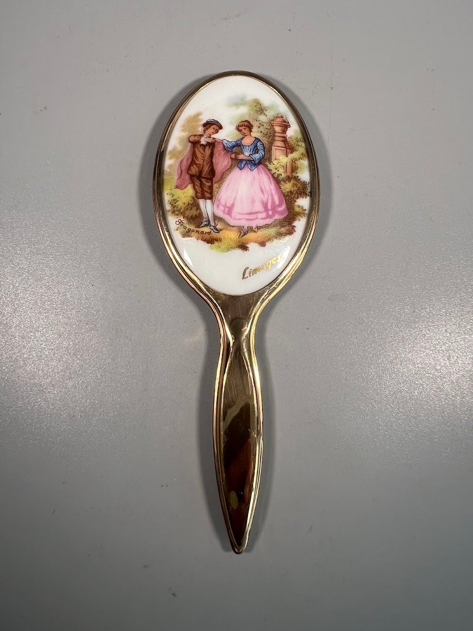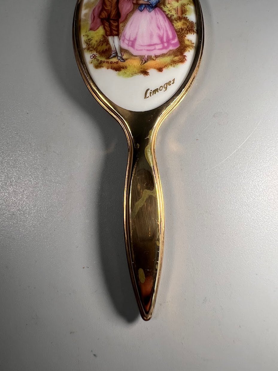 Vintažinis bronzinis ir Limožo porcelianinis veidrodis. Veidrodžio kitoje pusėje pavaizduota romantiška scena iš Fragonardo kūrinių. Romantiški, subtilūs ir rafinuoti vaizdai perteikti švelniais pasteliniais tonais.