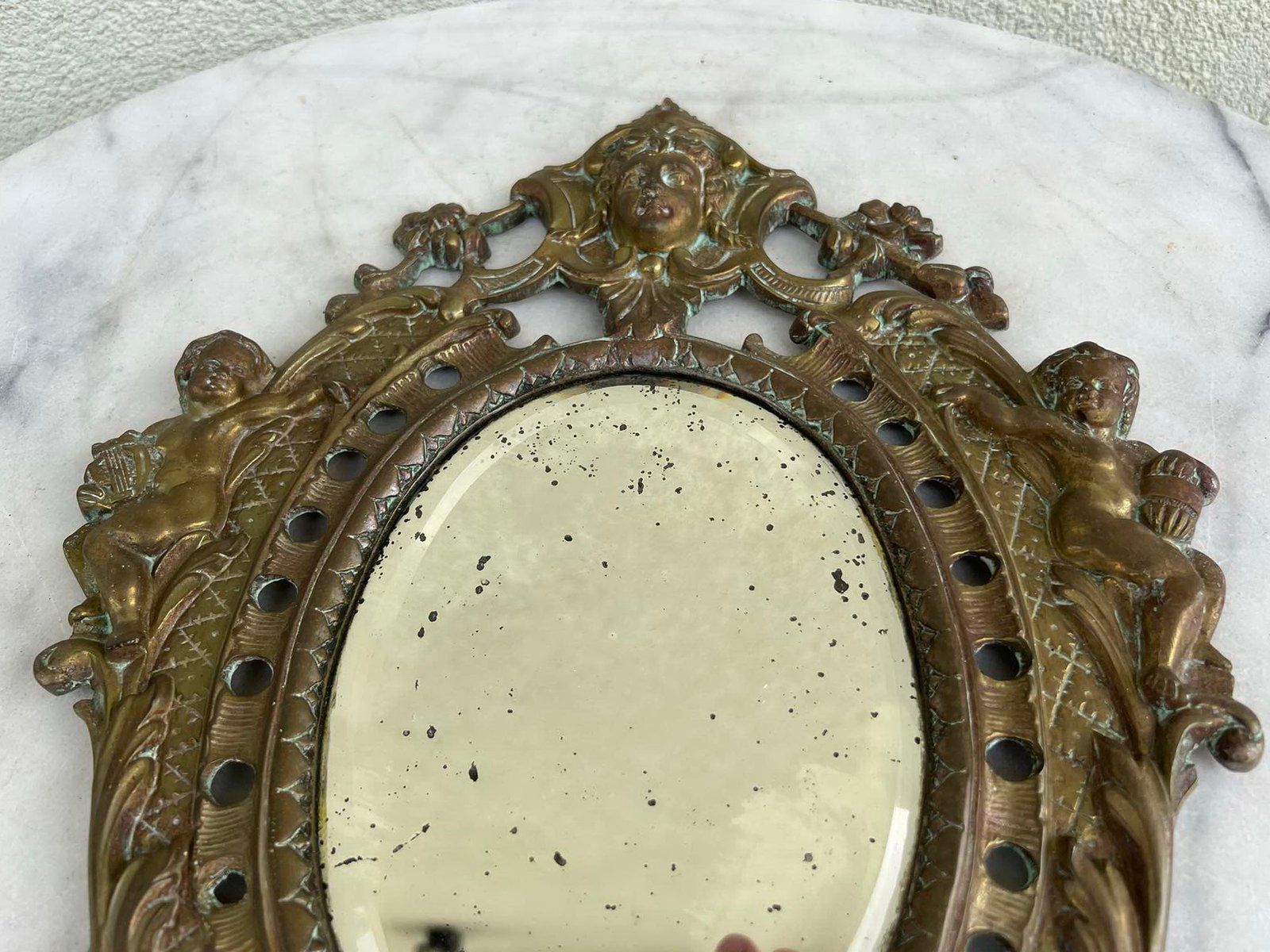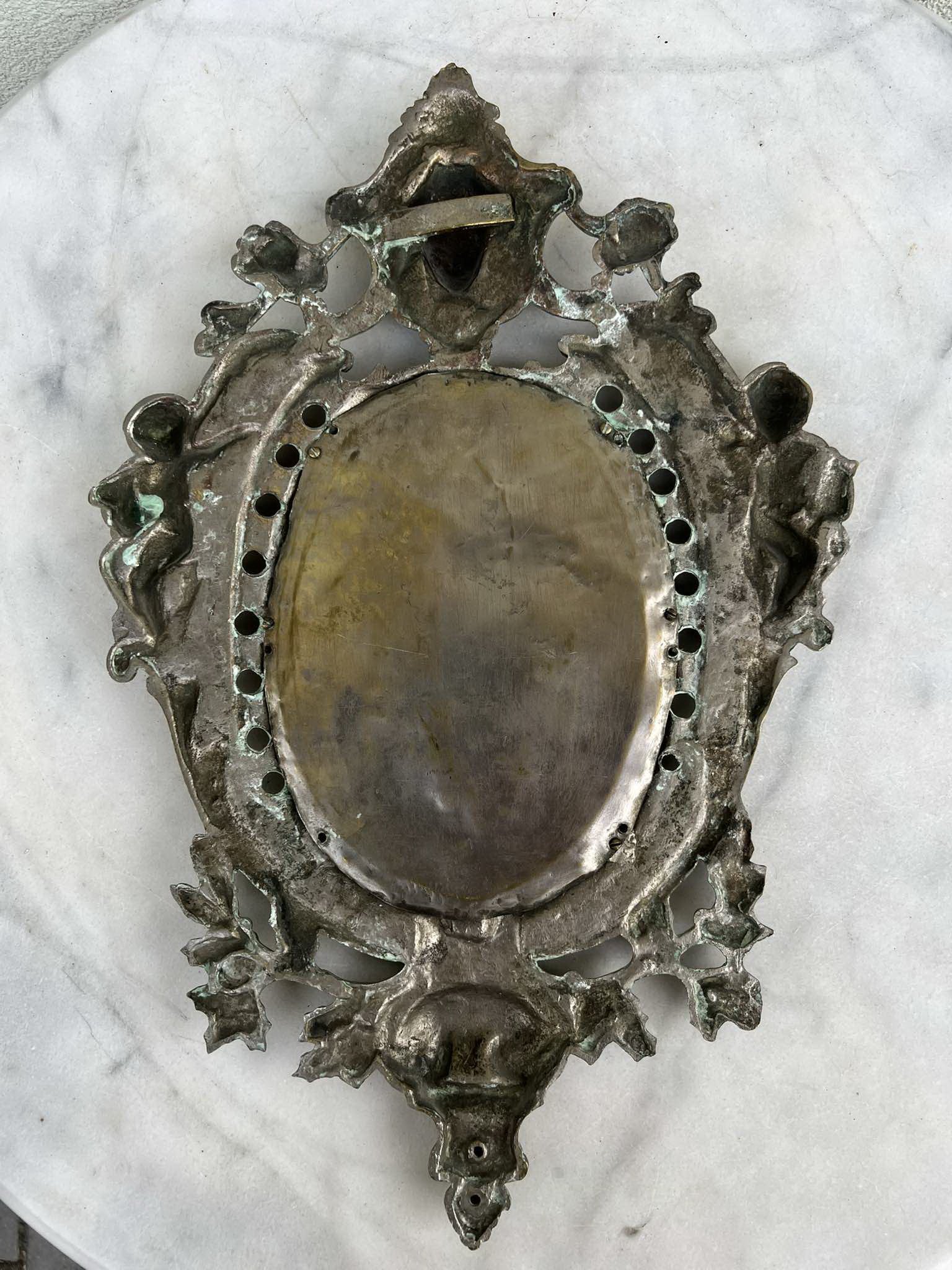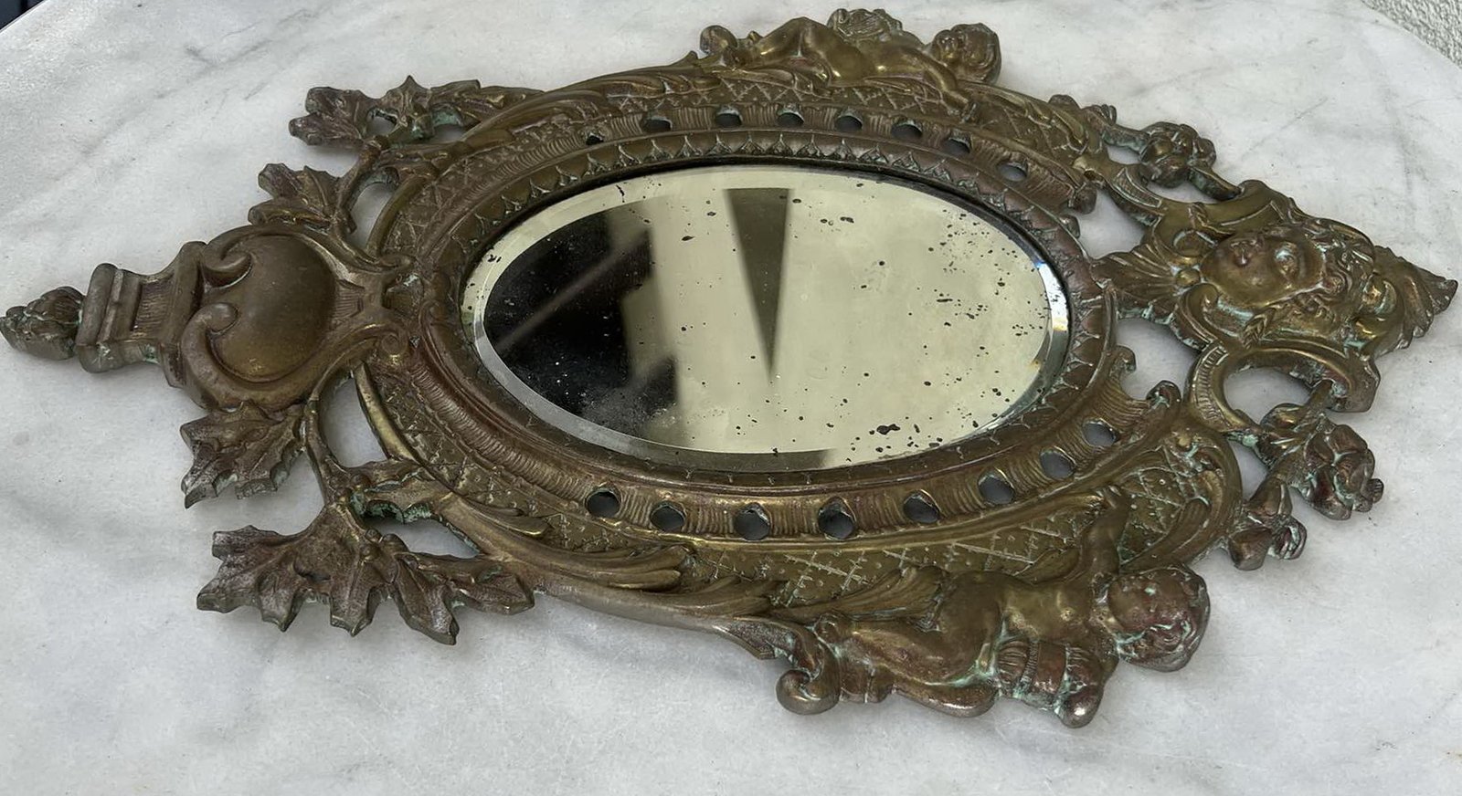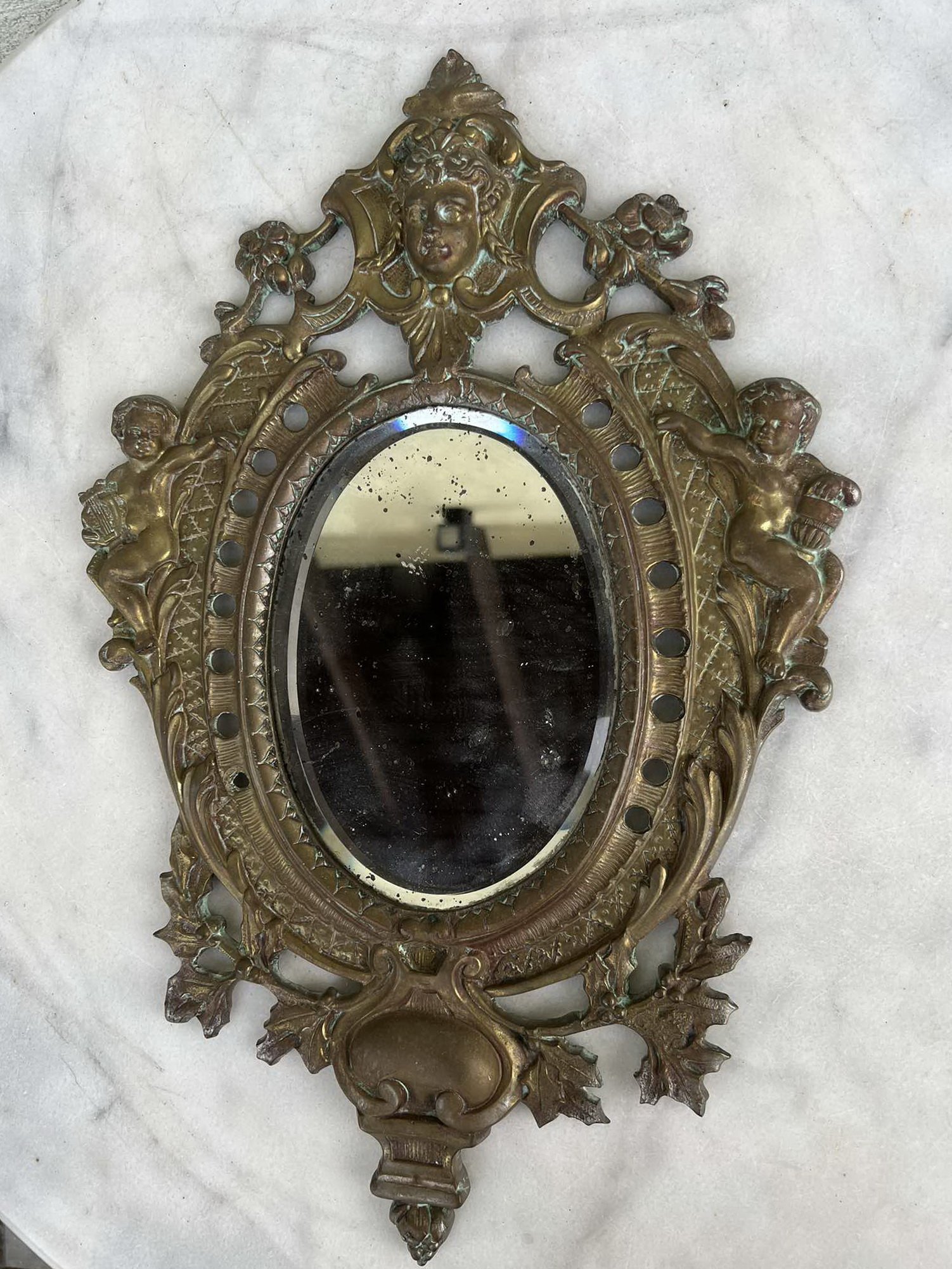 Veidrodis antikvarinis, žalvarinis, puoštas angelų figūromis, prancūziškas. XIX a. Svoris 2 kg. Kaina 93