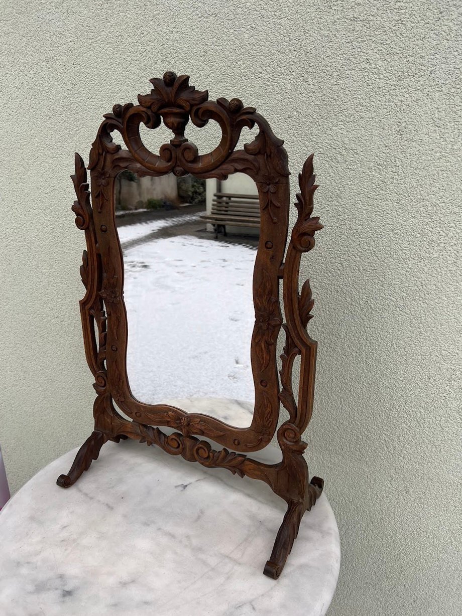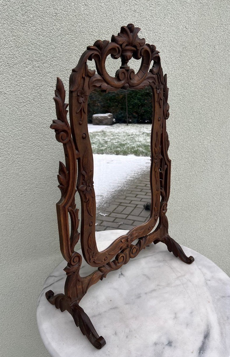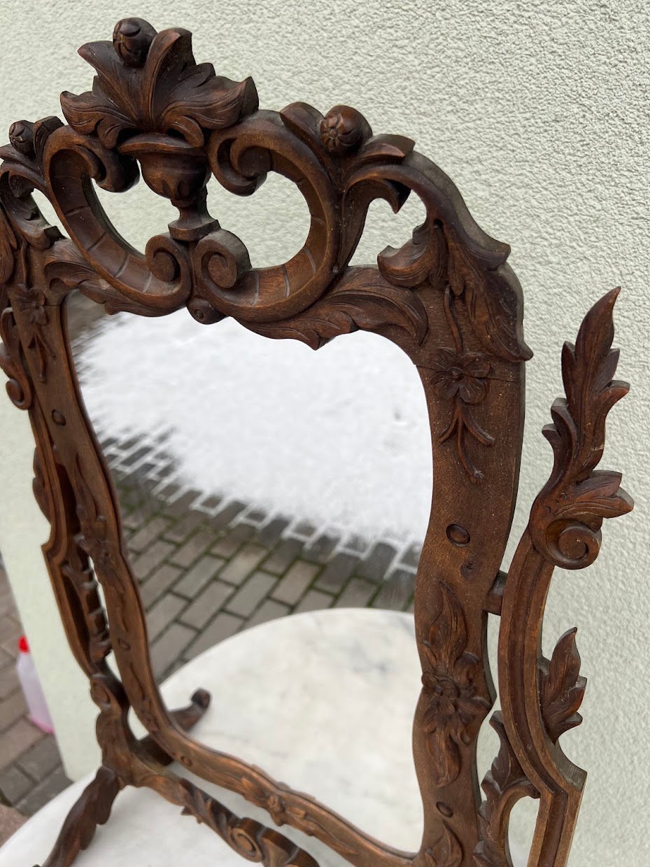 Veidrodis medinis, antikvarinis, stalinis, pasatatomas, puoštas gausiais drožiniais. Viso aukštis 70, plotis 45 cm. Stklas: 25 x 40 cm. Kaina 187