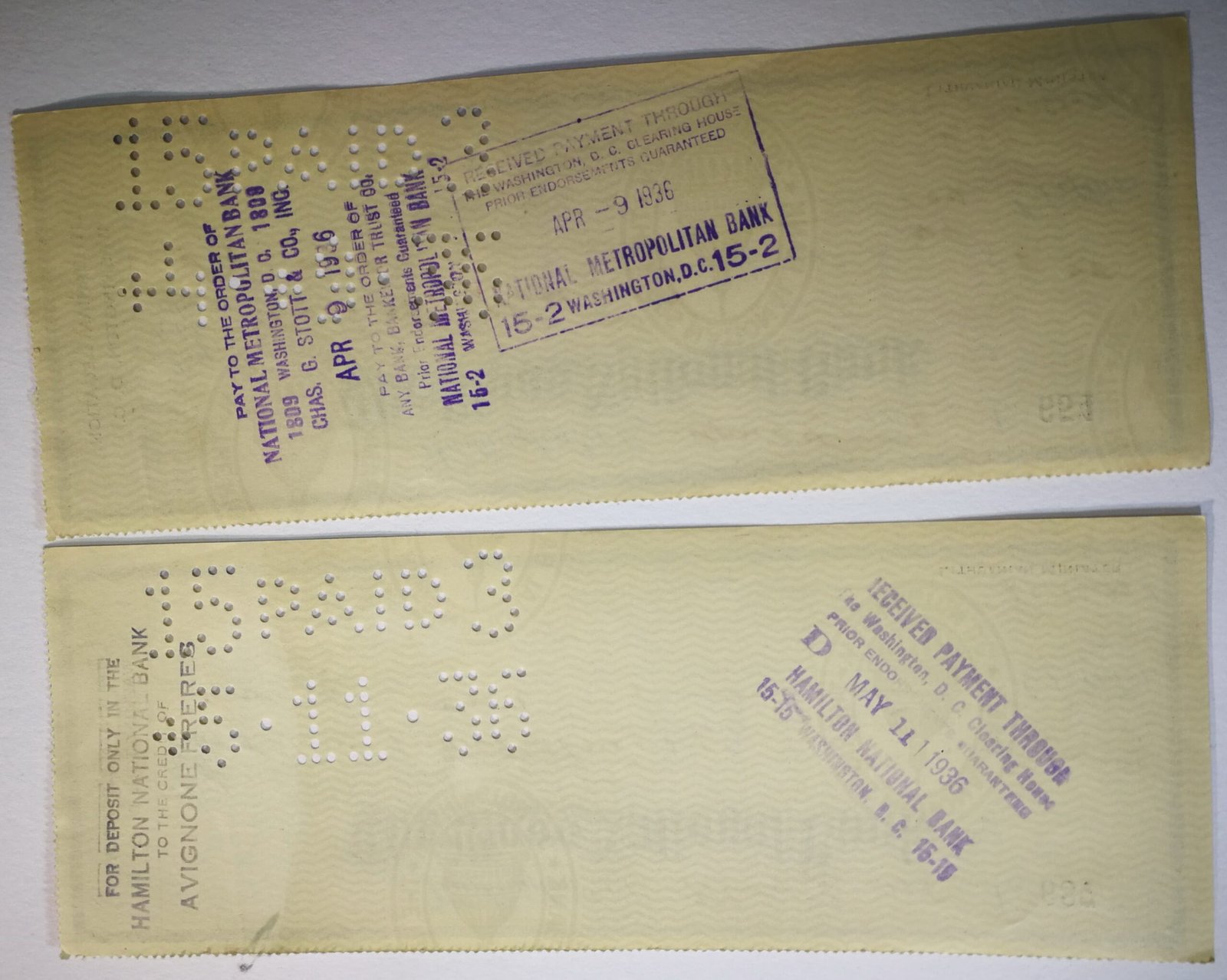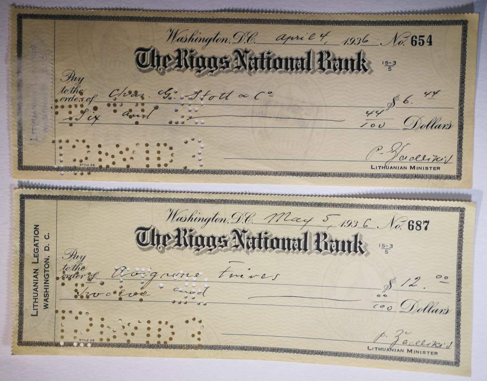 Vekseliai, čekiai, išduoti tarpukariu, Lietuvos pasiuntinybės Vašingtone. 2 vnt. Kaina po 10