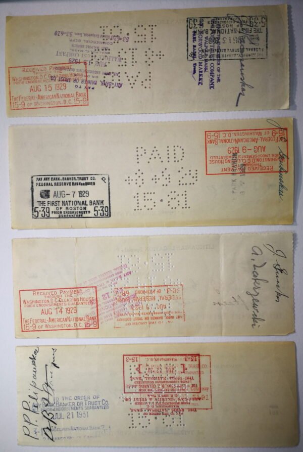 Vekseliai, čekiai, išduoti tarpukariu, Lietuvos pasiuntinybės Vašingtone. 4 vnt. Dydis: 21 x 8 cm. Kaina po 10