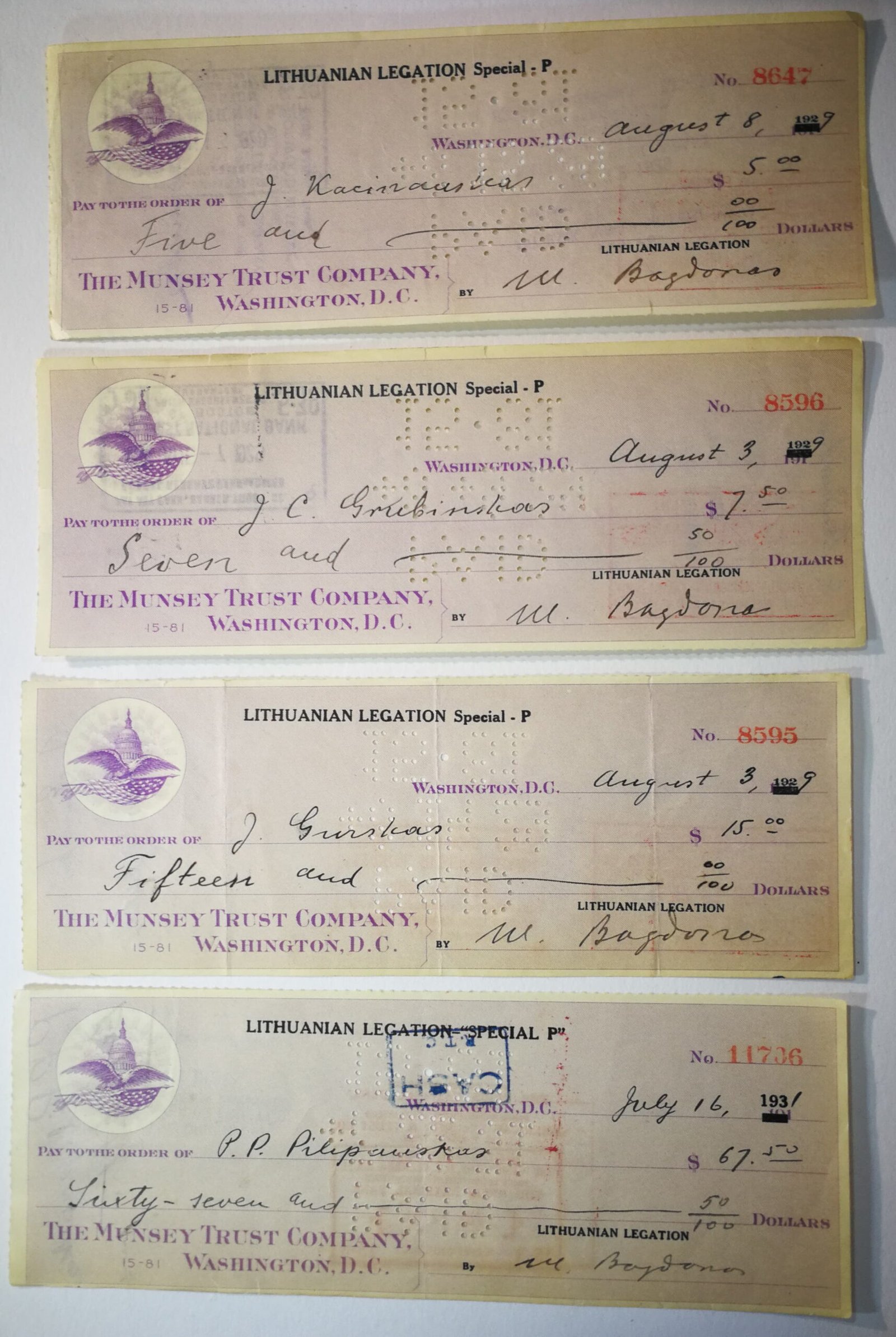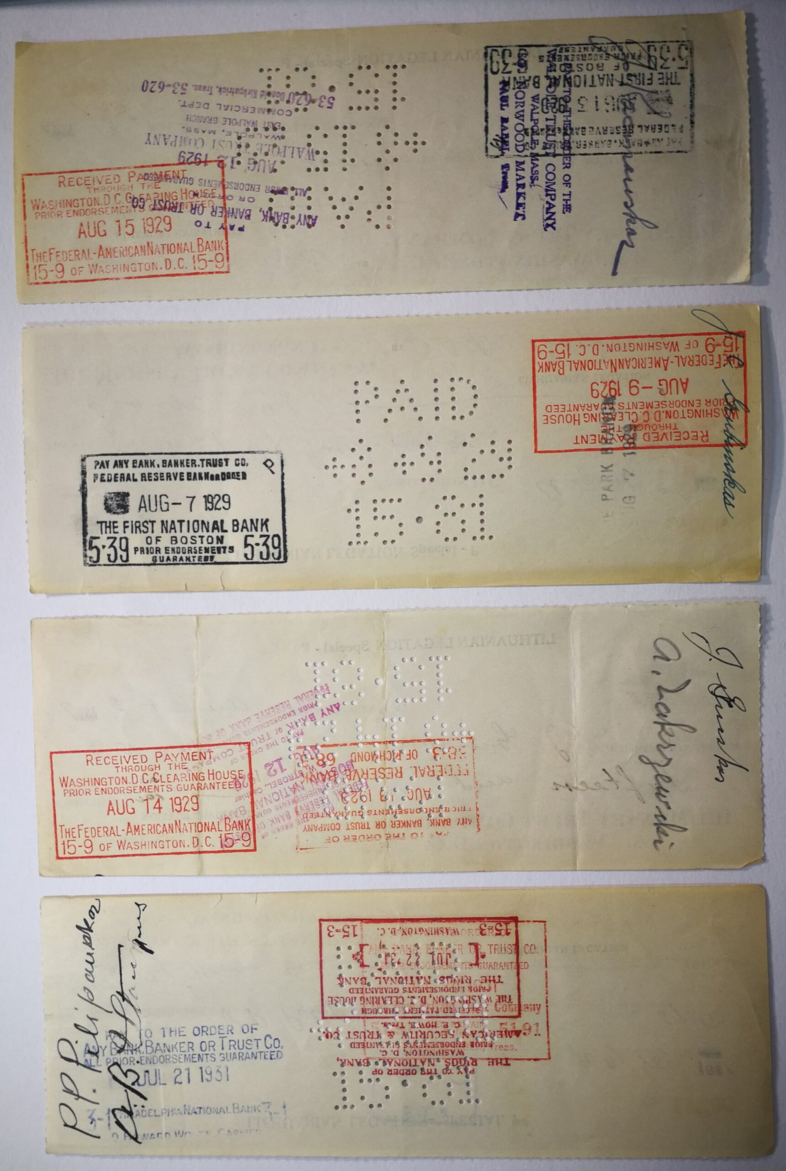 Vekseliai, čekiai, išduoti tarpukariu, Lietuvos pasiuntinybės Vašingtone. 4 vnt. Dydis: 21 x 8 cm. Kaina po 8