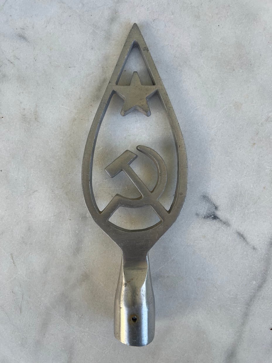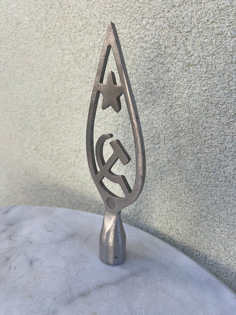 Vėliavos antgalis aliuminis, sovietinis, tarybinių laikų. Aukštis 26 cm. Kaina 32