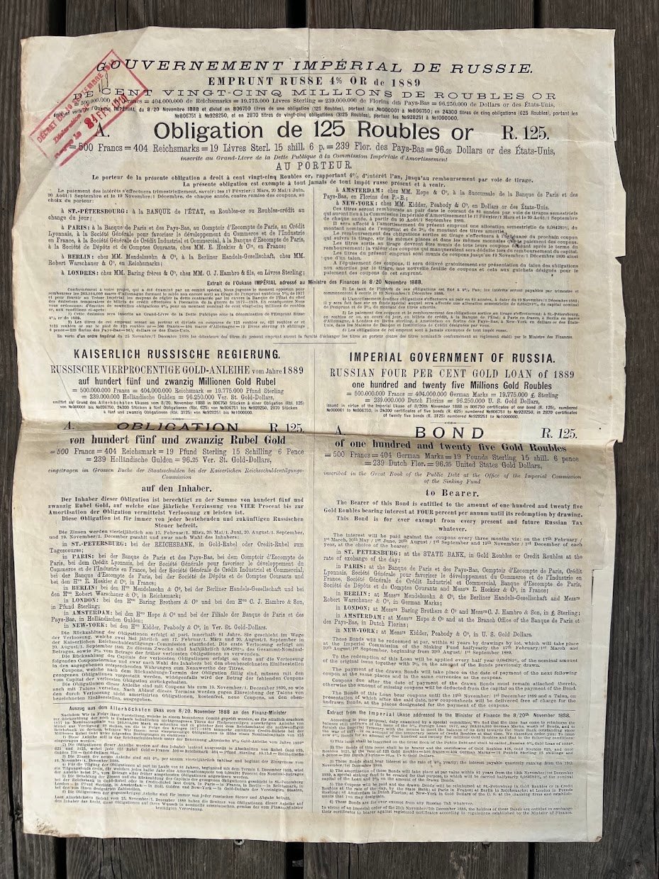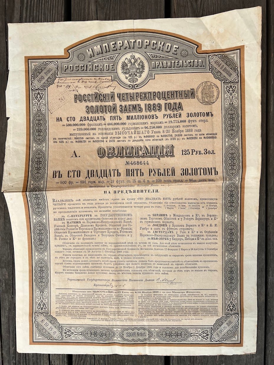 Vertybinis popierius – 1889 m. Rusijos Imperijos aukso paskolos obligacija skirta tarptautinei rinkai. Облигация в 125 рублей золотом. Российский 3½ % золотой заем 1894 года. 4 vnt. Kaina po 33