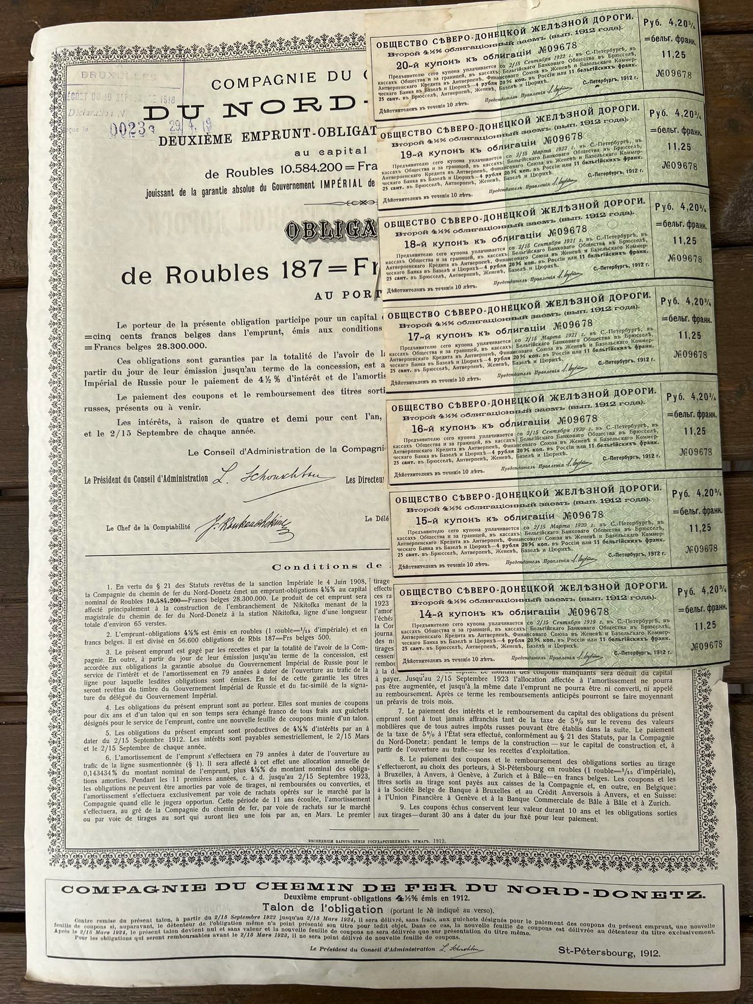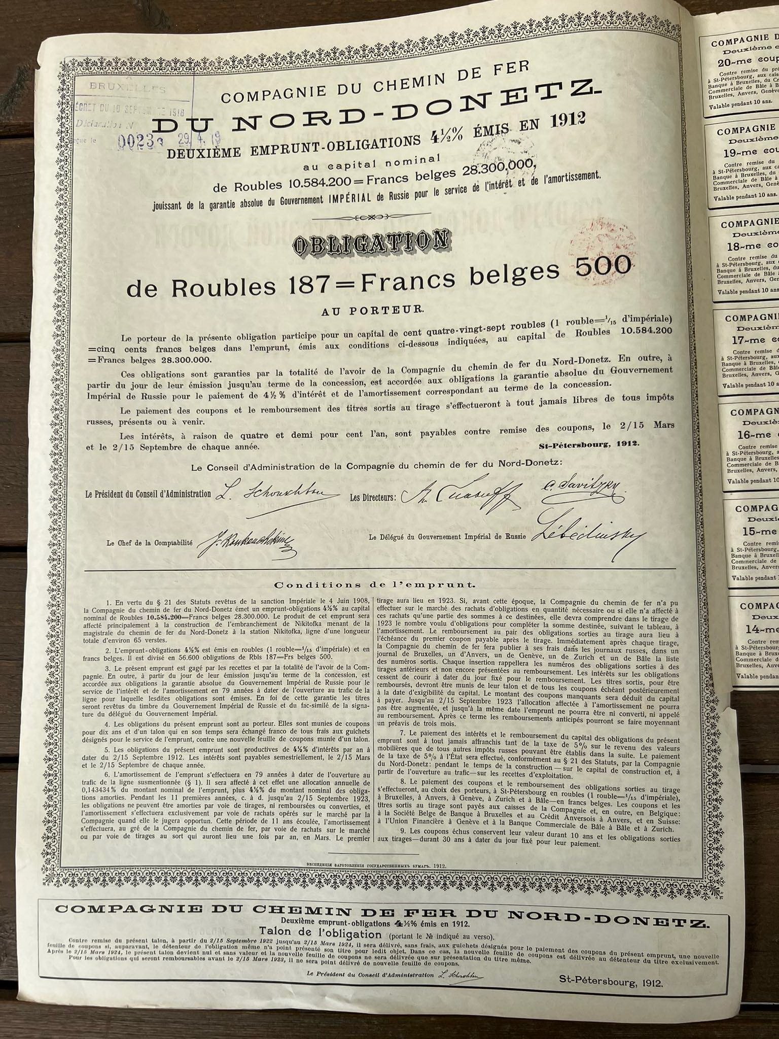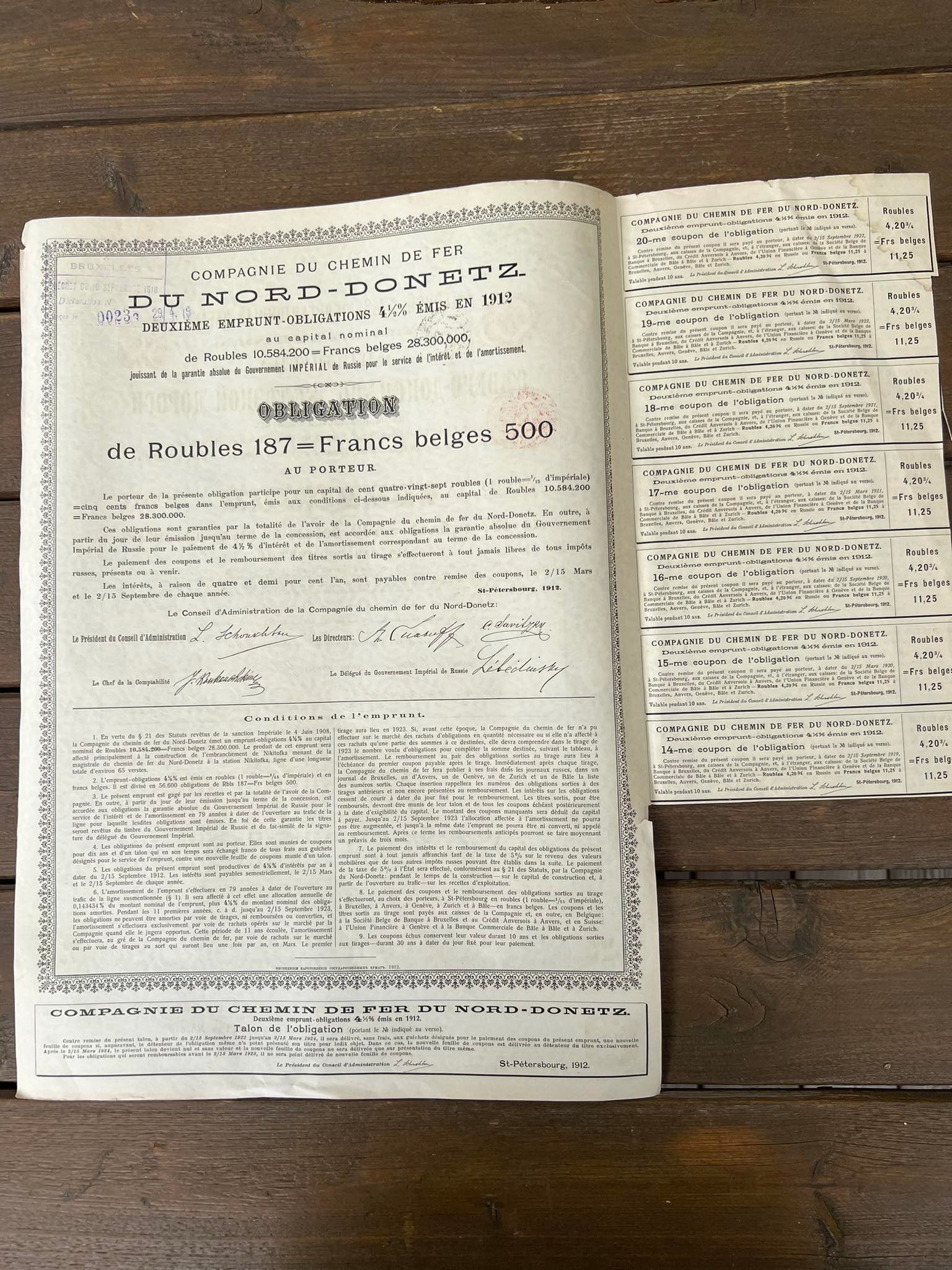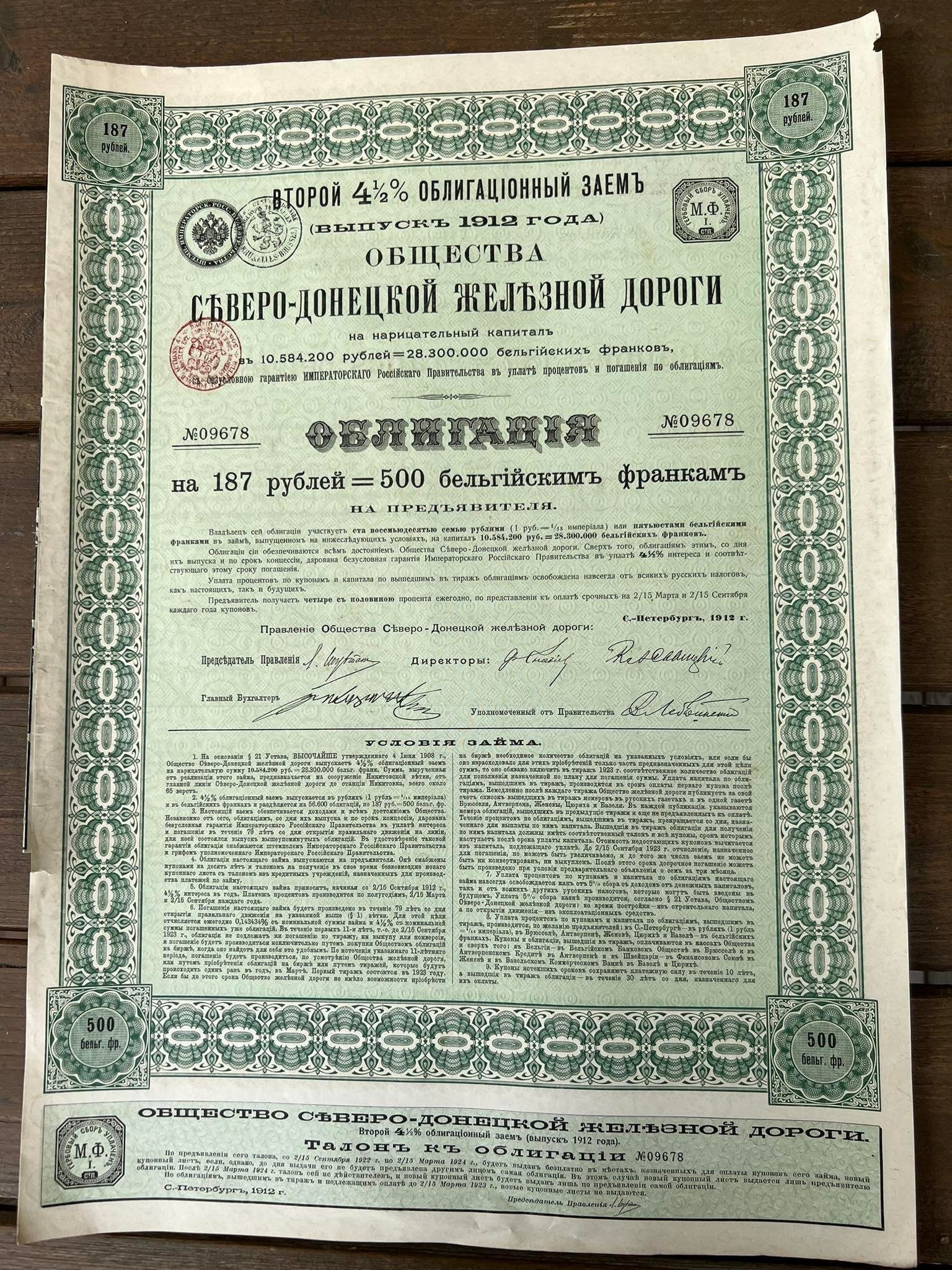 Vertybinis popierius – 1912 m. Carinės Rusijos obligacija Severo-Donecko geležinkelio, Северо-Донецкая железная дорога. Облигация в 187 рублей. Dydis: 31 x 45 cm. Originalas. Kaina 32