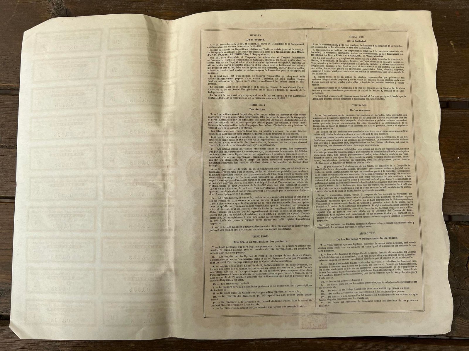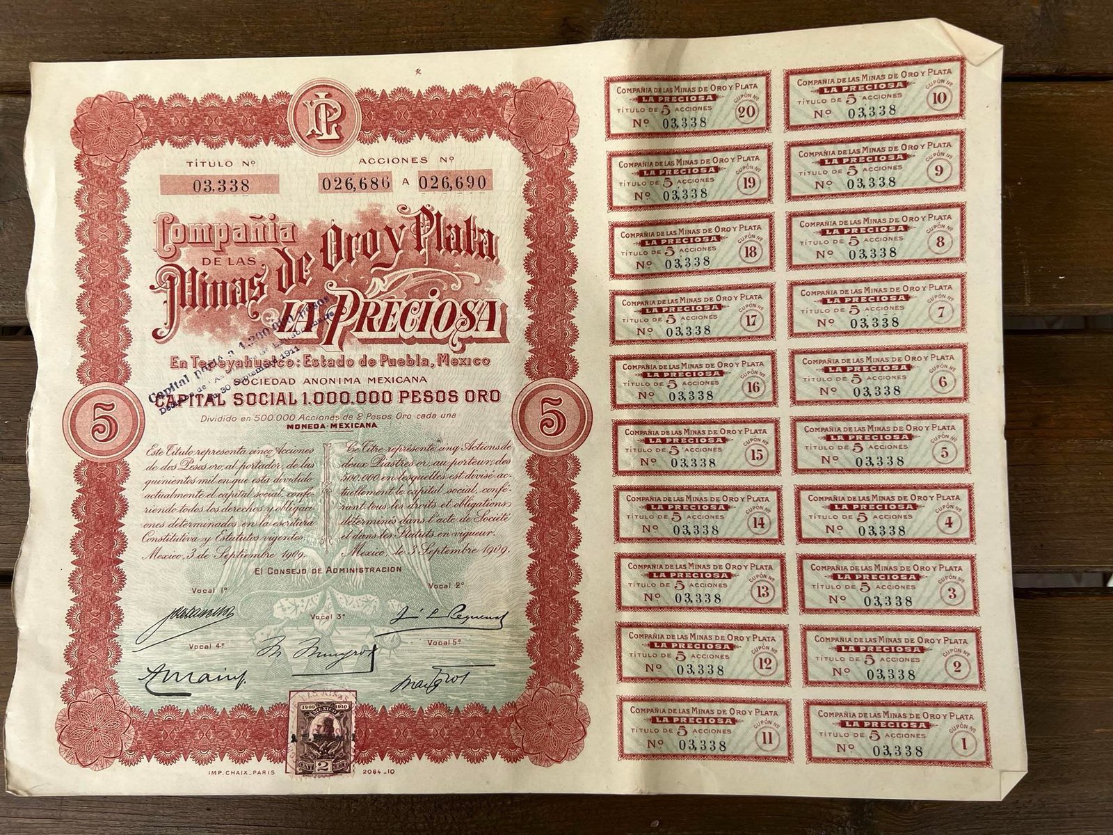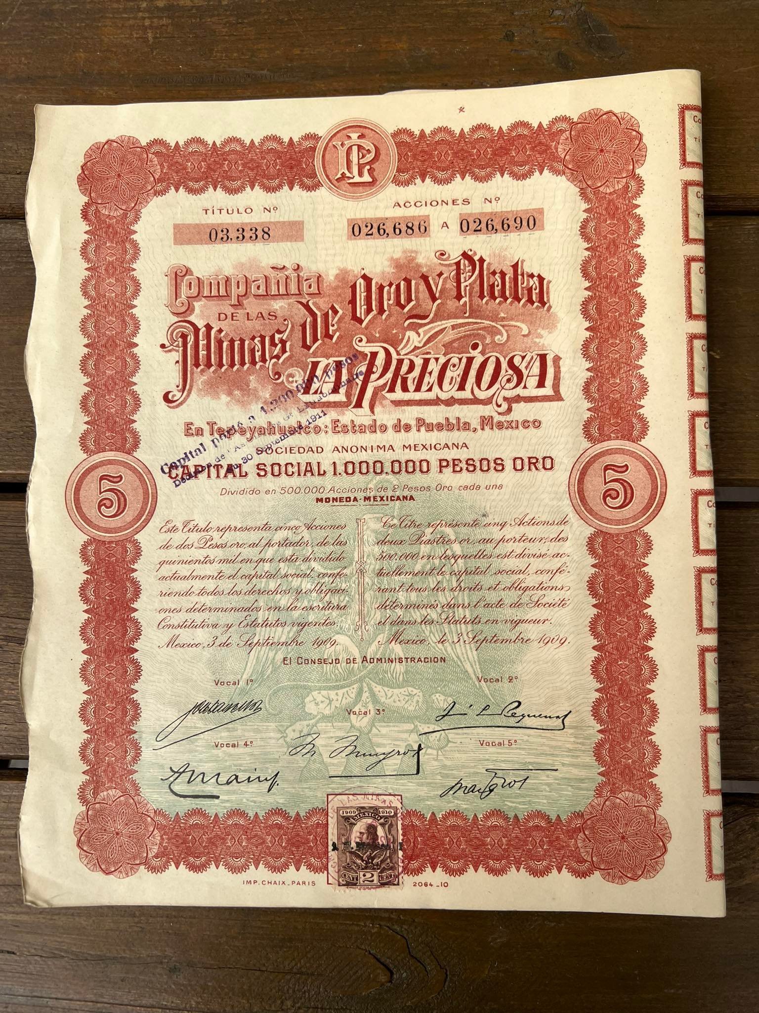 Vertybinis popierius - obligacija, 1909 m. Meksika. Capital Social 1.000.000 Pesos oro. Mexico. Dydis: 36 x 28 cm. Kaina 28Vertybinis popierius – obligacija, 1909 m. Meksika. Capital Social 1.000.000 Pesos oro. Mexico. Dydis: 36 x 28 cm. Kaina 28