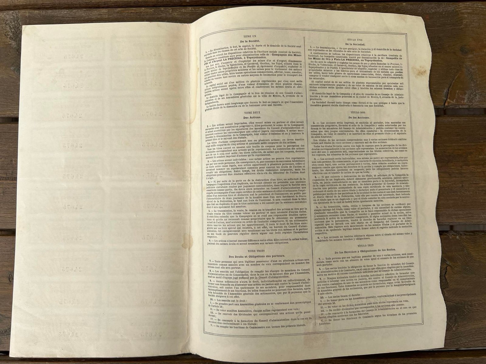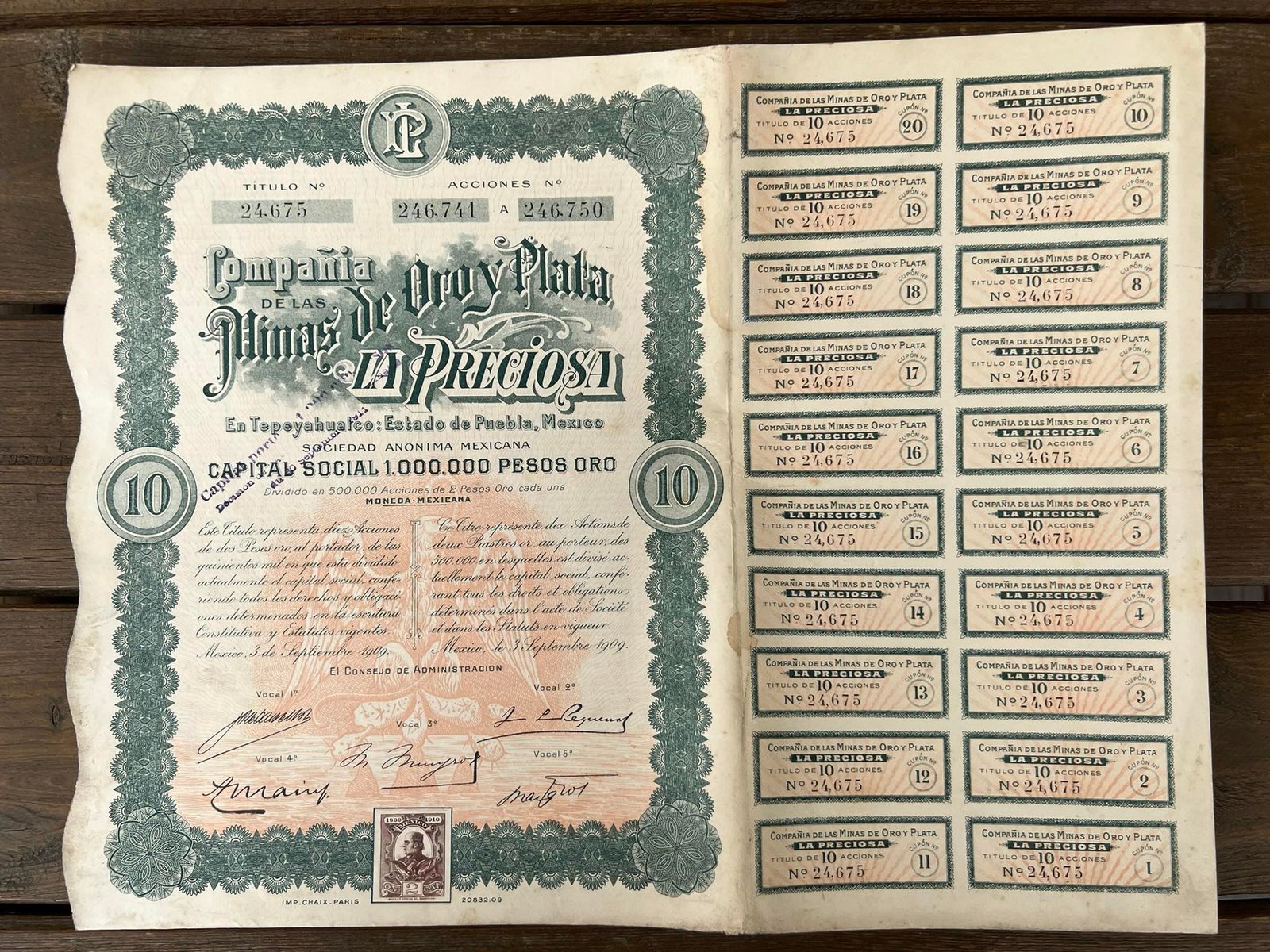 Vertybinis popierius – obligacija, 1909 m. Meksika. Capital Social 1.000.000 Pesos oro. Mexico. Dydis: 36 x 28 cm. Kaina 28