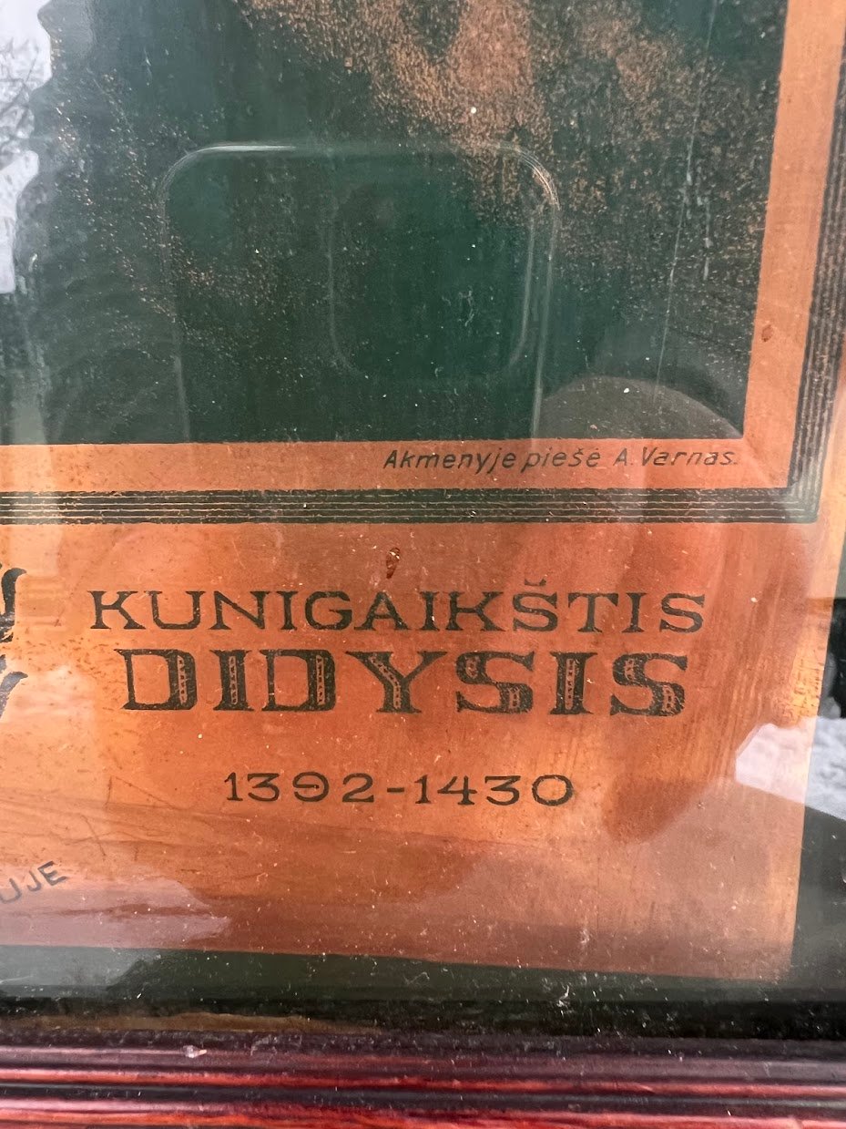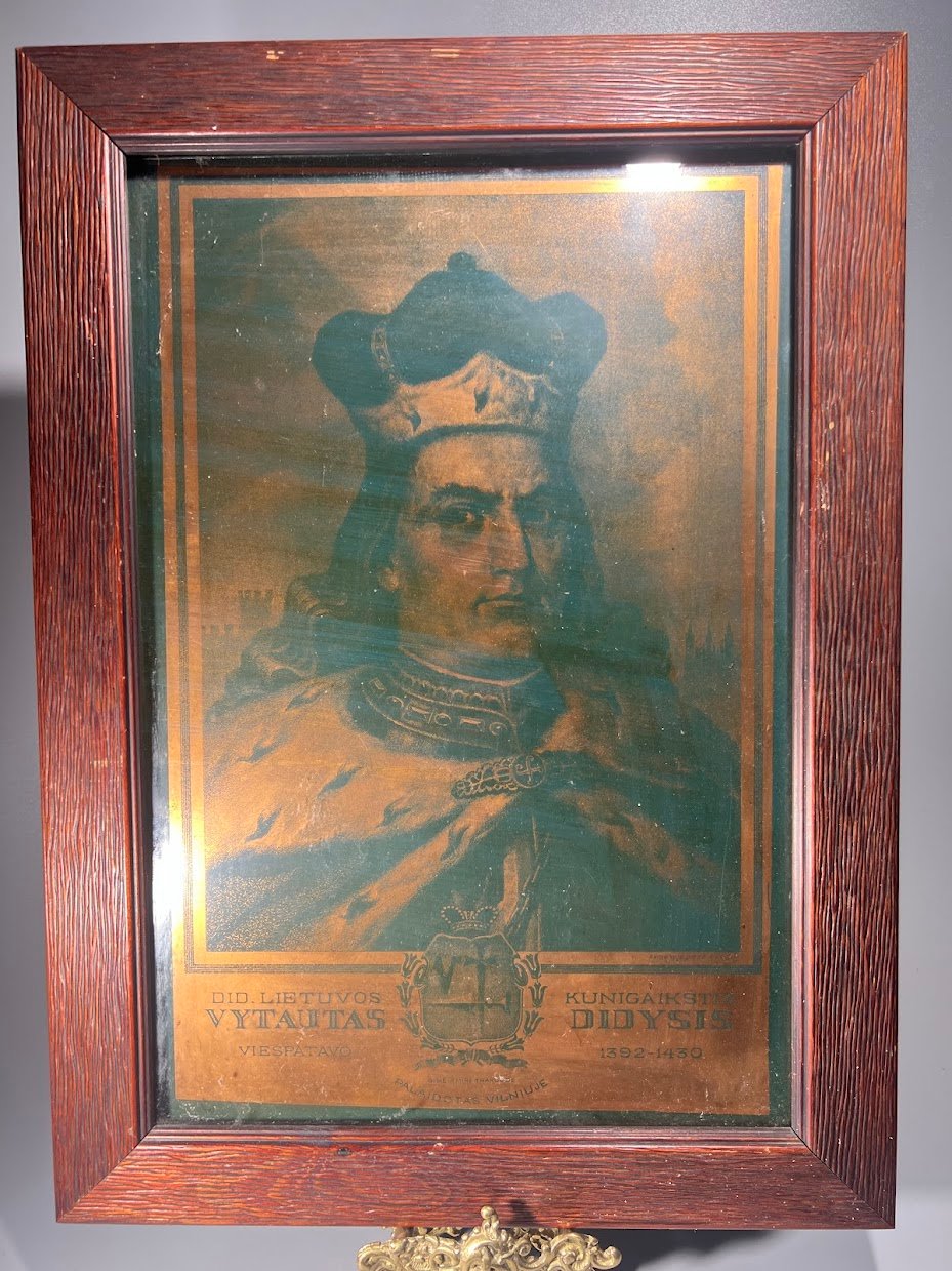 Vytauto Didžiojo litografija, atspausdinta ant skardos lakšto antikvariniame mediniame rėmelyje su stiklu. Adomas Varnas. Kaina 178