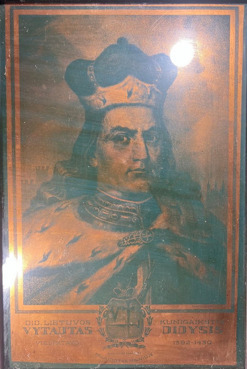 Vytauto Didžiojo litografija, atspausdinta ant skardos lakšto antikvariniame mediniame rėmelyje su stiklu. Adomas Varnas. Išorinis rėmelio dydis: 35 x 48 cm. Kaina 178