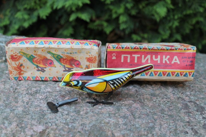 Žaislas mechaninis – skardinis paukštis prisukamas rakteliu tarybinių laikų. Veikiantis. 4 vnt. Originalioje dėžutėje, nenaudotas. Ilgis 11, aukstis 5 cm. Kaina po 26