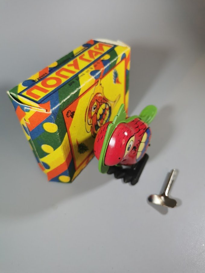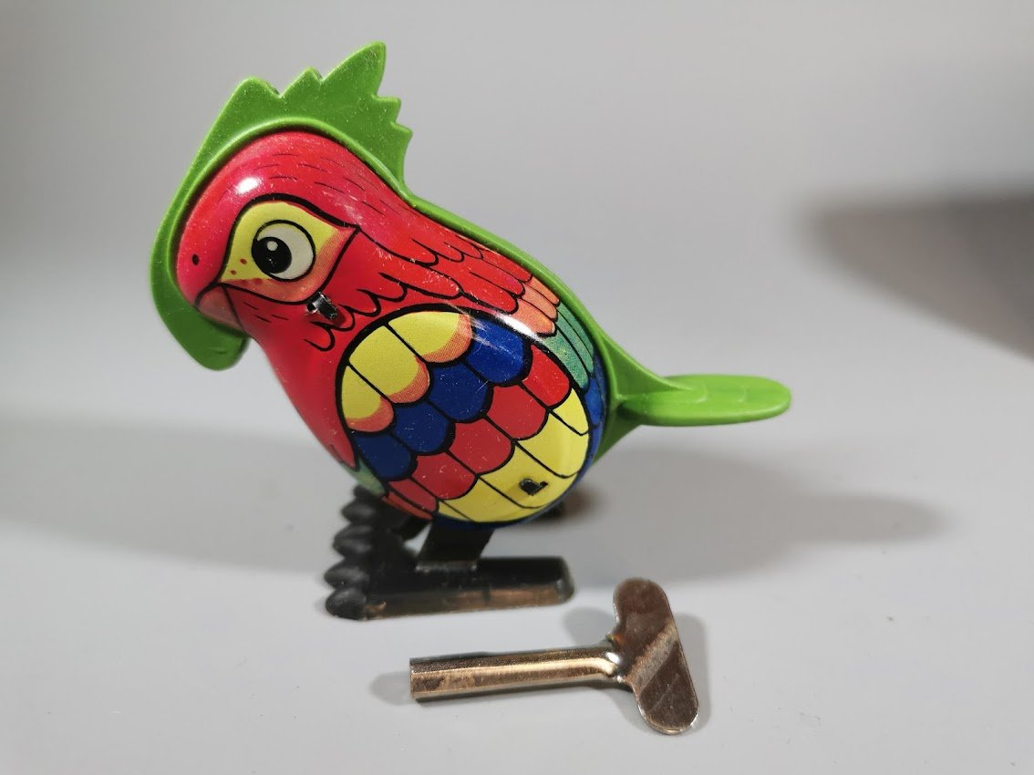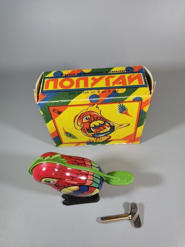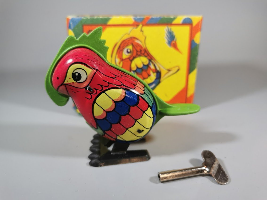 Žaislas skardinis prisukamas rakteliu – papūga, tarybinių laikų, originalioje dėžutėje, nenaudotas. Veikiantis. 6 vnt. Kaina po 32