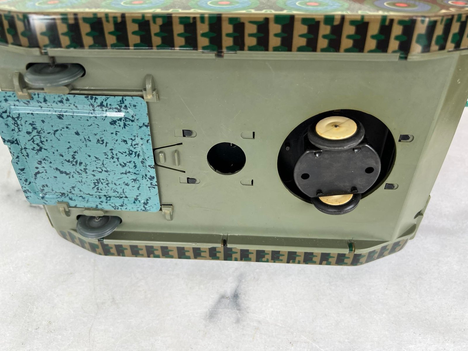 Žaislas – skardinis sovietinis tankas tarybinių laikų. Ilgis 34, plotis 15 cm. Kaina 63
