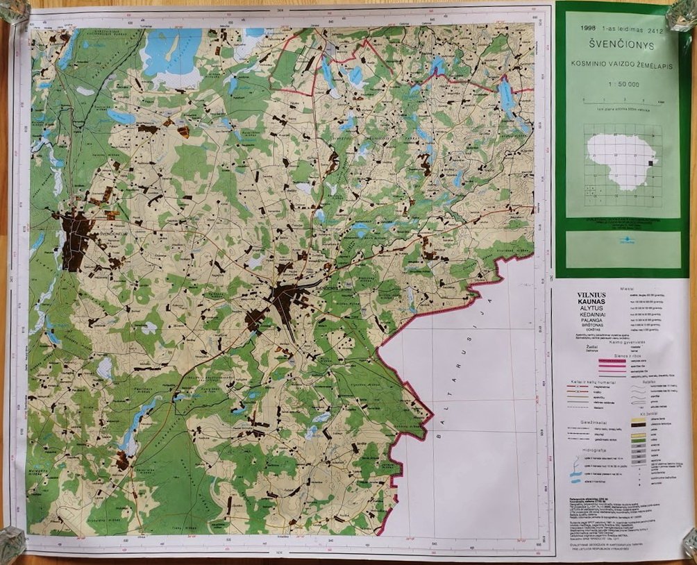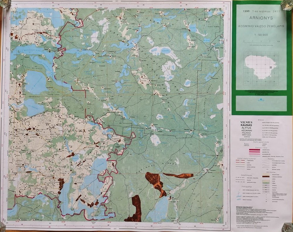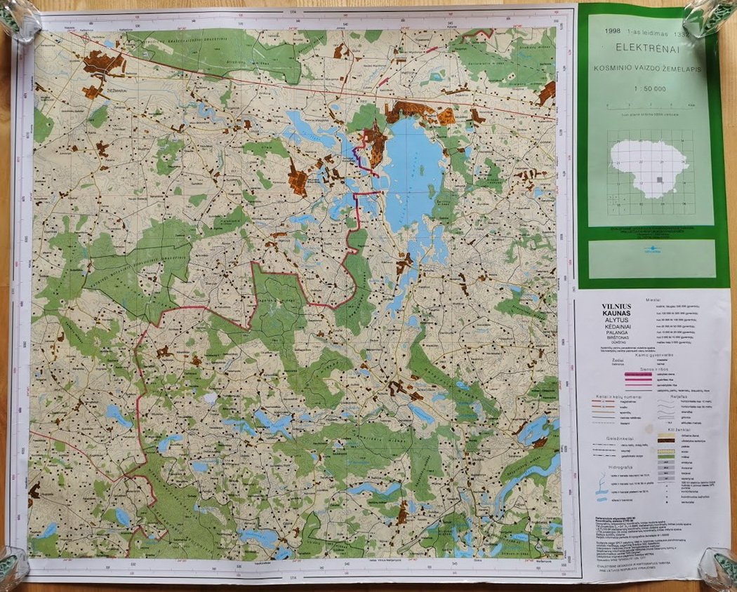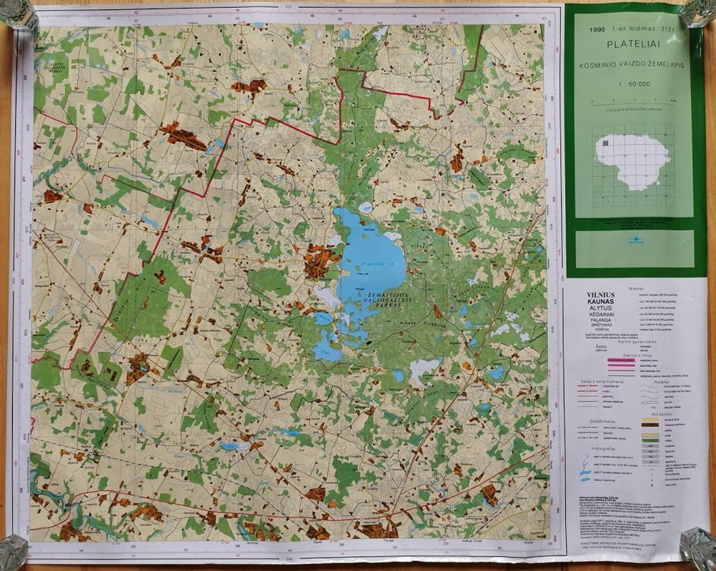 Žemėlapiai, 1998 m. Kosminio vaizdo žemėlapiai laminuoti, 1-as leidimas: Jieznas, Elektrėnai, Plateliai, Švenčionys, Arimonys. Dydis: 54 x 68 cm. Kaina po 22