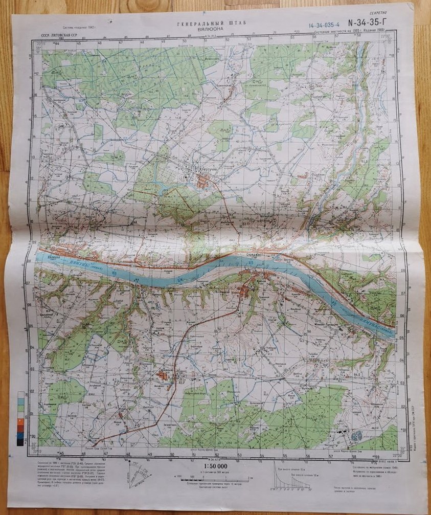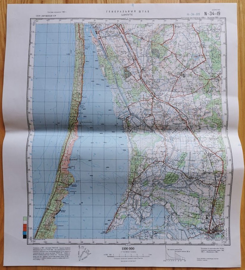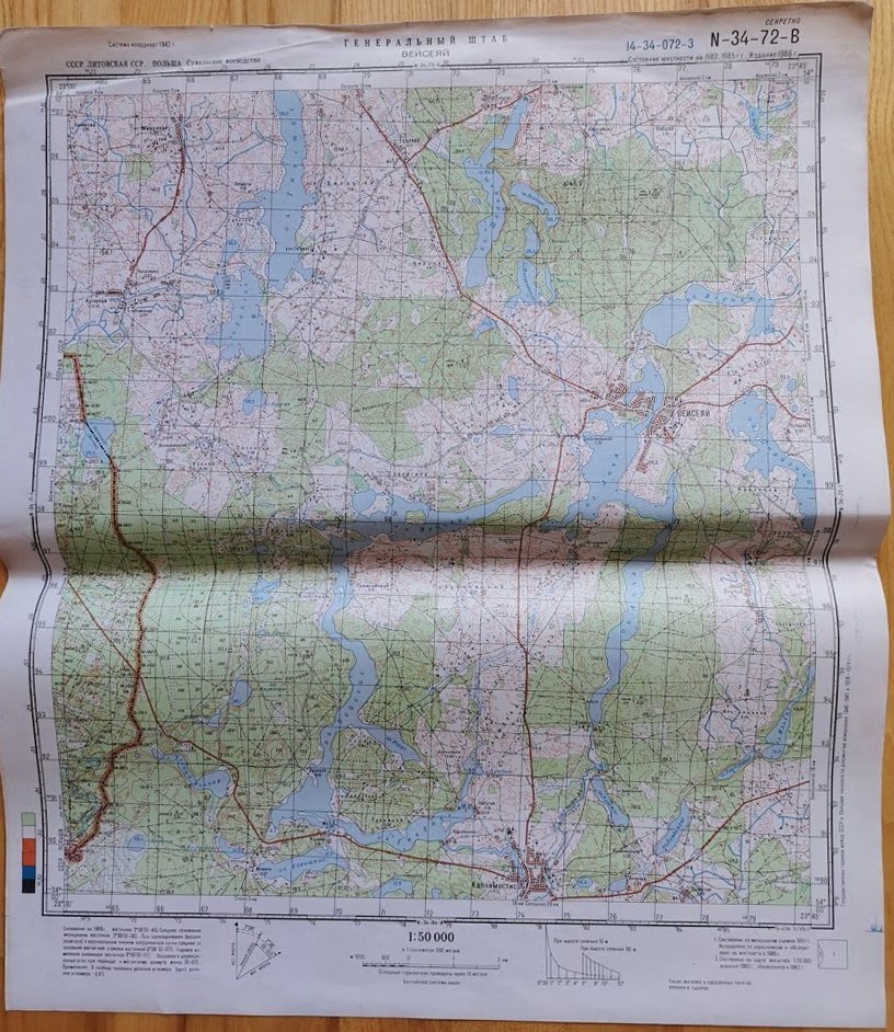 Žemėlapiai kariniai slapti topografiniai, ŠILUTĖ, RUSNĖ, VELIUONA, KRUONIS, VEISĖJAI, SEIRIJAI, KYBARTAI, BERŠTAI. Dydis: 38 x 45 cm. Rusų k. 1942 m. koordinačių sistema. Vietovės būklė 1985 m. Leidimas 1986 m. Kaina po 17