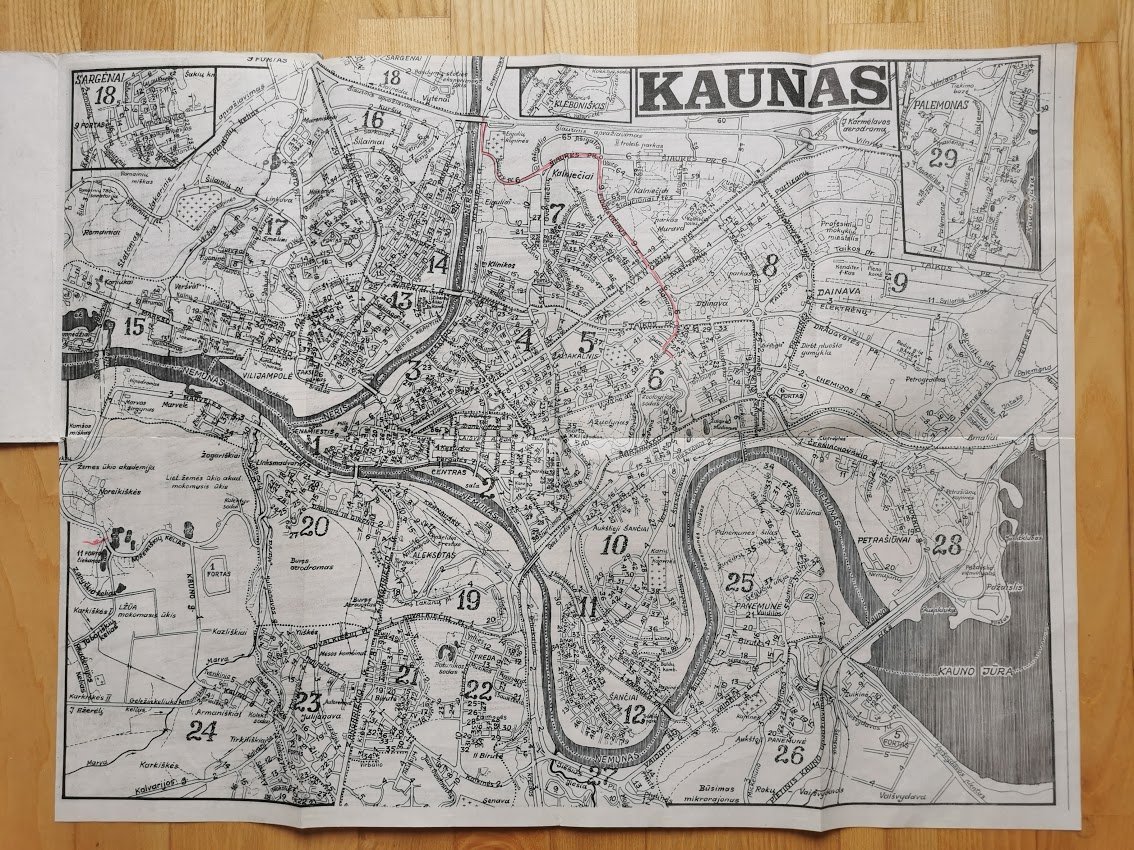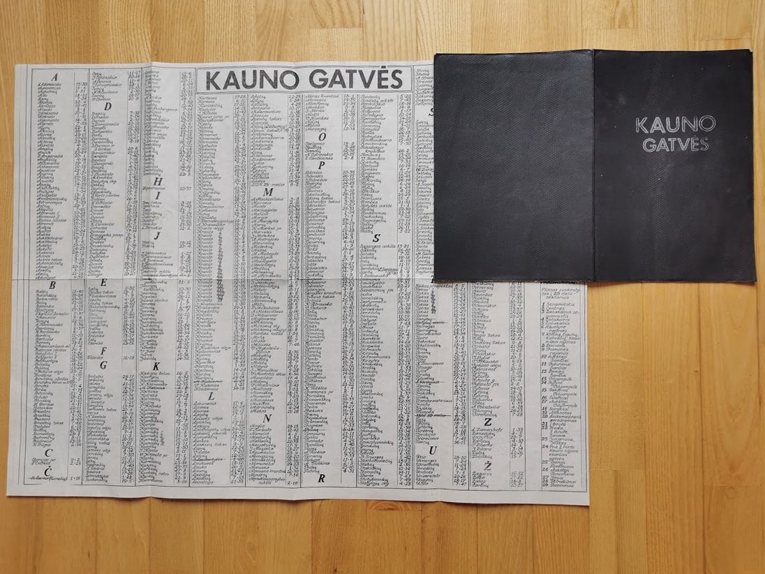 Žemėlapis Kauno gatvės . 1989-1990 m. Suskleisto dydis: 14 x 21 cm. Išskleisto dydis: 41 x 54 cm. Kaina 13