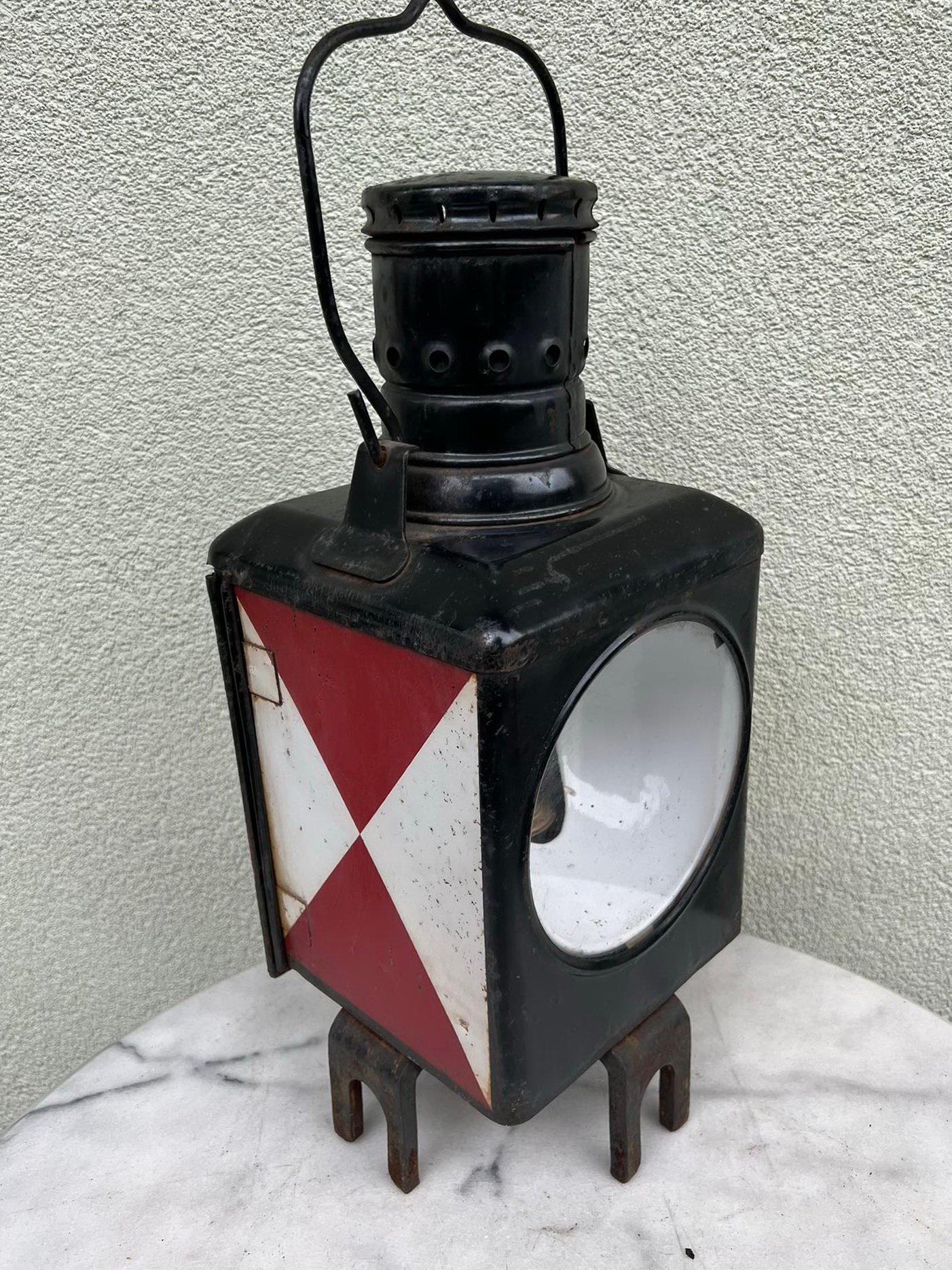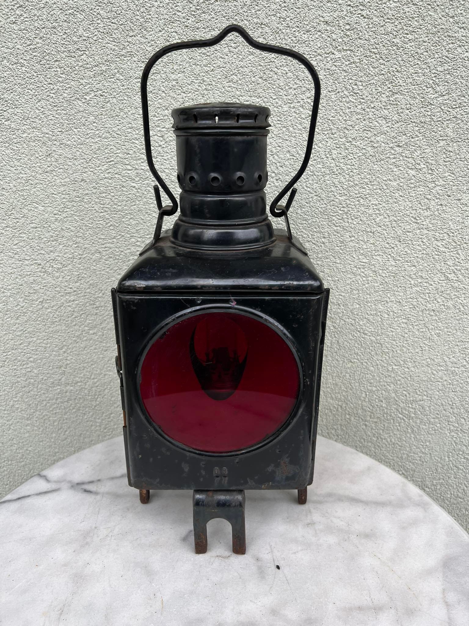 Žibintas geležinkeliečių, žibalinis, antikvarinis. Vokietija. Aukštis be lankelio 47, dydis: 20 x 20 cm. Kaina 133