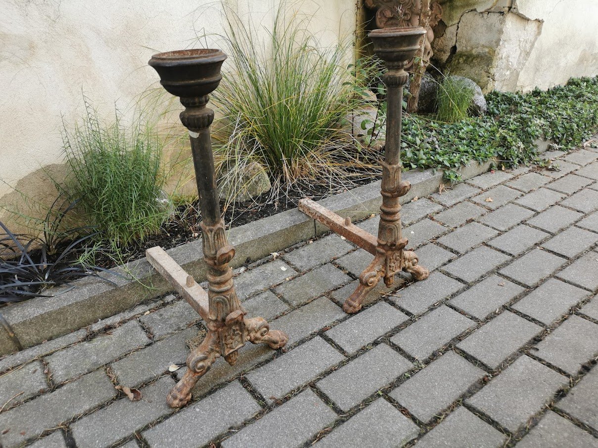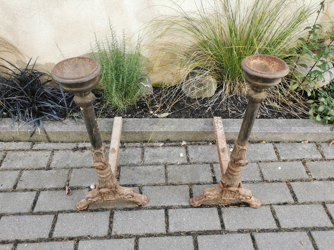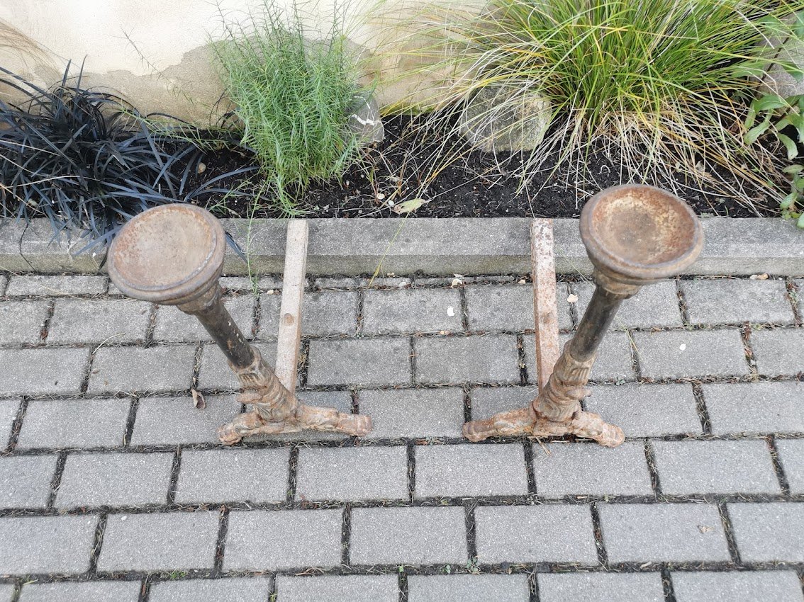 Židinio andironai (fire dogs), antikvariniai. Prancūzija. Priekyje laikikliai iešmams ir viršuje vietos padažo dubenėliams. Kaina 268